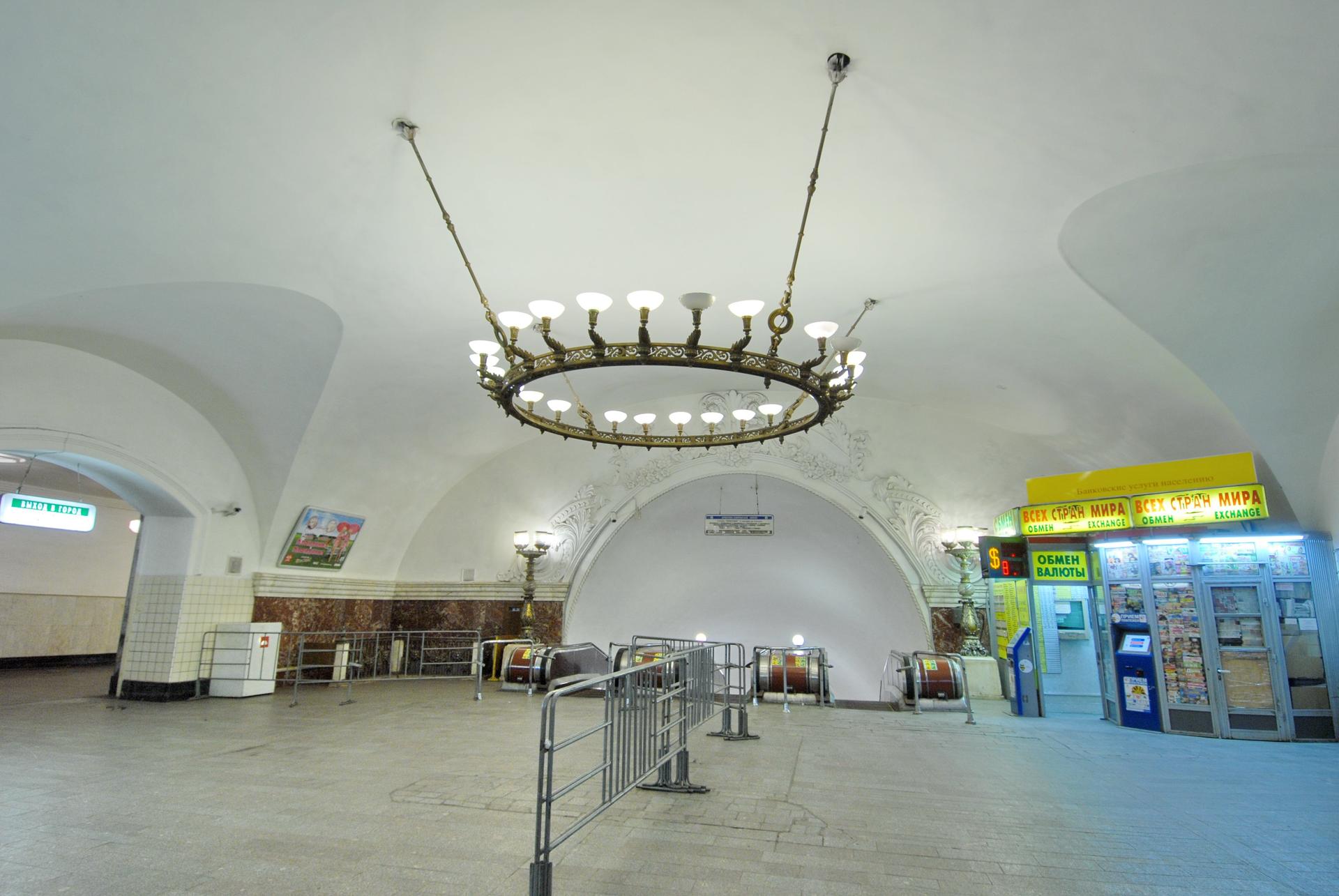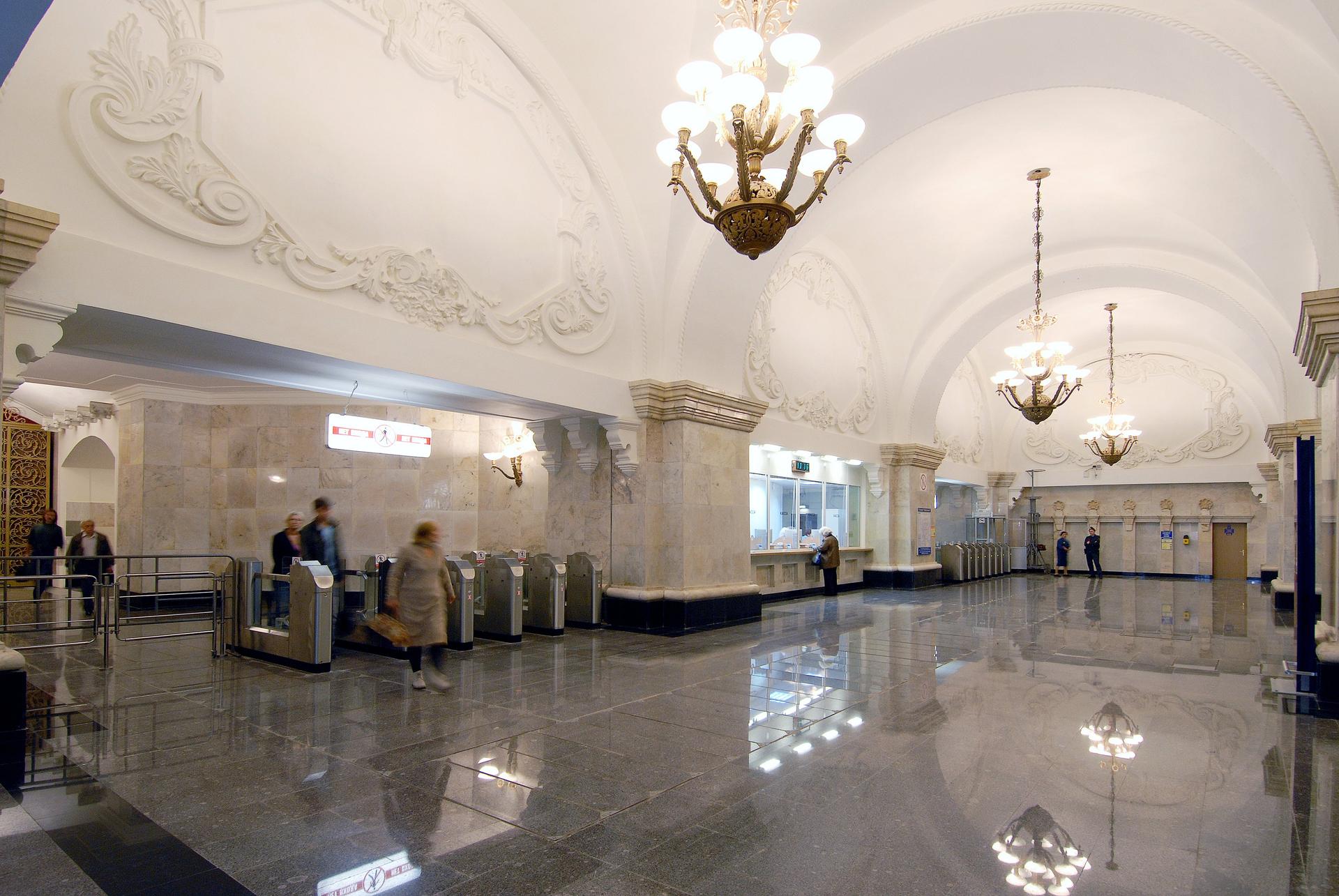 В отделке станции преобладают отштукатуренные элементы. Путевые стены здания в стиле "барокко" покрыты вверху белой, а внизу черной керамической плиткой. Низ пилонов облицован красным мрамором. Примечательно, что в оформлении станции практически отсутствует тема войны, это нехарактерно для станций послевоенного периода. Единственное напоминание о ней – мозаичный парадный портрет И.В. Сталина во весь рост (автор Г.И. Опрышко), который находился на стене напротив эскалаторной арки. В 1955 году в процессе борьбы с культом личности мозаику разобрали. Сейчас это просто белое вертикальное полотно на белой стене.