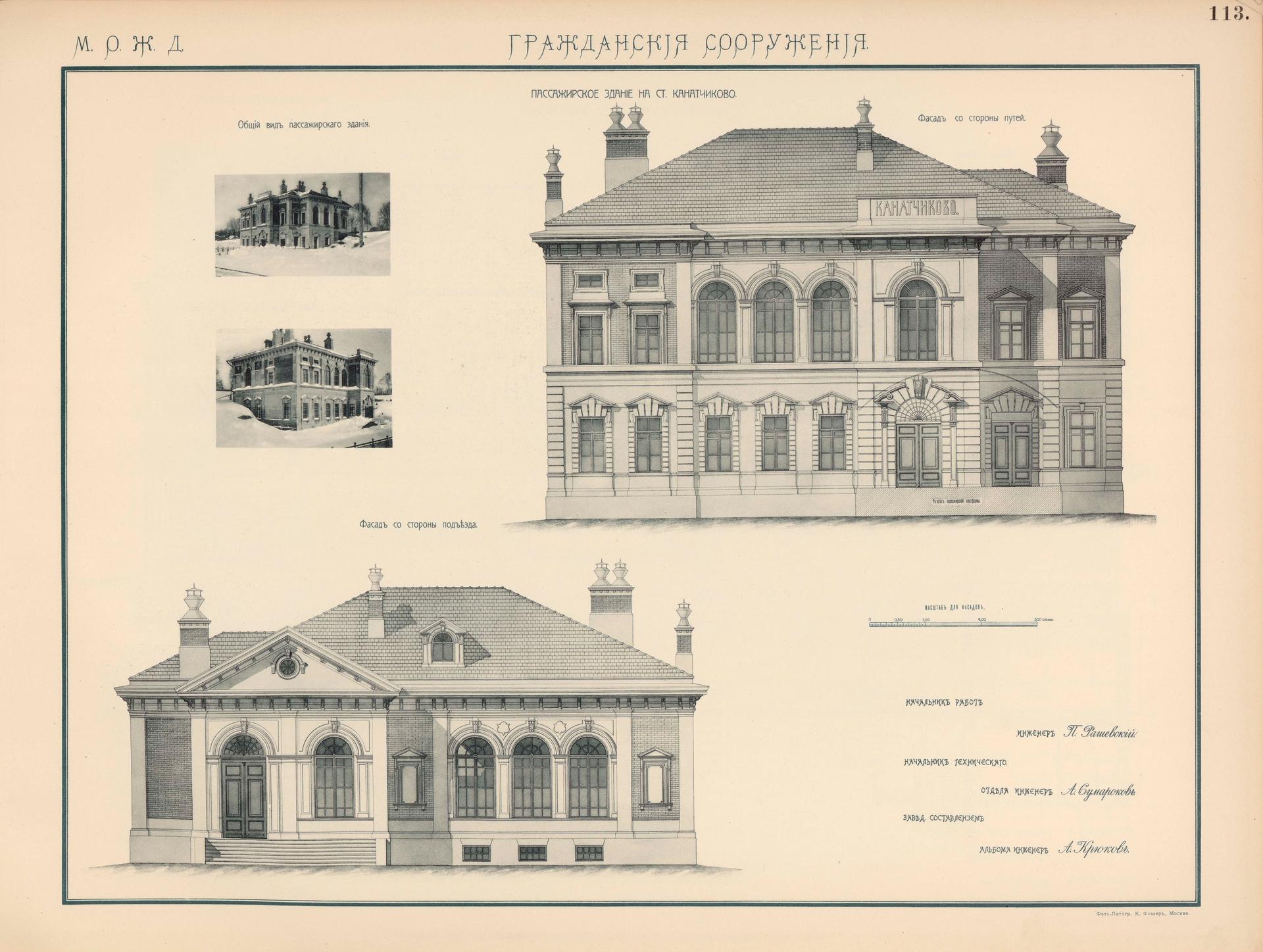 Вокзал станции Канатчиково – это двухэтажное здание с арочными окнами, карнизами и двумя изображениями львиных голов по сторонам от входных дверей. На фасаде можно наблюдать названия станции, выполненные "фирменным" шрифтом Московской Окружной ж/д в стиле "модерн". Над входом сохранилась историческая табличка с указанием высоты станции над уровнем моря – 66,3 саженей, т.е. 132,6 м в современной системе измерения. Имеется в виду уровень Балтийского моря, от которого измерялся уровень расположения всех станций Николаевской ж/д, в том числе и Окружной. "Внутри вокзала было три больших зала – I, II и III классов, сильно отличавшихся друг от друга. В I классе в углу поблескивал огромный иконостас, стояли мягкие диваны в белых полотняных чехлах. Во II классе диваны тоже были, но жесткие, деревянные. В зале III класса совсем не было мебели. Хочешь присесть – садись на пол", – писали сотрудники станции.