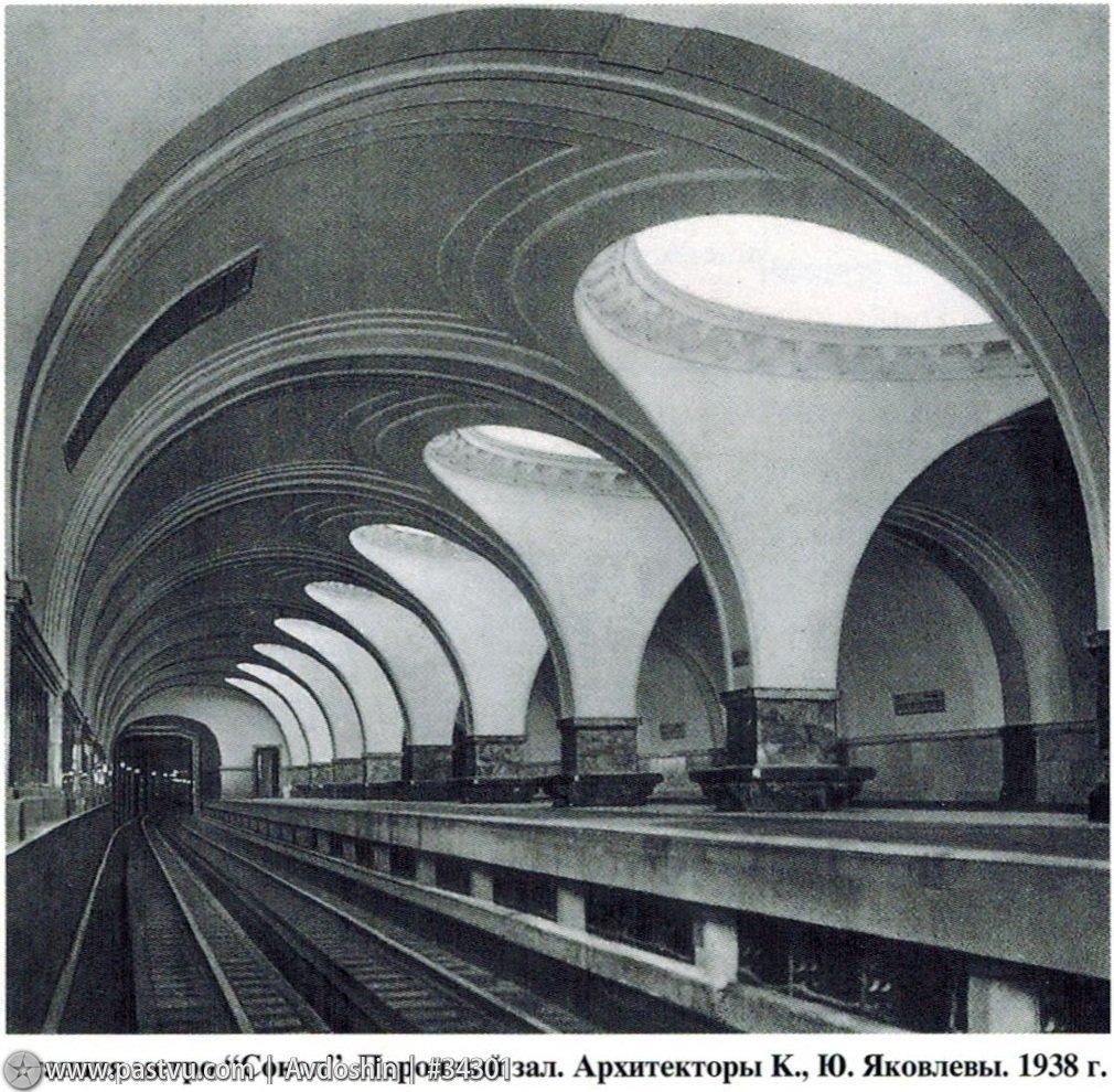 Конструкция, использованная при постройке станции, не характерна для московского метро. Это колонная двухпролетная станция мелкого заложения (10 м.). Перед проектировщиками стояла трудная задача, обусловленная особенностями данной станции. Предполагалось, что пассажиропоток на данной станции будет невелик, в связи с этим платформа была запроектирована небольшой ширины — всего 8 м. У архитекторов было два возможных решения такой станции: односводчатая или с колоннадой по центральной оси. Братья К.Н. и Ю.Н. Яковлевы остановили свой выбор на одноколонном решении. Однако колонны были использованы как цокольные опоры под горизонтальные своды, поставленные на расстоянии 7,4 м. В результате получился перронный зал, представляющий собой два параллельных свода, которые опираются на центральный ряд опор и на боковые стены. Массивные у основания колонны кверху расширяются, а пролеты между опорами превращаются в купола. Такое композиционное решение не делит станцию на две части, а шатрами объединяет ее в одно целое, делает ее законченной и органичной.