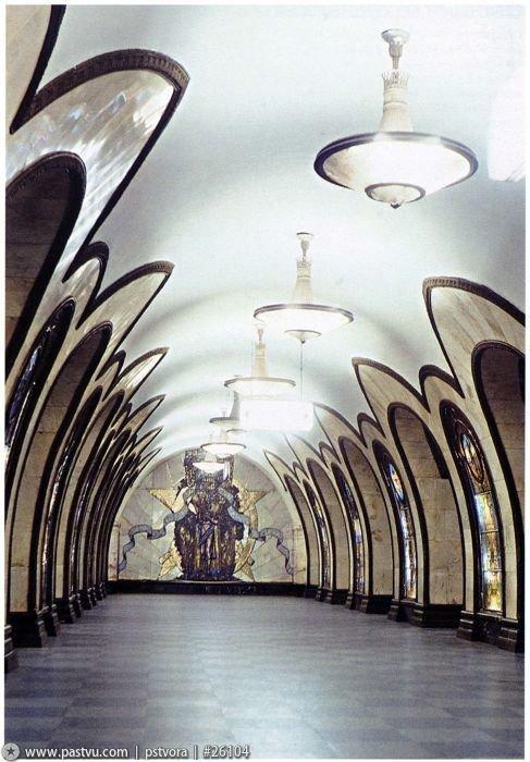 Пилоны станции плавно переходят в своды. В центре каждого пилона находится арочный витраж, подсвеченный изнутри. Благодаря этому пилоны зрительно растворяются в многочисленных арках витражей и арочных проходах к перонным залам. Чередование полуциркульных и килевидных завершений разного размера с латунной окантовкой создает сказочную ритмическую композицию, манящую зрителя к главному украшению – смальтовому панно «Мир во всем мире» на торцевой стене. Оно создано художником Павлом Кориным и изображает мать с младенцем, который тянет руки к голубю. Изначально, правда, вместо этого голубя был медальон с изображением Сталина. Мозаика эта чудом сохранилась до наших дней. По указанию Хрущева решено было всю композицию демонтировать. Но её сохранили, поставив перед ней стену, облицованную гранитом. Таким образом мать с младенцем на руках пребывала в «замурованном» состоянии несколько лет, пока к власти не пришел Л.И. Брежнев.