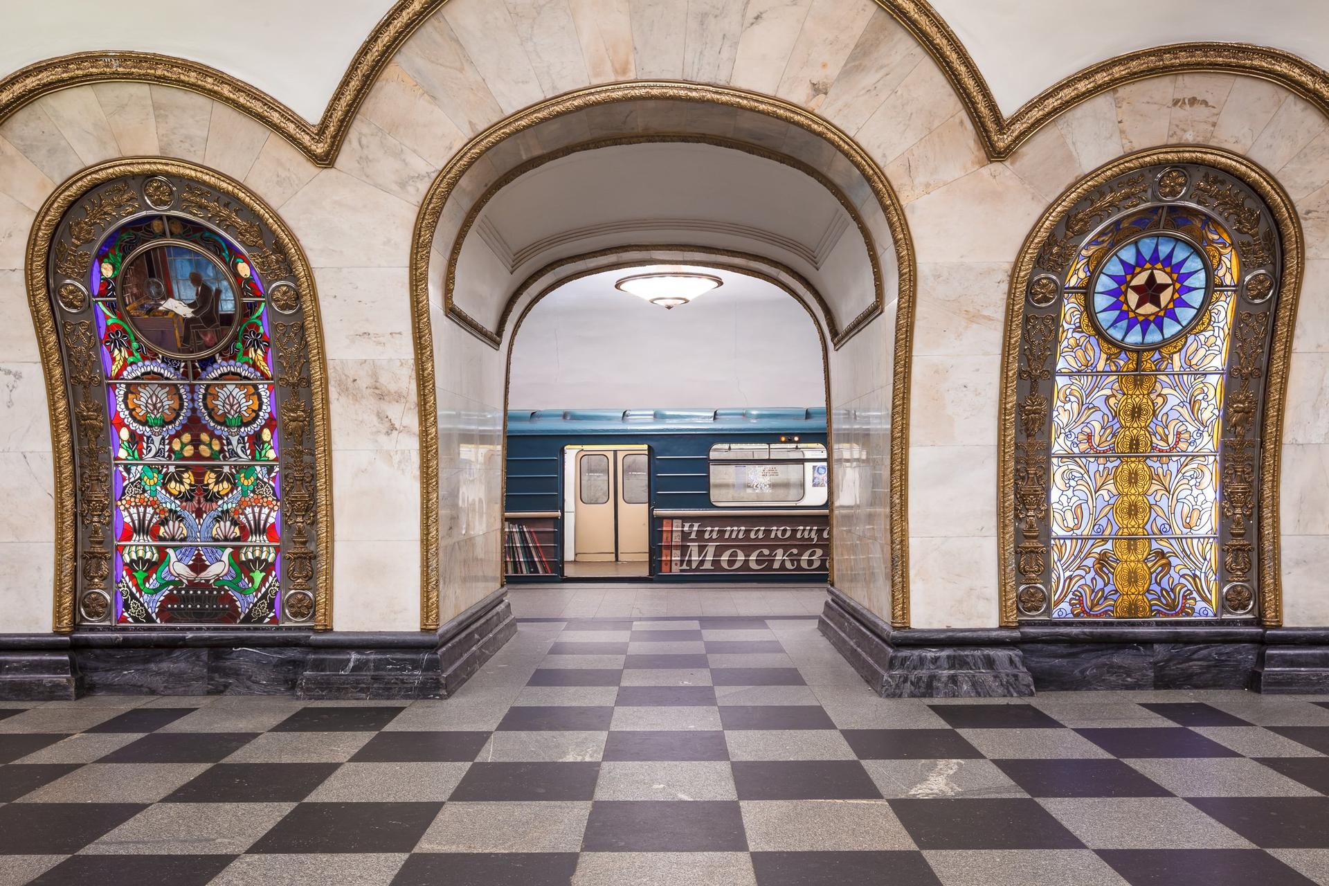 «Новослободская» – пилонная станция глубокого заложения. Казалось бы, такая конструктивная система (использование тяжелых пилонов, а не изящных колонн) сама диктует архитекторам будущий облик – торжественно строгий и даже суровый. Но в данном случае проектировщики сумели создать легкое пространство, уводящее зрителя (то есть обычного пассажира метро) в свой сказочный мир.