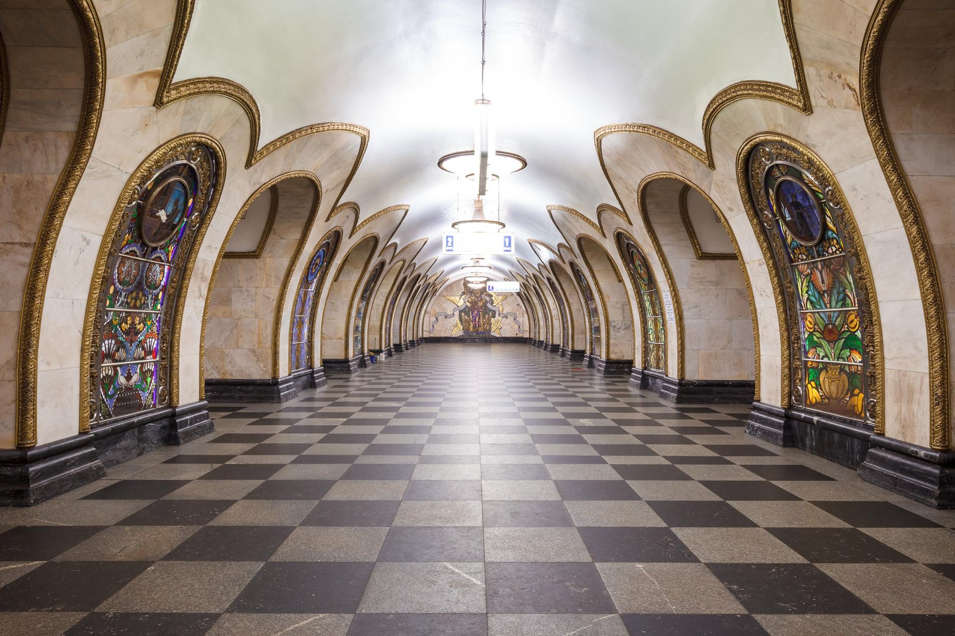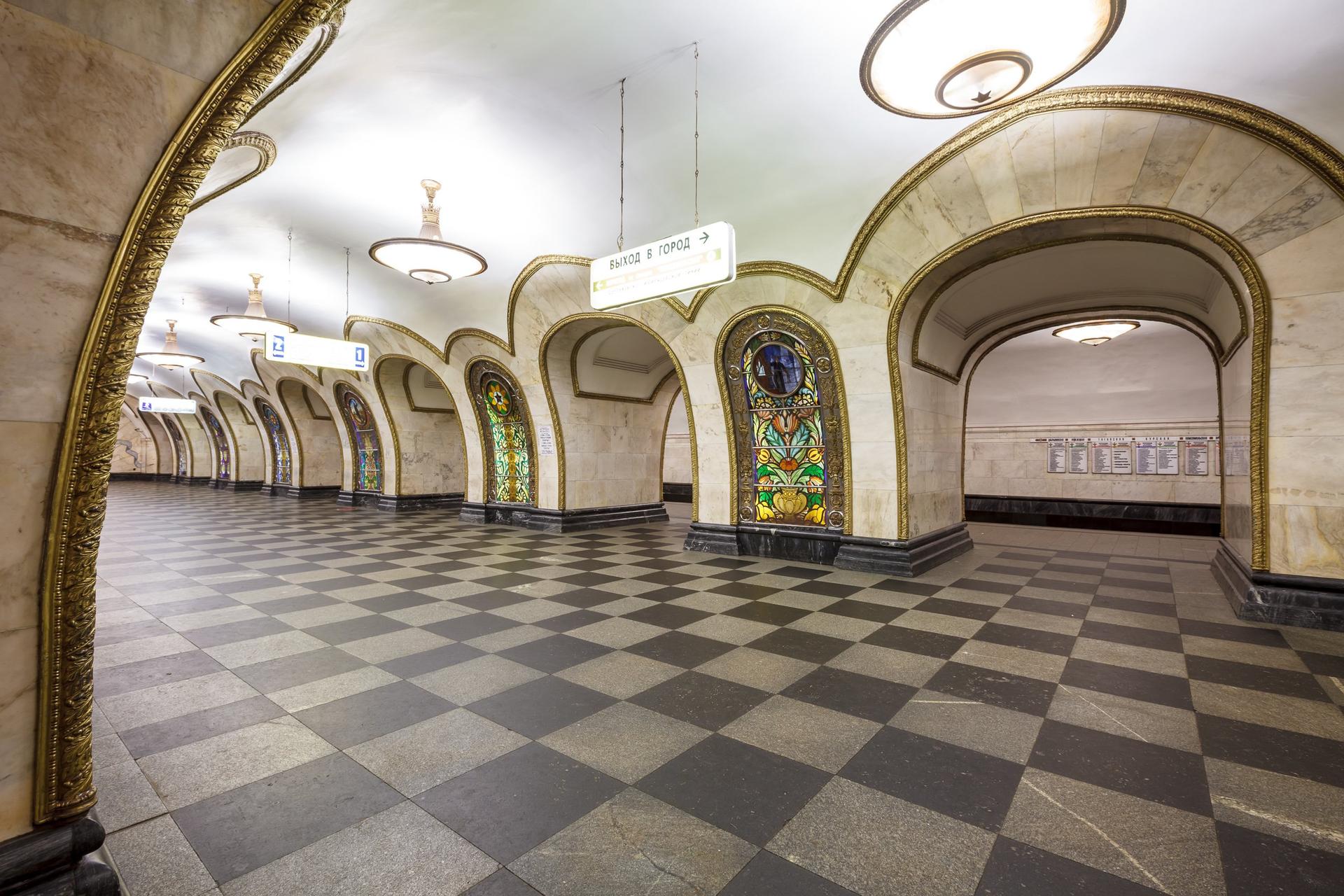 Пилоны станции плавно переходят в своды. В центре каждого пилона находится арочный витраж, подсвеченный изнутри. Благодаря этому пилоны зрительно растворяются в многочисленных арках витражей и арочных проходах к перонным залам. Чередование полуциркульных и килевидных завершений разного размера с латунной окантовкой создает сказочную ритмическую композицию, манящую зрителя к главному украшению – смальтовому панно «Мир во всем мире» на торцевой стене. Оно создано художником Павлом Кориным и изображает мать с младенцем, который тянет руки к голубю. Изначально, правда, вместо этого голубя был медальон с изображением Сталина. Мозаика эта чудом сохранилась до наших дней. По указанию Хрущева решено было всю композицию демонтировать. Но её сохранили, поставив перед ней стену, облицованную гранитом. Таким образом мать с младенцем на руках пребывала в «замурованном» состоянии несколько лет, пока к власти не пришел Л.И. Брежнев.