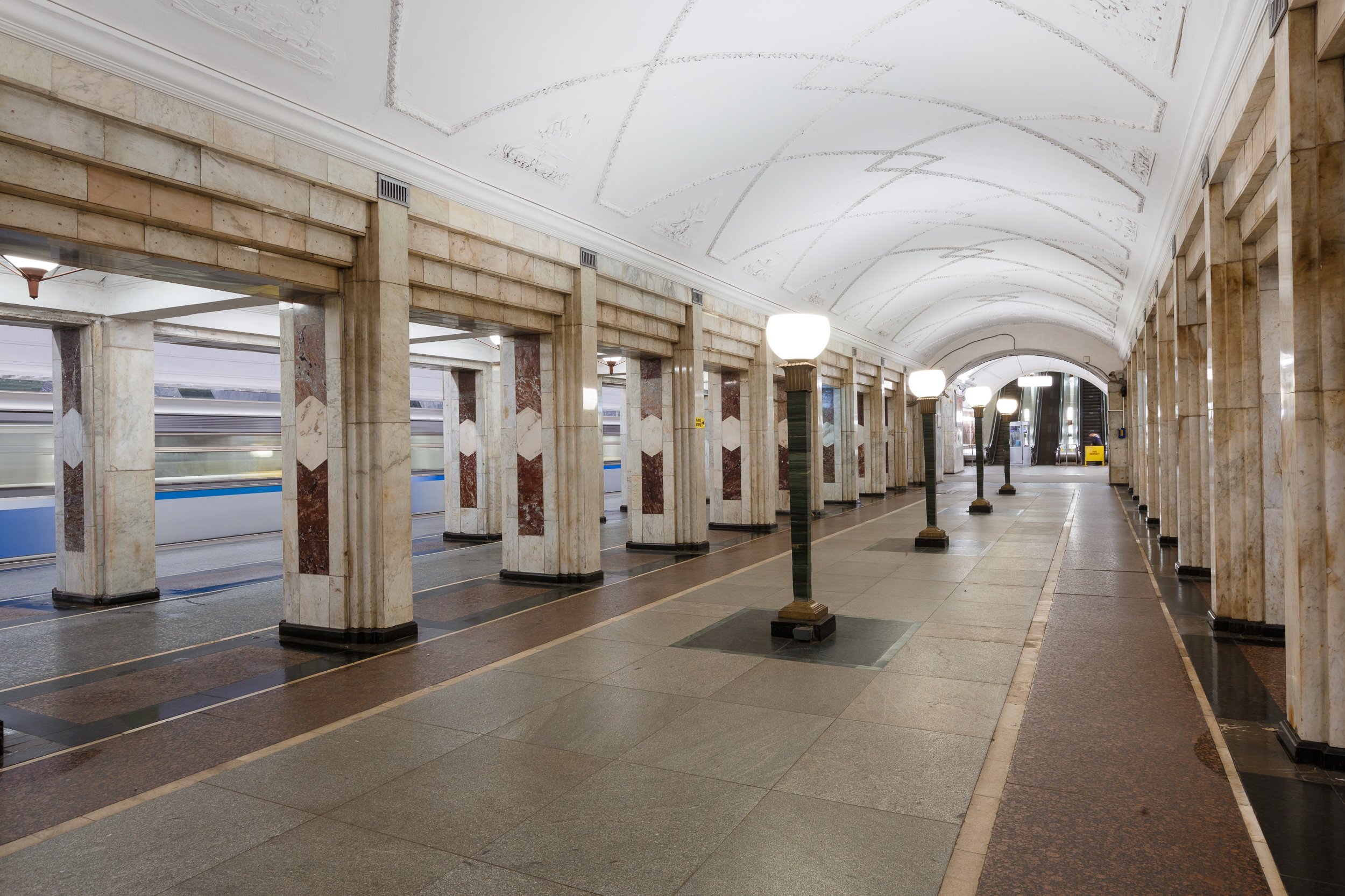 Очень интересно здесь решена задача освещенности. Вместо люстр или настенных бра Кравец ставит по центральной оси пассажирского зала светильники на торшерах. Они квадратного сечения и слегка расширяются к верху. Торшеры эти сделаны из зеленого мрамора, их основание – из бронзы, а светильники имели форму перевернутой пирамиды. К сожалению, сейчас они полусферической формы, что противоречит замыслу автора.