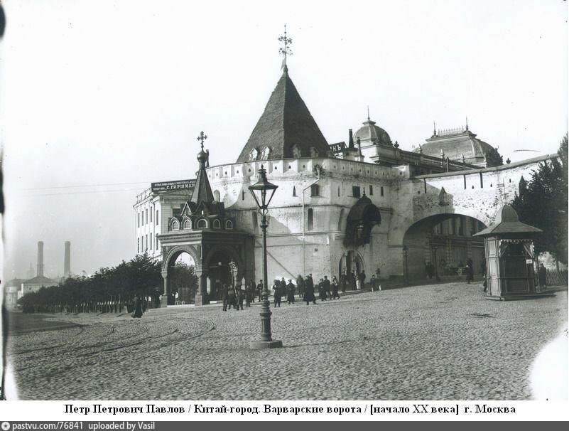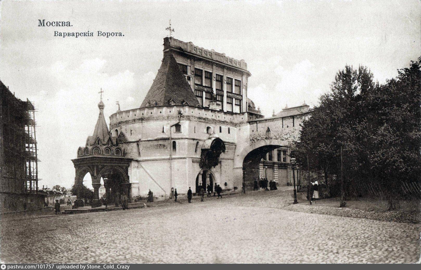Варварская башня была одной из самых мощных в укреплениях Китай-города. Будучи проездной, она первоначально имела ворота с въездом, находившимся с боковой правой стороны. Подобный «заворот» позволял обороняющимся отражать нападение даже после уничтожения самих воротных полотен. Вдоль основания башни имелись подземные «слухи» - галереи, призванные предотвратить подкопы. В XVII-XVIII веках в конструкцию башни и прилегающей стены были внесены изменения. На башне появился шатровый верх, а рядом с ней, для проезда, в стене была создана широкая арка. Над Варварскими воротами Китай-города был помещен список с Боголюбской иконы Божьей Матери. Именно в этом месте начались драматические события «чумного бунта» 1771 г., в результате которых толпа растерзала московского архиепископа Амвросия, запретившего молебны у Варварских ворот. В 1880 г. внутри Варварской башни была создана часовня, а с внешней стороны архитектор Н.В. Никитин выстроил шатровое крыльцо.