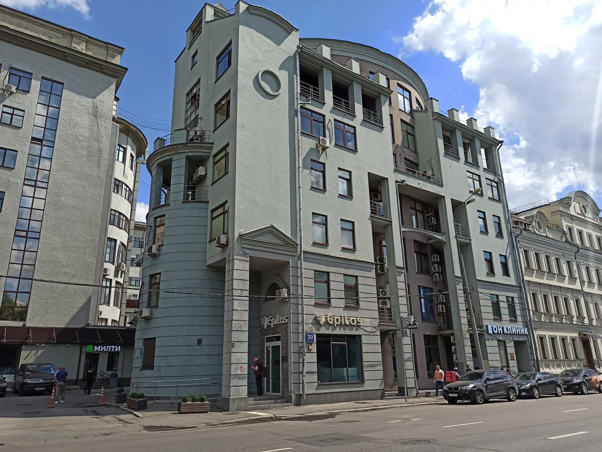 Типография имеет трехчастную структура с круглой угловой башней, типичной для конструктивизма. Очевидно нелепый ионический карниз был добавлен в проект уже позднее, во время строительства – что является приметой эпохи: когда здания проектировались в 1920 годы, а строились в 1930 годы. Сейчас здание занимает издательство «Литературная Россия».