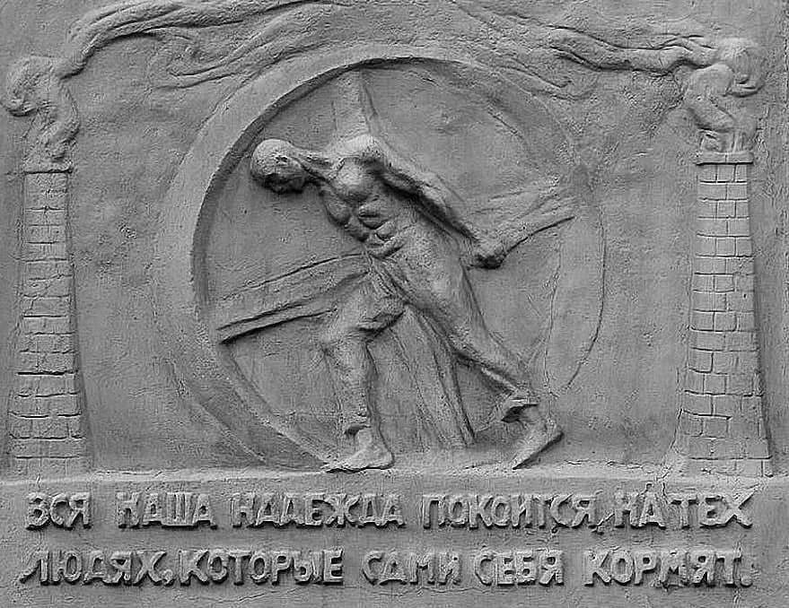В 1918-1920 годы в рамках ленинского плана монументальной пропаганды на доме появились барельефы, один из которых сохранился до сих пор. На нем изображены заводские трубы и рабочий, толкающий колесо. А надпись под барельефом гласит: «Вся наша надежда покоится на тех людях, которые сами себя кормят».