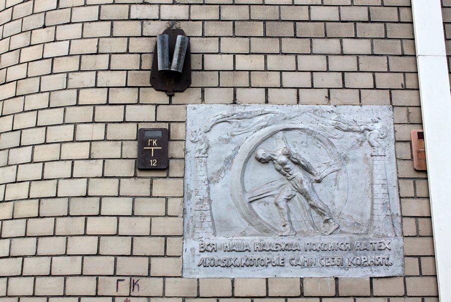 В 1918-1920 годы в рамках ленинского плана монументальной пропаганды на доме появились барельефы, один из которых сохранился до сих пор. На нем изображены заводские трубы и рабочий, толкающий колесо. А надпись под барельефом гласит: «Вся наша надежда покоится на тех людях, которые сами себя кормят».