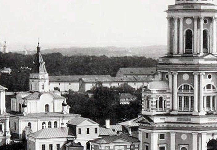 В 1828 г. Строгановская усадьба переходит к купцам Алексеевым, которые переделывают эти постройки под золотоканительную фабрику. К 1830-м гг. два одноэтажных корпуса были надстроены вторыми этажами, рядом с ними появляется еще здание, позже соединенное деревянной встройкой с одним из корпусов XVIII в. В 1850-е гг. деревянную встройку заменили каменной, в итоге из двух изначальных корпусов XVIII в. получилось одно протяженное здание длиной 120 м. В те годы, помимо прядильного цеха золотоканительной фабрики, здесь располагались кухня и прочие вспомогательные помещения. Первая известная фотография, запечатлевшая корпуса фабрики, сделана в 1882 г. Это вид Андроникова монастыря из альбома Найденова, снятый с церкви С. Радонежского в Рогожской слободе. По фотографии видно, что корпуса фабрики фактически не имеют декора, маленькие окна на фасадах расположены редко, через каждые 5-7 м. В конце XIX в. участок с усадьбой Строгановых-Алексеевых перешел московской таможне. В бывших фабричных корпусах расположились таможенные склады, которые просуществовали здесь вплоть до 1920-х гг. В 1930-е гг. началась реконструкция зданий под административные нужды, которая закончилась уже после войны, в конце 1940-х гг. Длинный корпус надстроен третьим этажом, появился декор в стиле классицизм. Чуть левее центра фасада с южной стороны (что соответствует встройке между двумя изначальными корпусами) появился ризалит, имеющий портик со спаренными колоннами коринфского ордера и треугольным фронтоном. На северном фасаде в этой же части здания тоже портик с фронтоном, но уже без выступающего ризалита. Торцы здания получили по четыре полуколонны, треугольные сандрики в качестве наличников над окнами второго этажа, рустовку и арочные ниши на первом этаже. Длинные южный и северный фасады украшены ритмом вертикальных лопаток в простенках между окнами и замковыми камнями над окнами второго этажа. На фоторазвертке, сделанной в 1947-1950 гг., южный ризалит с портиком находятся в строительных лесах, видимо, еще проводятся отделочные работы.
