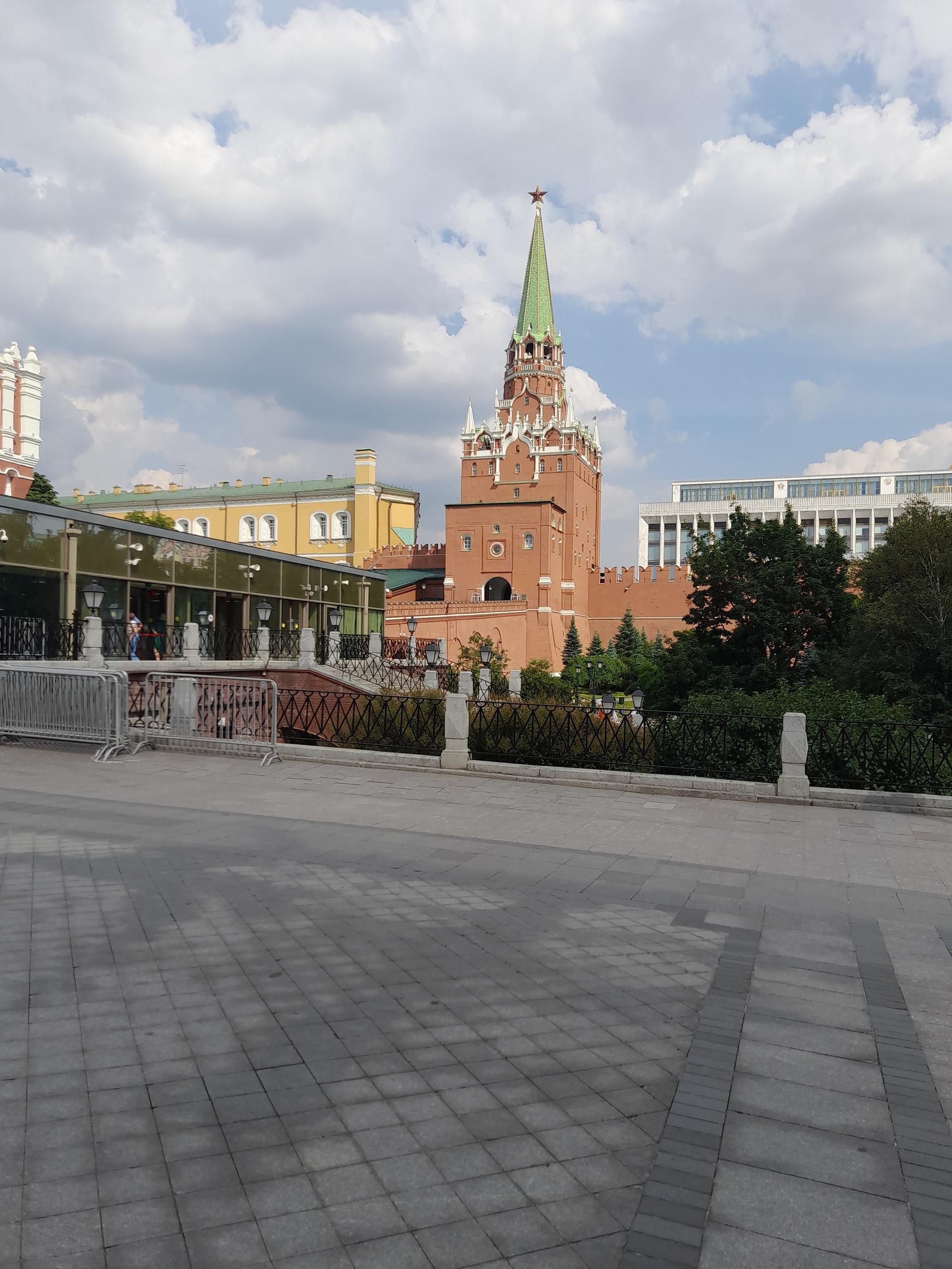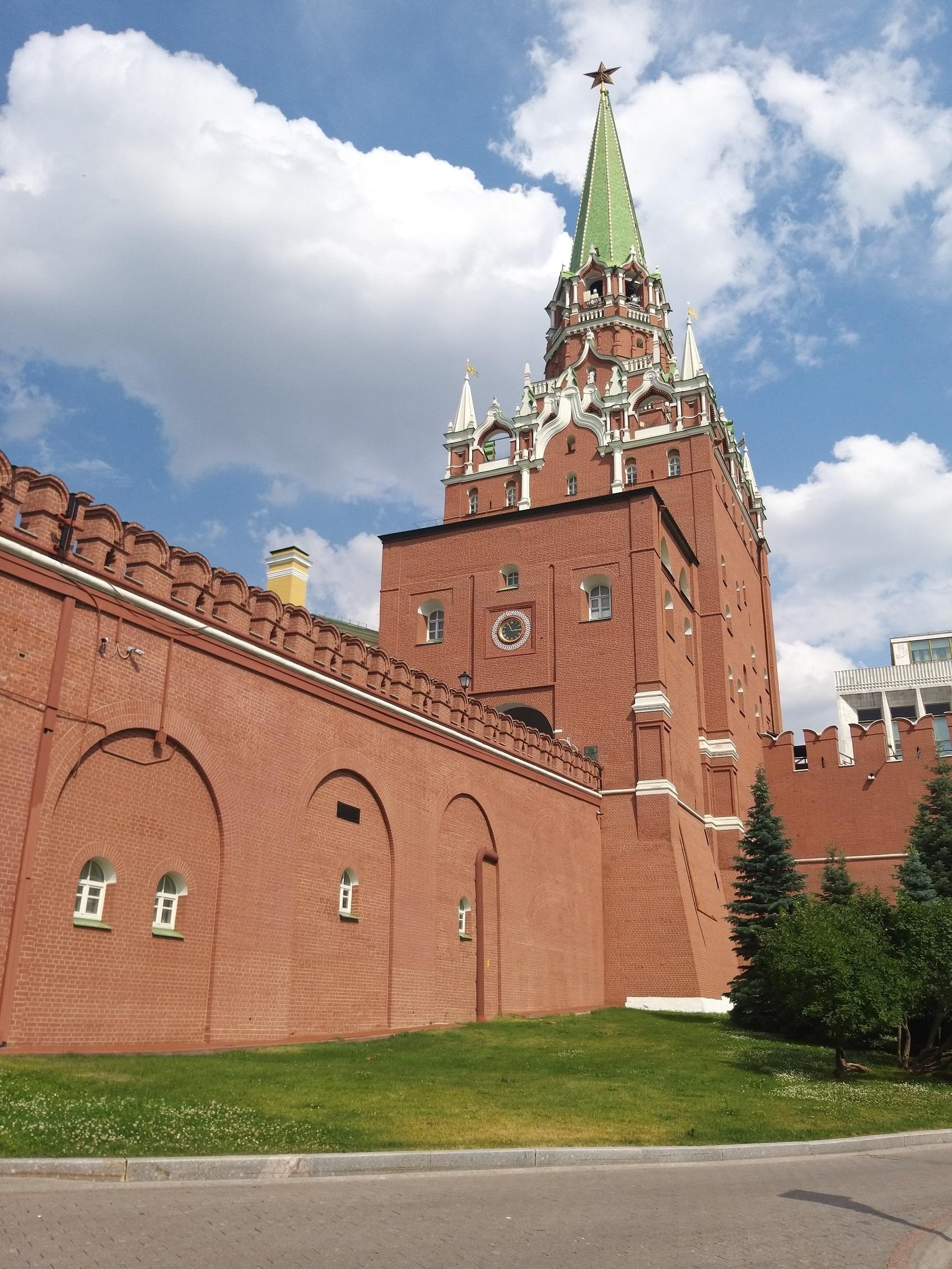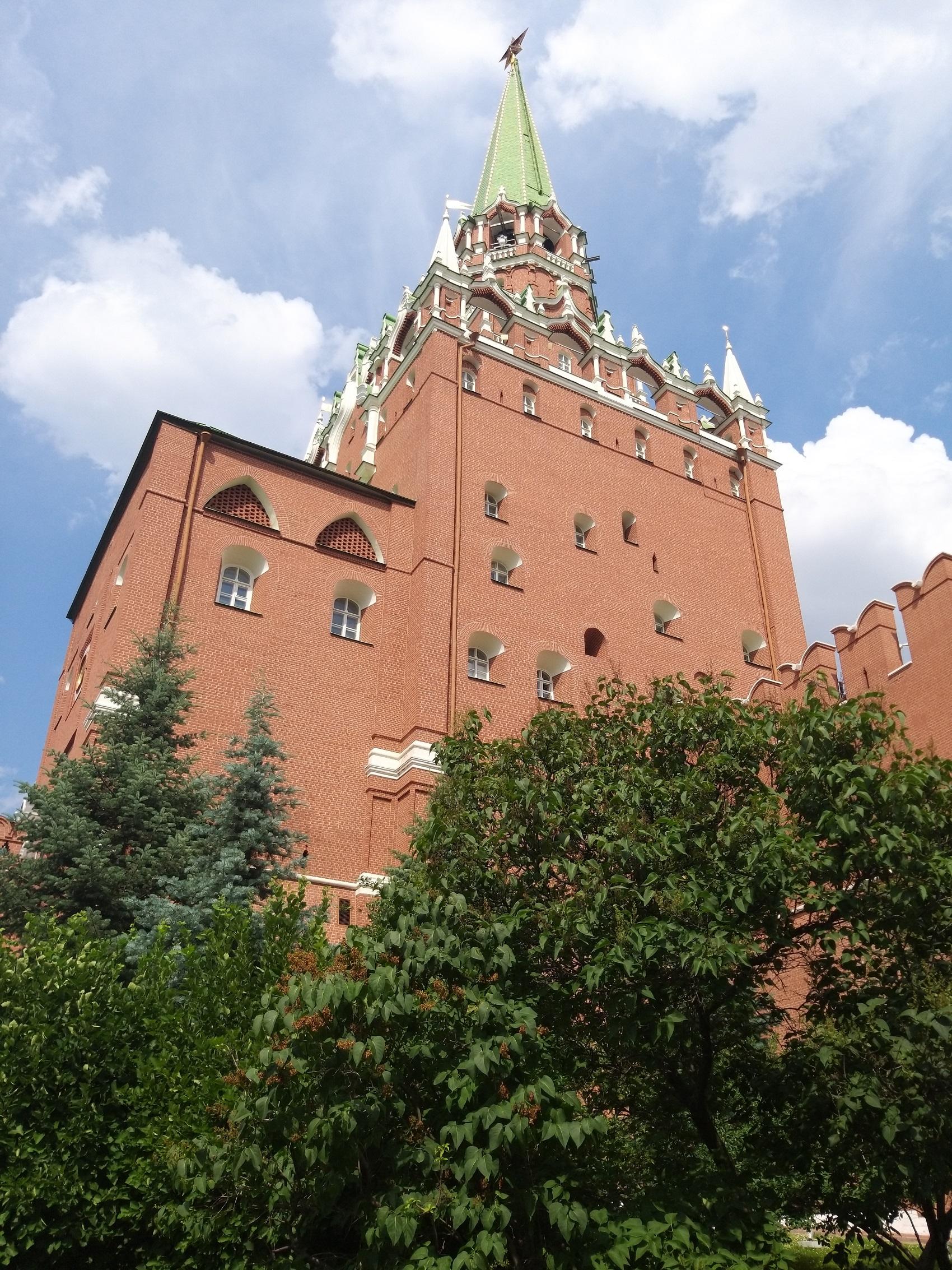 Троицкая башня - проездная, с отводной стрельницей, - главная на западной стороне Кремля. Ее строительство в 1495-1499 годах архитектором Алевизом Фрязиным завершило возведение укреплений со стороны реки Неглинной, позднее Александровского сада. В 1516 году от Троицкой башни через реку Неглинную был построен каменный Троицкий мост, а за ним сооружена башня Кутафья. В XVI-XVII веках Троицкие ворота считались вторыми по значению после Спасских - они служили для проезда в Кремль ко дворам патриарха, цариц и царевен.