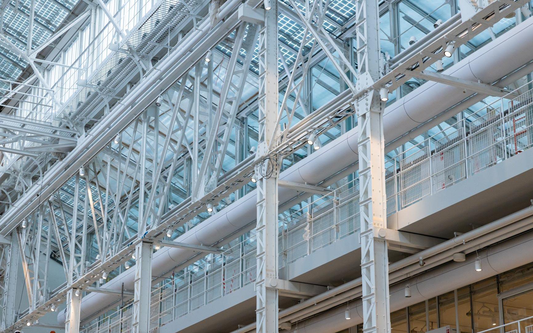 Особое внимание уделено экологической составляющей проекта. Воссозданные трубы ГЭС-2 высотой 70 метров теперь используются для забора и очистки воздуха. В здании установлена система сбора и очистки дождевой воды, которая используется для технических нужд и орошения растений.