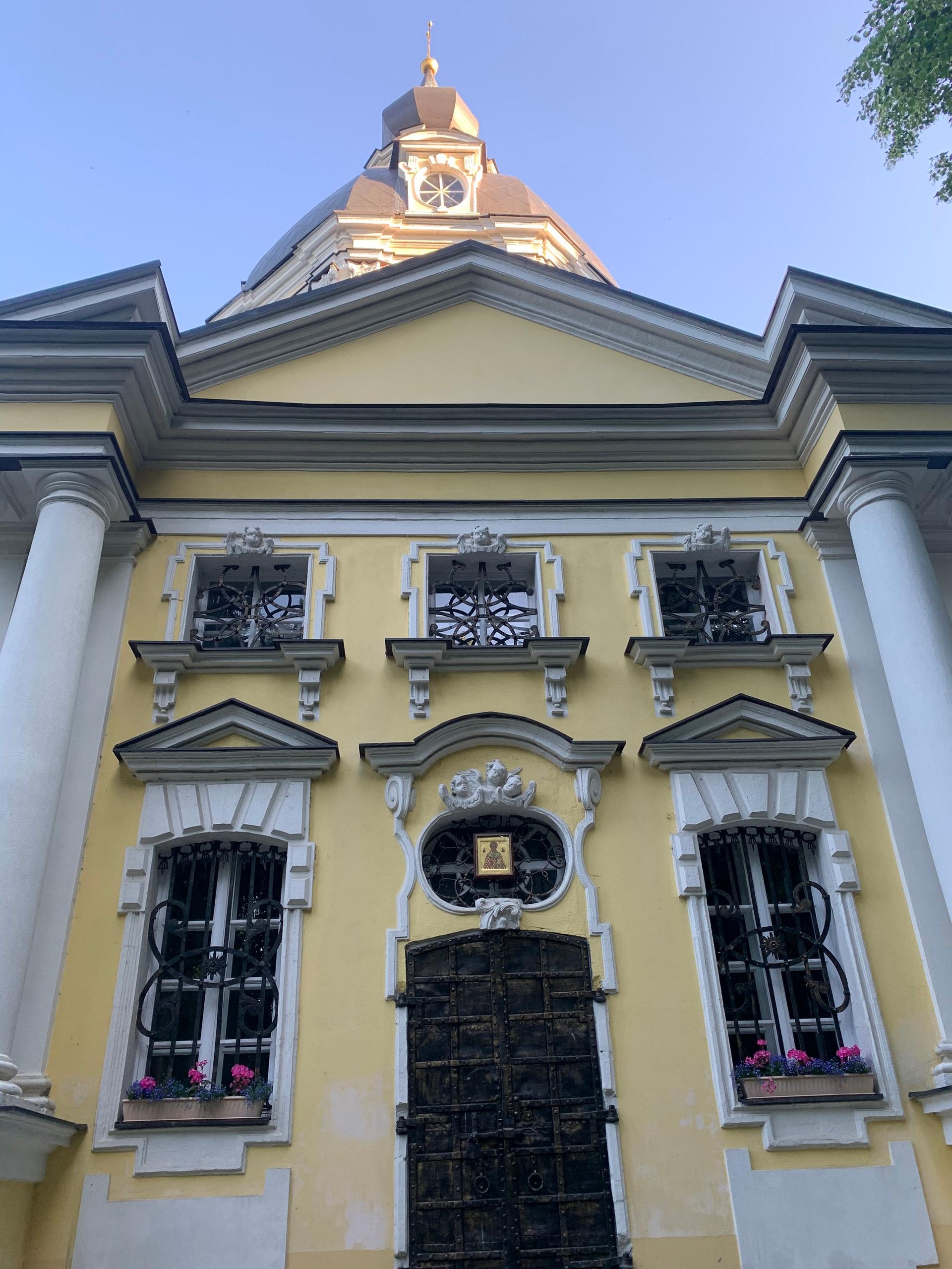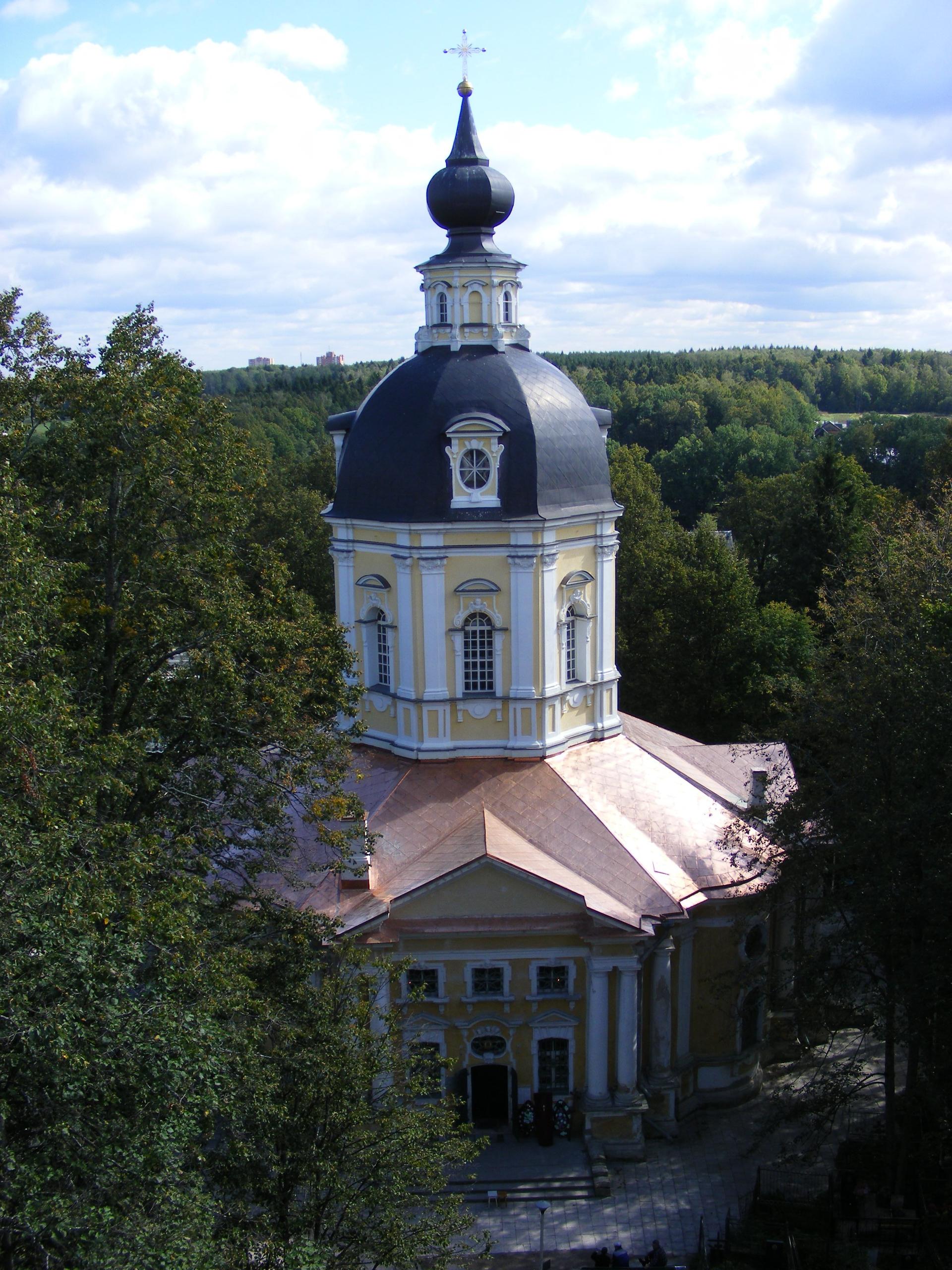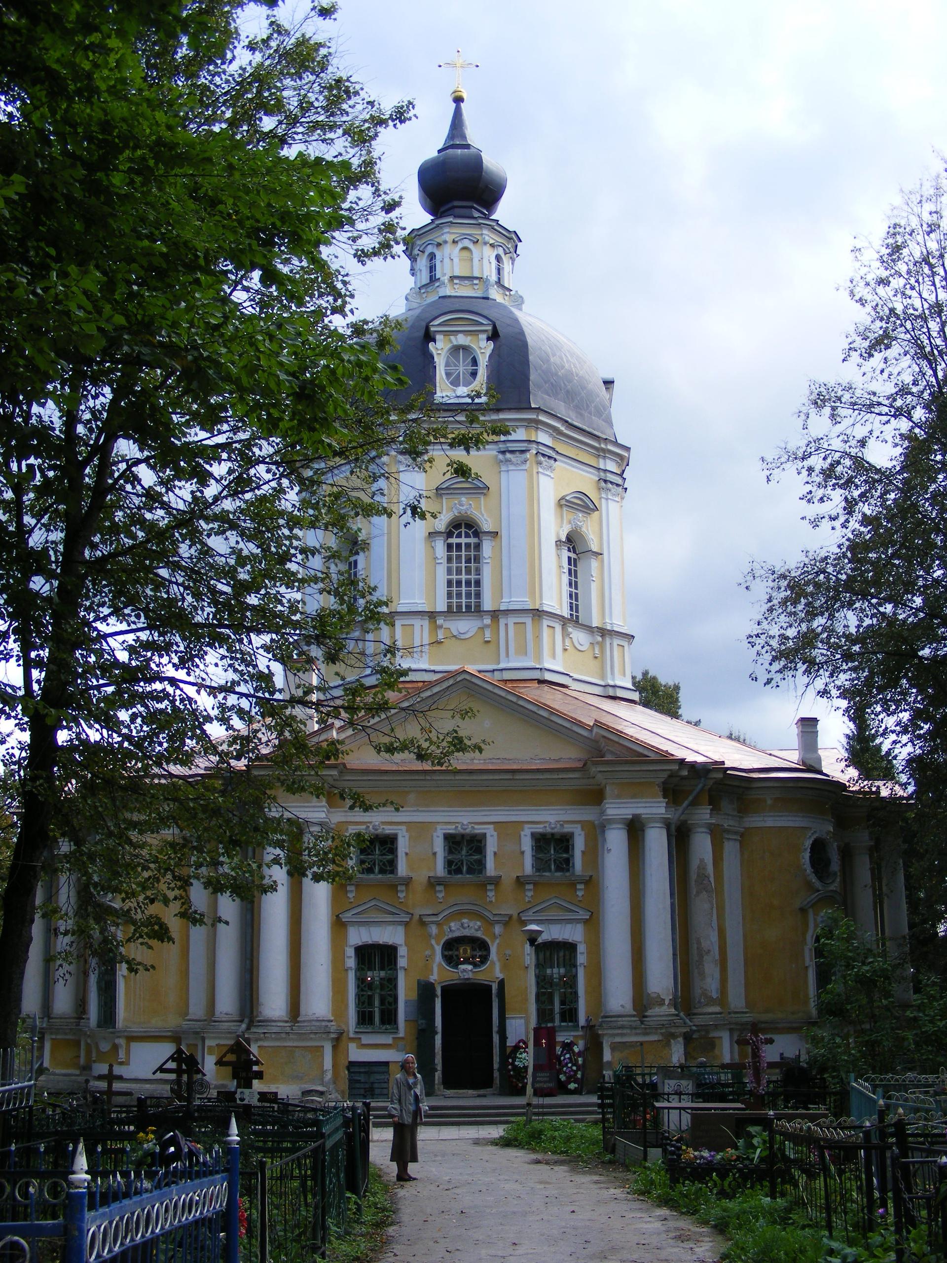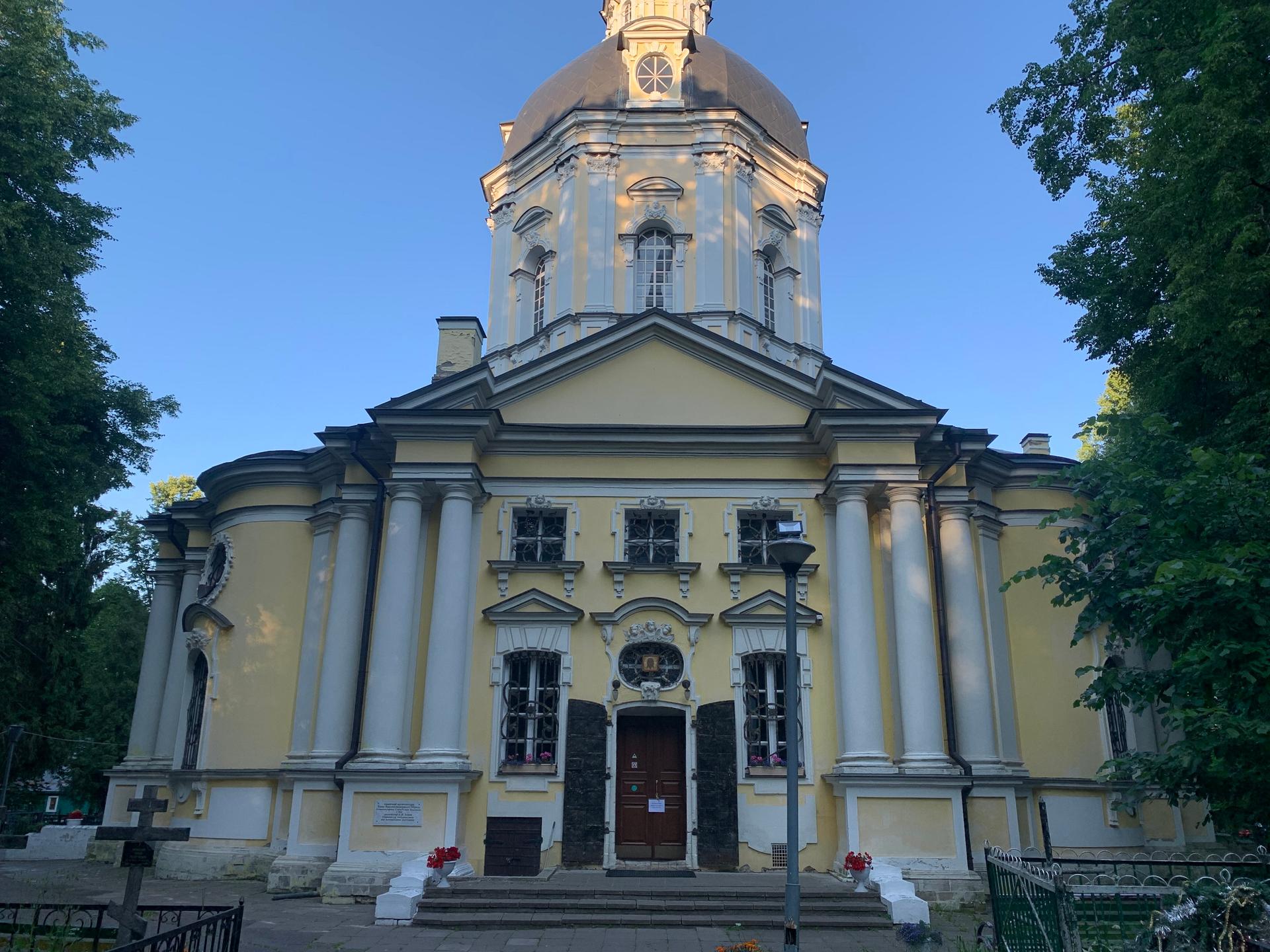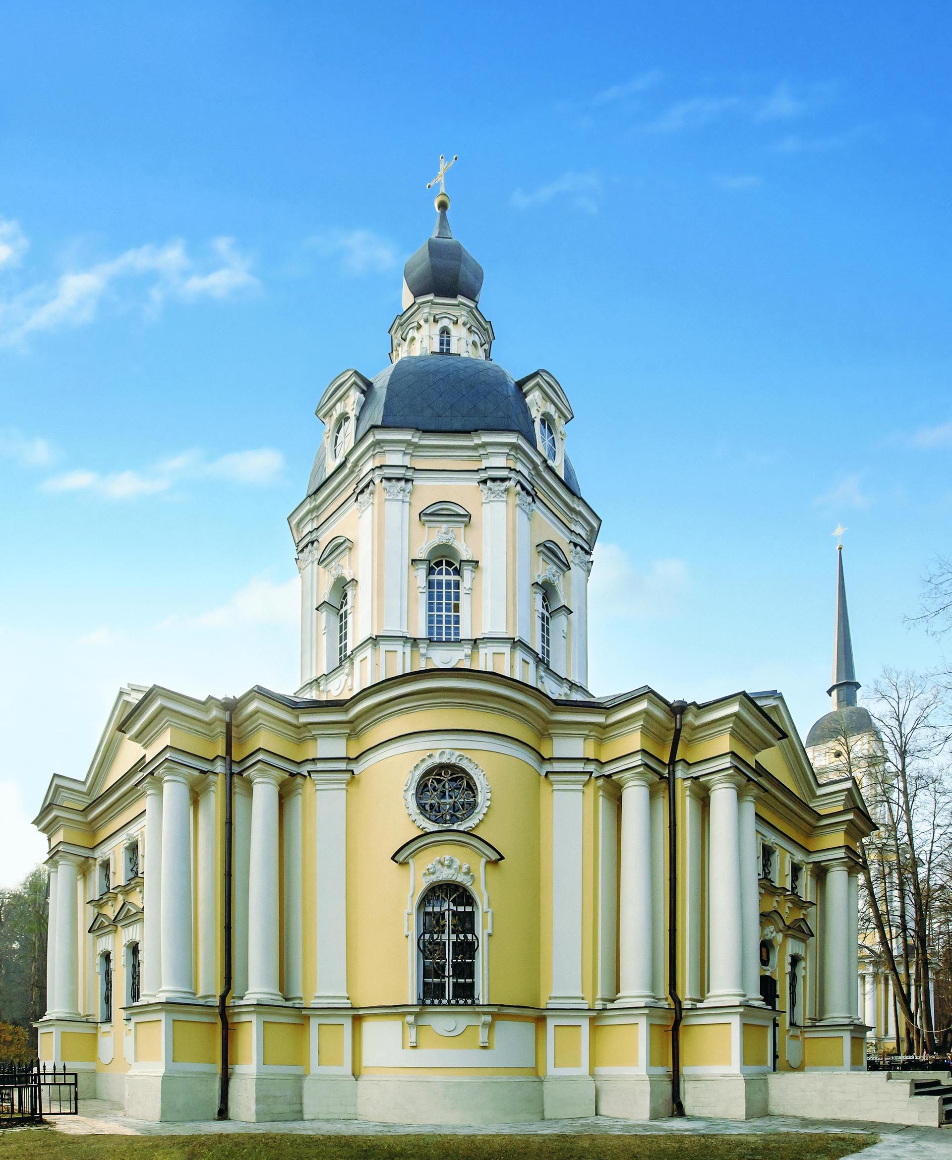 Этот храм одна из ярких страниц в истории русского зодчества. Каменная однокупольная центрическая церковь авторства К.И. Бланка является замечательным образцом елизаветинского барокко. Отдельно стоящая колокольня высотой 62 метра сама по себе уникальный памятник архитектуры, гармонично завершающий храмовый комплекс и одновременно связывающий его с ландшафтом местности.