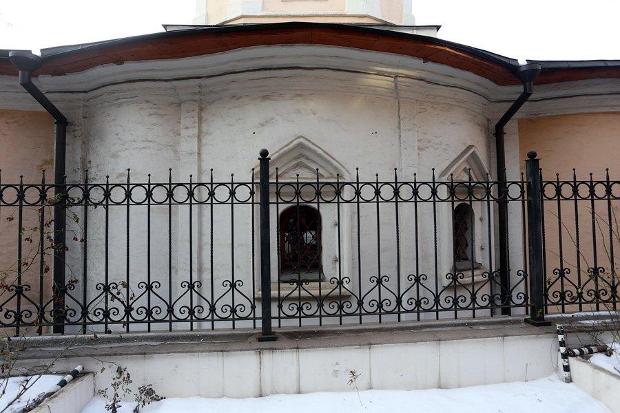 Сергиевская церковь невелика, она стоит под углом к Крапивенскому переулку и далеко выдаётся на проезжую часть своей колокольней. Такое расположение говорит нам о древности храма. Самая старая часть церкви – небольшой по площади четверик, построенный в камне в 1678 году. С севера, юга и запада он окружён более поздними пристройками. Только восточная стена его не была ничем застроена. Здесь мы можем увидеть алтарную апсиду, наличники окон, старый карниз. Каким было первоначальное завершение кубического здания, точно не известно. Скорее всего, церковь была одноглавой.