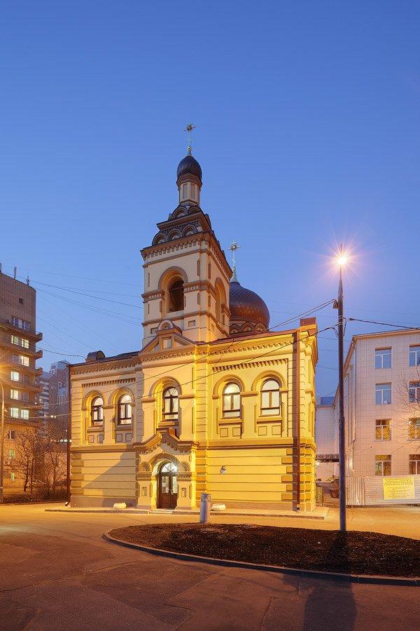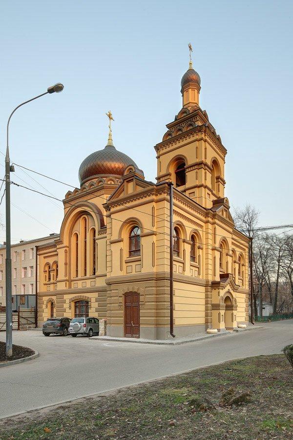 После расширения территории в 1890 году за счет соседнего со щербатовским участка Коншиной появилось место для строительства амбулатории и церкви. Этим же годом датированы соответствующие проекты Каминского. Проект внутреннего убранства и росписи храма, как и в других своих постройках, разрабатывал сам архитектор.