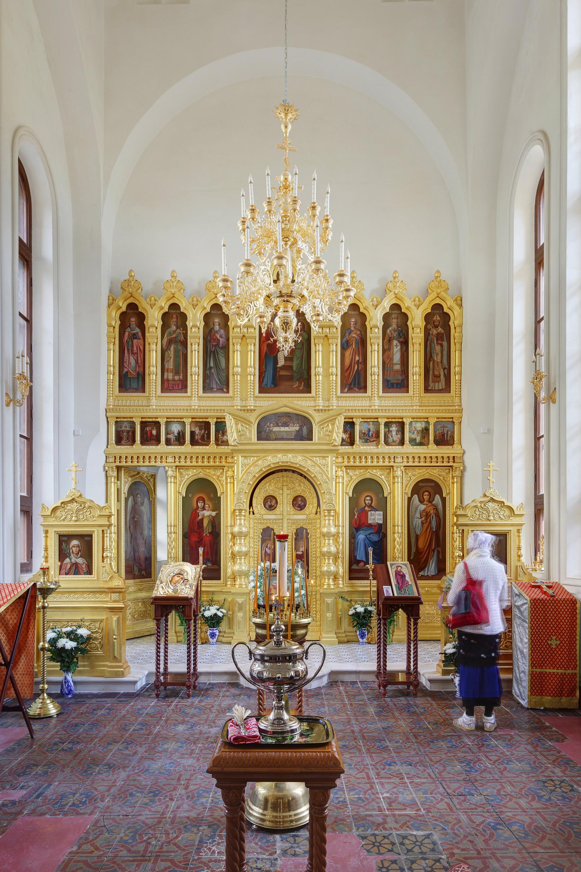 Выполнен и большой объем работ по интерьерам. По сводам и верхним частям стен второго этажа проведено исследование на наличие закрашенных декоративных росписей. Фрагменты росписей сохранились только в подпружных арках между трапезной, четвериком и алтарем. все они расчищены и законсервированы. По сводам произведена вычинка и восстановлено их штукатурное покрытие (в местах, где живопись утрачена). Удалено также позднее покрытие пола. Под ним была обнаружена подлинная полихромная плитка, выполненная по рисункам А.С.Каминского. Плитка сохранилась в большом объеме, но с многочисленными сколами и утратами. все подлинные фрагменты сохранены, утраченные места затерты и окрашены в тон. Иконостас изготовлен по отдельному проекту по архивной фотографии.
