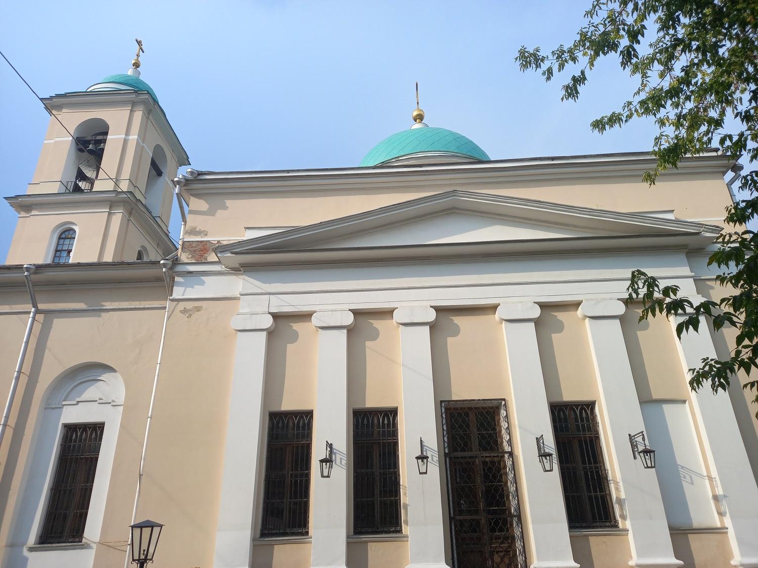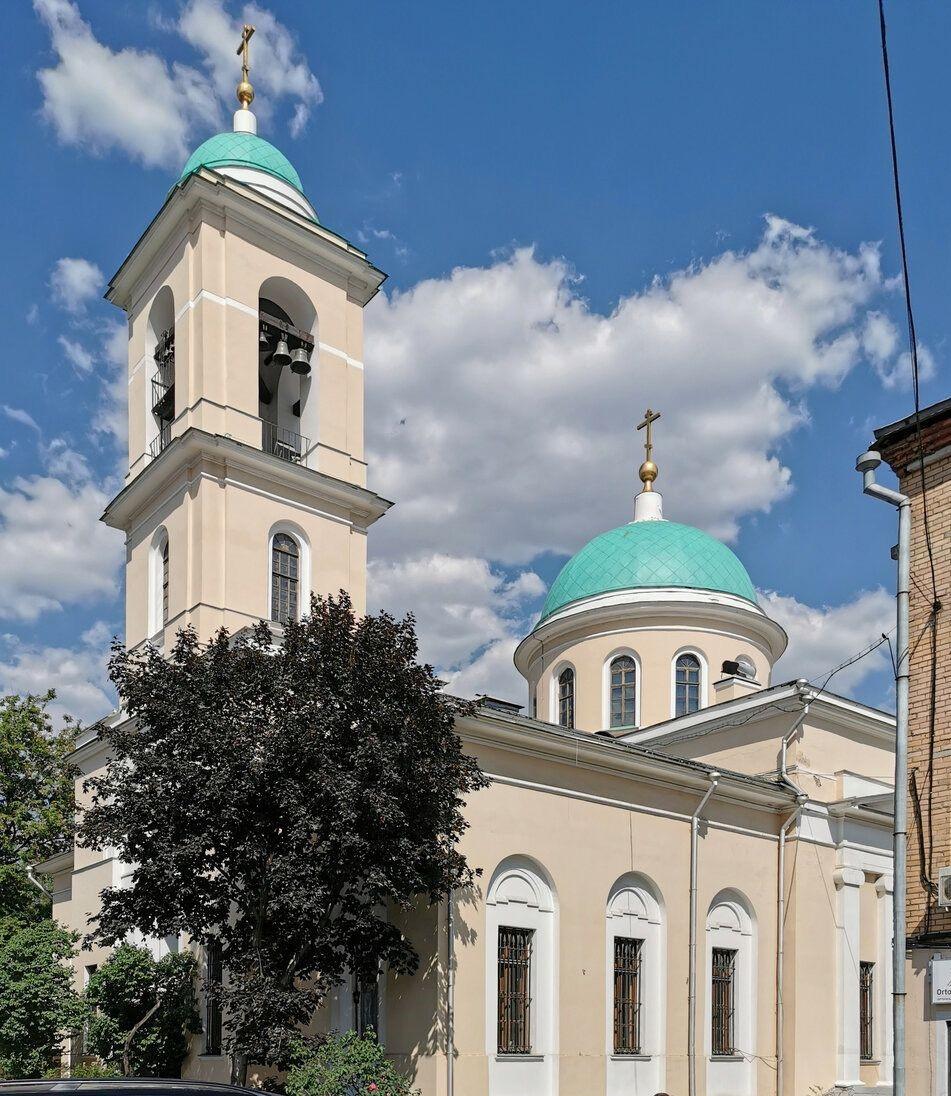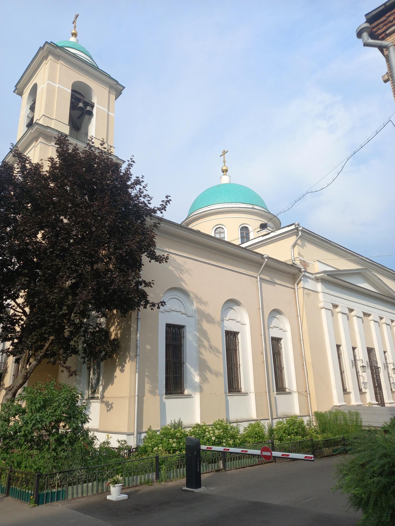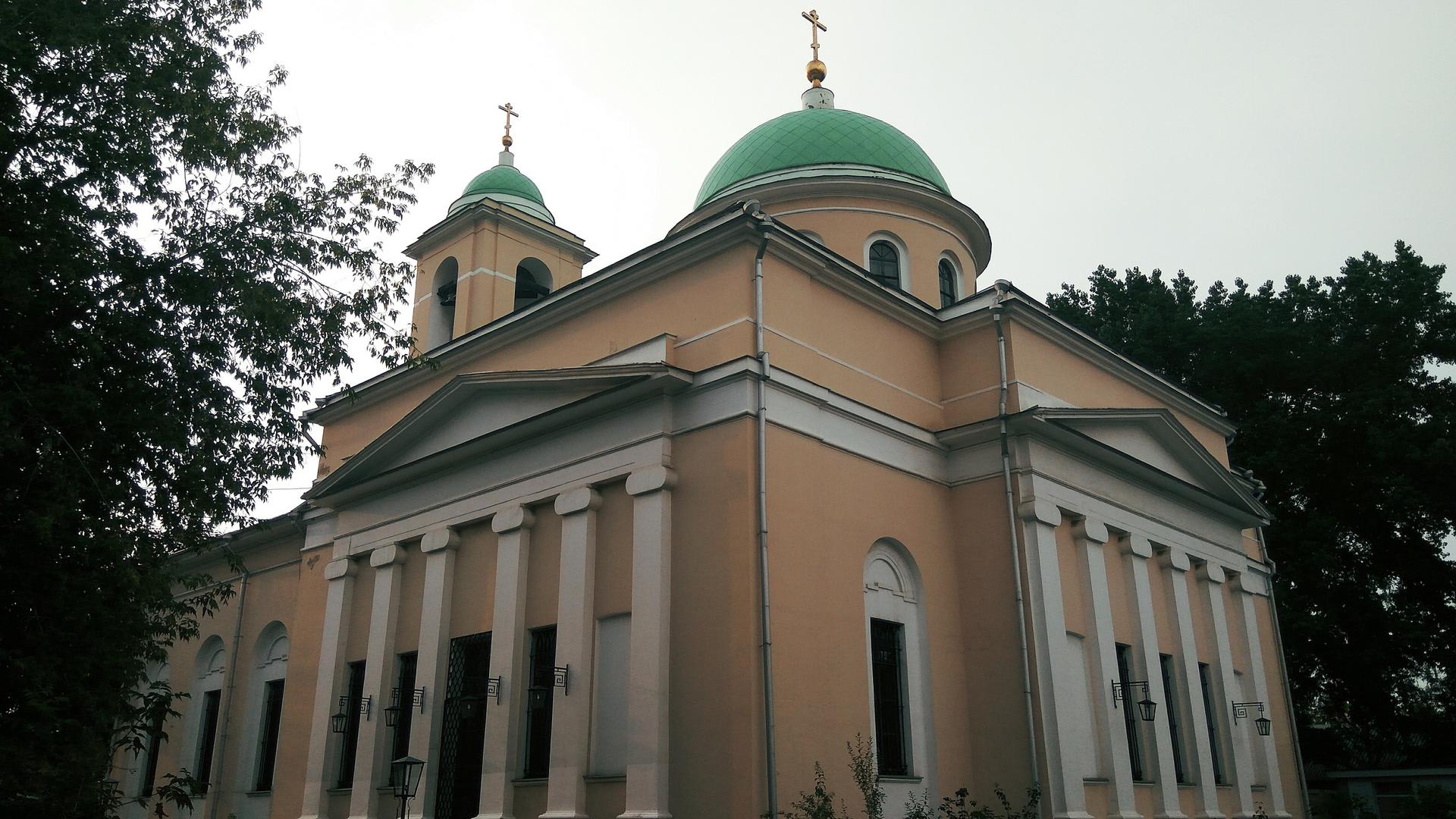 Церковь Воскресения Словущего построена архитектором Ф.М. Шестаковым и выдержана в стилистике позднего ампира: массивный куб основного храма, украшенный с севера и с юга шестиколонными ионическими портиками с фронтонами, увенчанный куполом со световой ротондой, продолжается на запад крупной трапезной и трёхъярусной колокольней над главным входом. Помимо трёх придельных храмов из старой церкви, в трапезной был добавлен четвёртый – во имя Иоанна Златоуста. С юго-запада от храма сохранился небольшой одноэтажный дом причта.