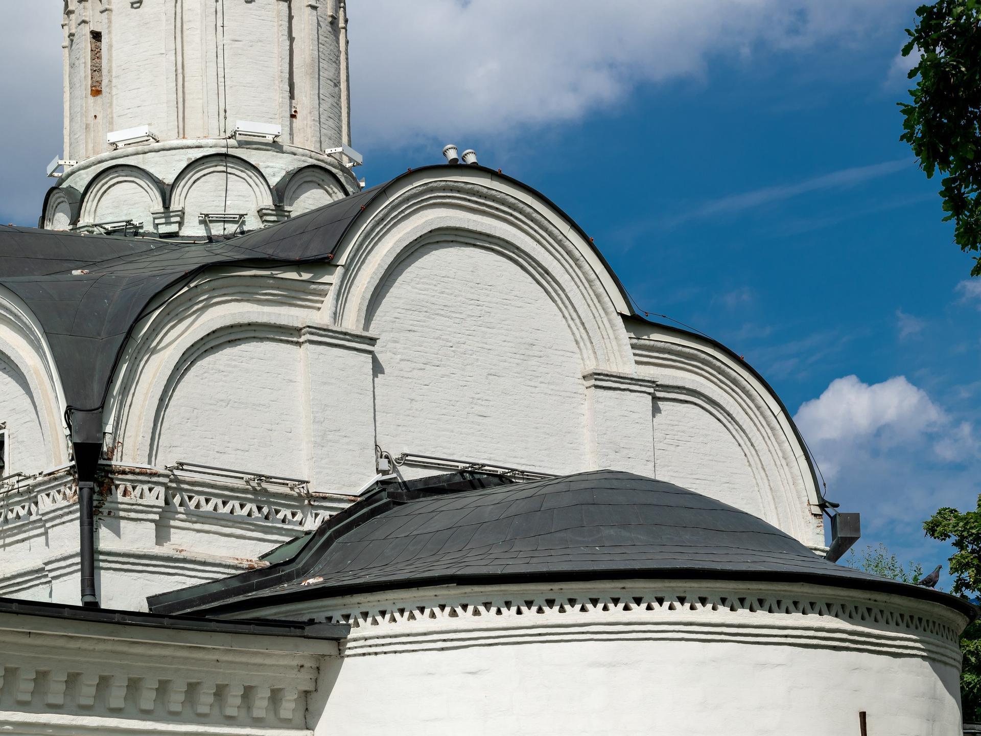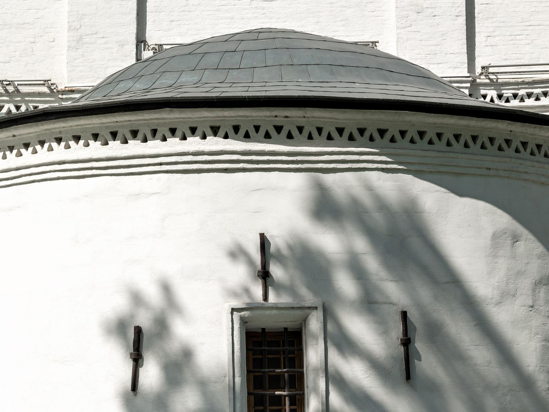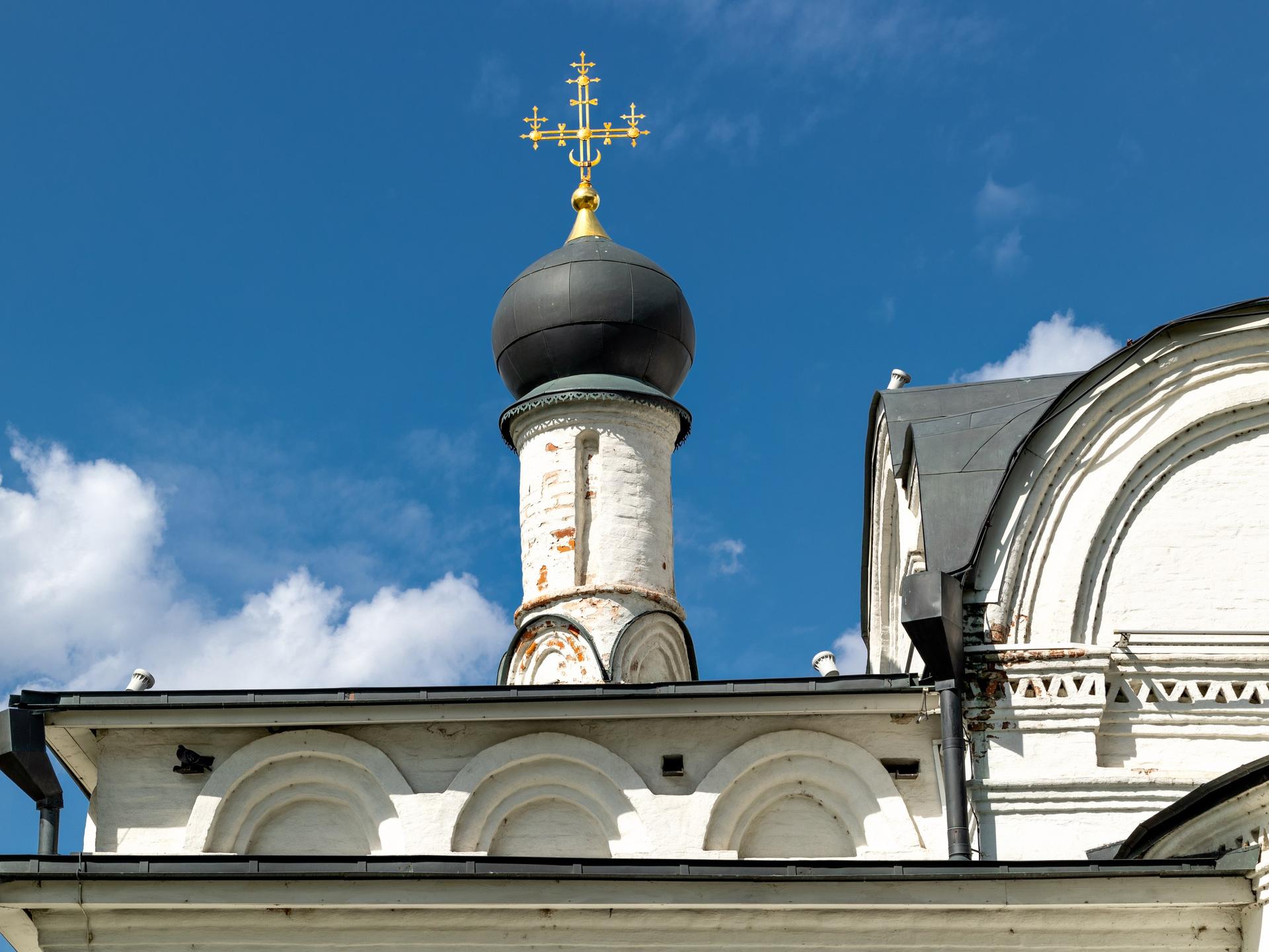 Зачатьевская церковь имела, как и сейчас, завершение фасадов трёхлопастными арками. Арки были покрыты чернолощёной черепицей. Такая форма завершения обусловлена конструкцией крещатых сводов, позволявших обходиться без внутренних столпов и одновременно как бы осенять пространство церкви крестом из пересекающихся сводов. В XVII-XVIII столетиях трёхлопастное покрытие изменили на четырёхскатную кровлю, под которой на стенах читались кокошники.