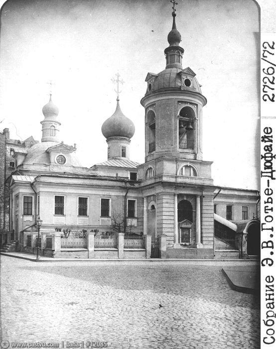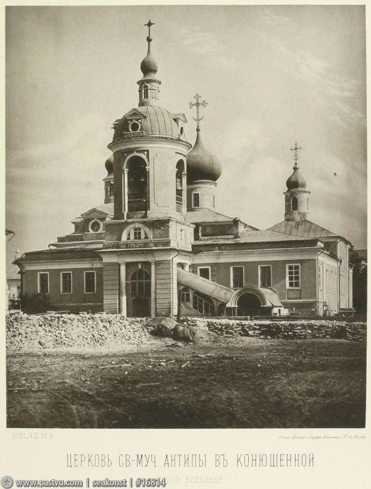 История храма священномученика Антипия на Колымажном дворе начинается в XVI в. Каменную церковь в Конюшенной слободе поставили около 1530 г. Храм назывался по своему местоположению: «у больших конюшен», «что в Чертолье», «что у Государевых больших конюшен».