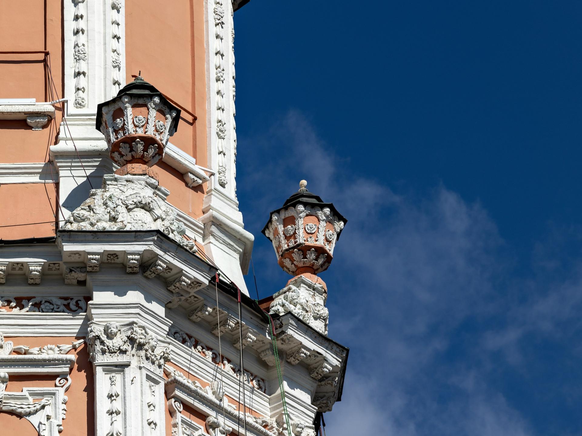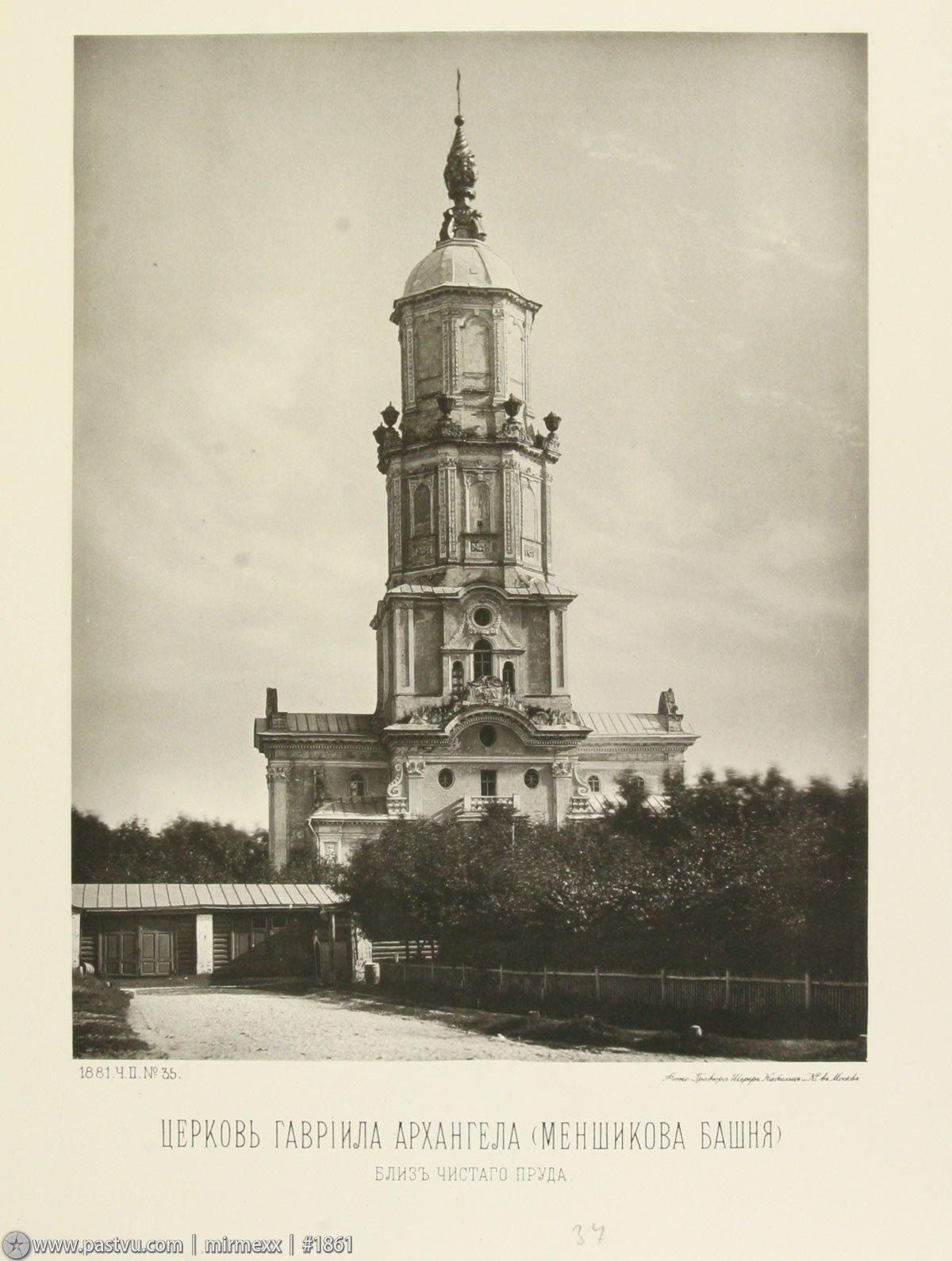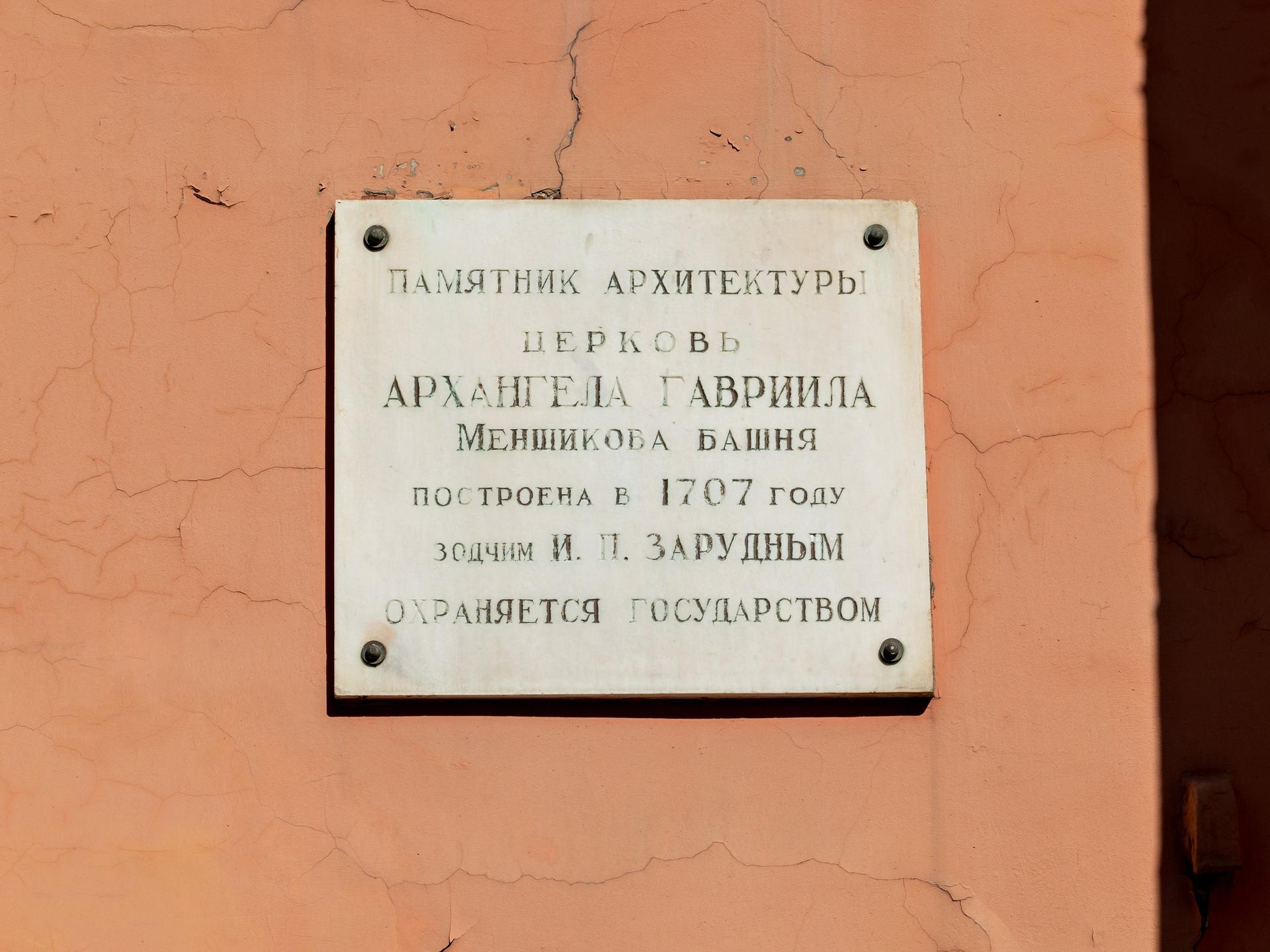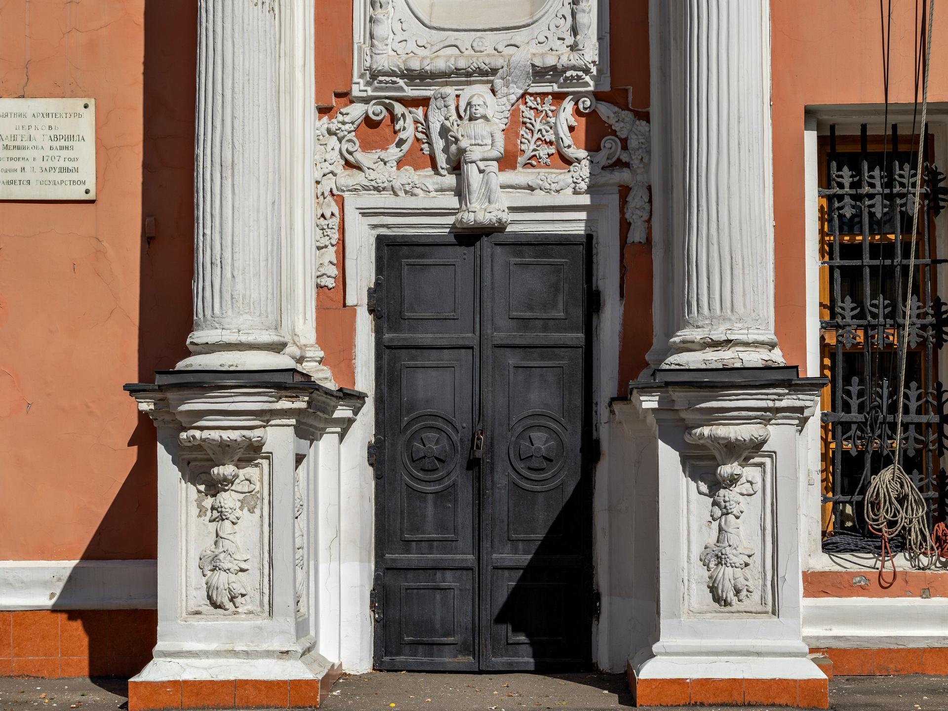 Архитектор Иван Зарудный, создававший новую церковь, работал в стилистике петровского барокко, которое заимствовало всё больше черт из европейской храмовой архитектуры. К его творениям относится ряд московских церквей, объединенных главной чертой – они вытянуты по вертикали. Храм уже не располагается в длину, не состоит из колокольни, трапезной и четверика с алтарными апсидами – он растет ввысь и становится центричным. Оттого многие постройки Зарудного напоминают башни – этот же титул перешел и к церкви Архангела Гавриила, получившей в народе прозвище «Меншикова башня». Полсотни колоколов подчинялись часовому механизму, доставленному из Англии. Фасады были покрыты белокаменным скульптурным декором, по углам располагались статуи. Но главной особенностью храма был венчавший его огромный 30‑метровый шпиль, увенчанный фигурой ангела с крестом. Пройдет время, и этот мотив будет повторен при строительстве Петропавловского собора в Санкт-Петербурге.