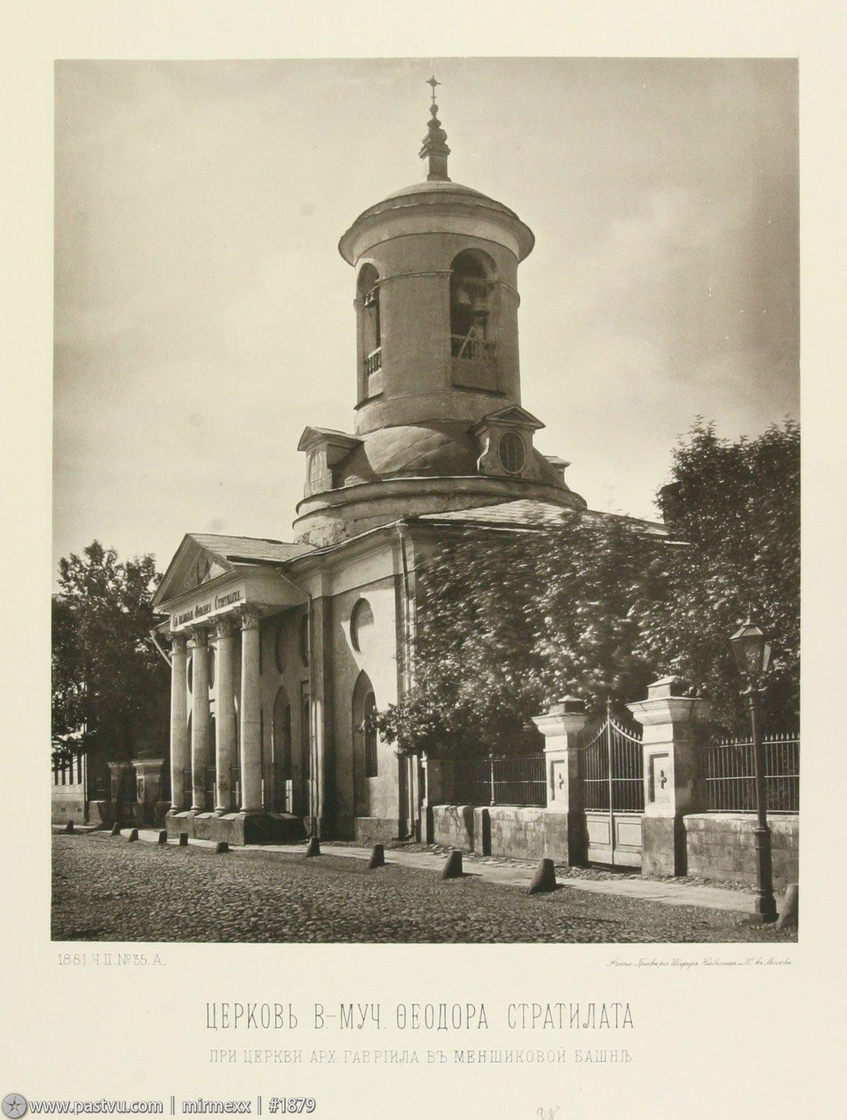 Вдоль Архангельского переулка в 1806 году на средства директора Почтамта Ф.П. Ключарёва по проекту архитектора И.В. Еготова был построен небольшой храм во имя святого Феодора Тирона (позднее переосвящена в честь Феодора Стратилата). В отличие от Меншиковой башни, здесь было отопление, церковь использовалась для богослужений в зимний период, а также исполняла роль колокольни, надстроенной прямо над зданием. В интерьере сохранился иконостас и росписи второй половины XIX века.