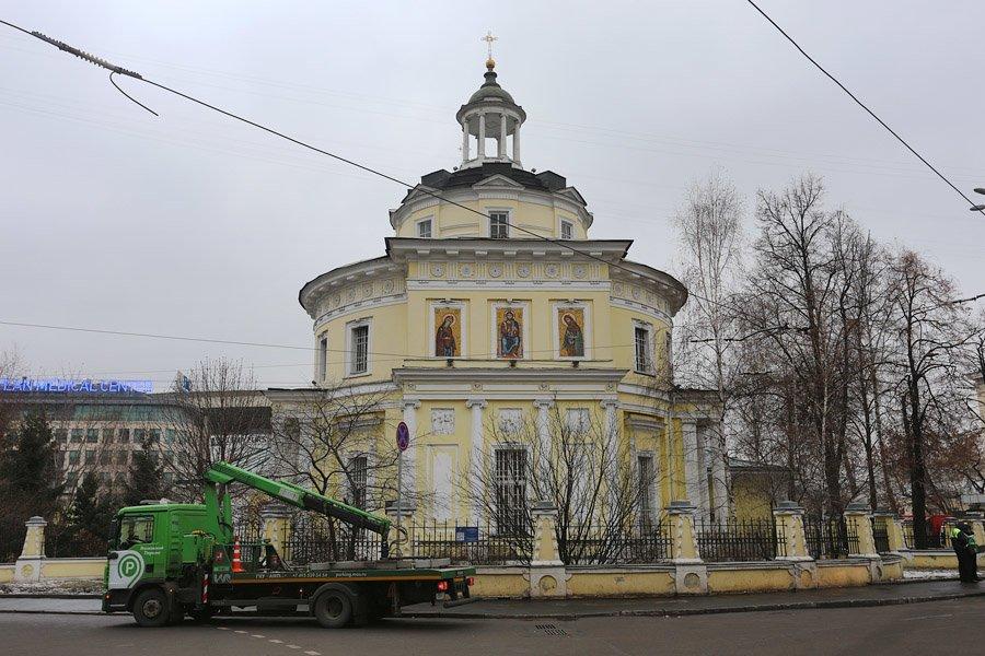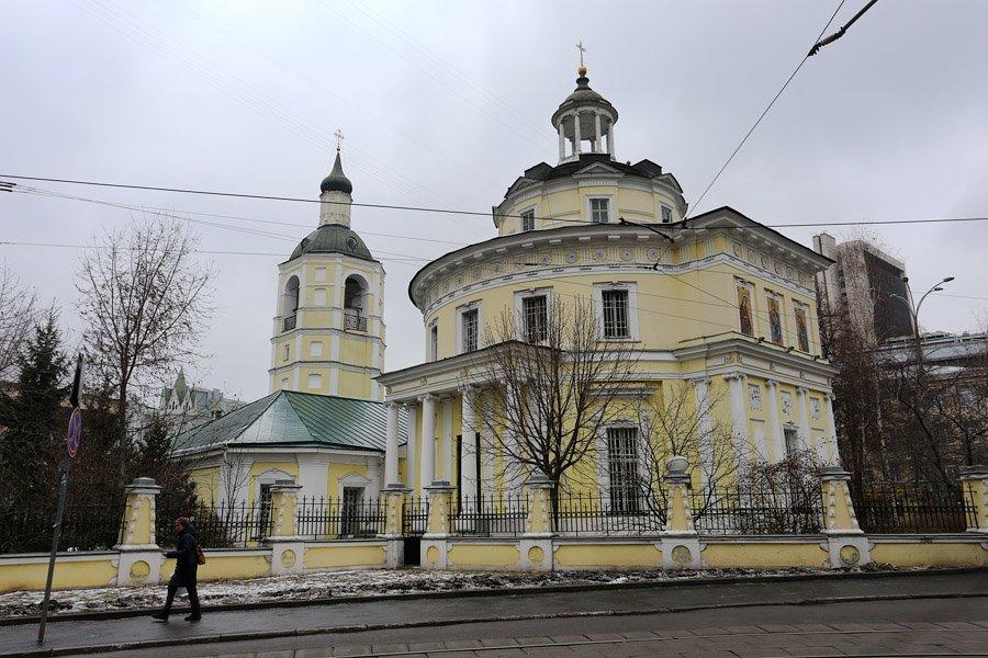 Об архитекторе ведутся дискуссии, но наиболее вероятным автором проекта считается М.Ф. Казаков. Официально работами руководил С.А. Карин. Храм был создан по канонам классицизма и богато украшен: изначально существовал план размещения при нем подворья митрополита Платона. Барочная колокольня и почти лишенная декора трапезная контрастируют с ротондой основной части храма, украшенной наличниками, медальонами, четырехколонными ионическими портиками с лепниной и пилястровым портиком на алтарной апсиде с востока. Ротонда завершается куполом поменьше, прорезанным крупными окнами, купол же увенчан фонарем, напоминающим парковую беседку. Похожее завершение Казаков применил в церкви Вознесения Господня на Гороховом поле. Не менее примечательна церковь изнутри: в западной половине ротонды расставлены полукругом колонны ионического большого ордера, в алтарной части такой же полукруг выполнен из колонн малого коринфского ордера. Хоры при этом расположены на колоннах дорического ордера. Архитектор словно хотел использовать все возможные варианты классицистического декора, применявшиеся в ту эпоху в православных храмах. Купол изнутри украшен тонко проработанными кессонами. Впечатление от масштабности церкви изнутри еще более усиливается с помощью многочисленных декоративных деталей.