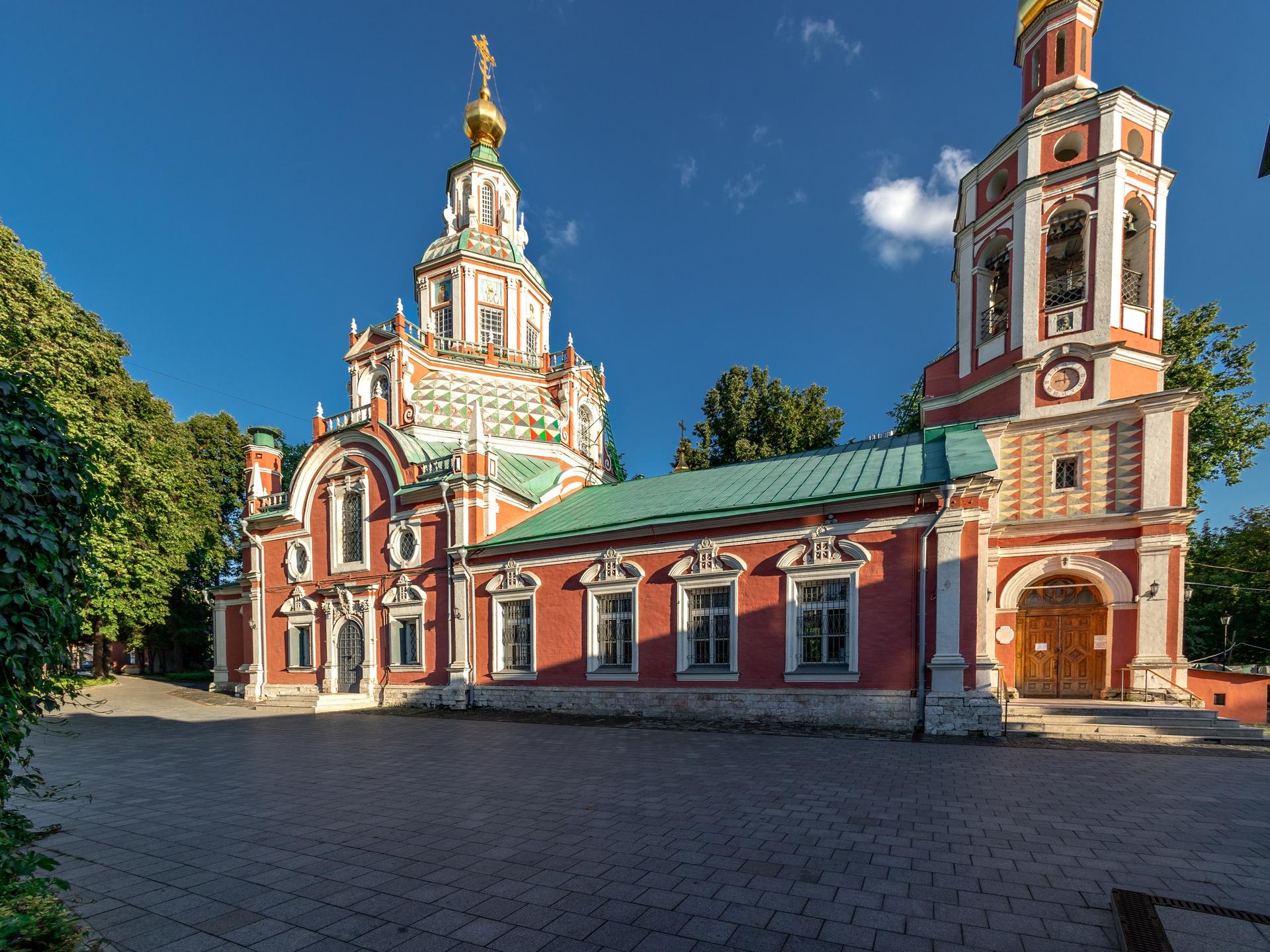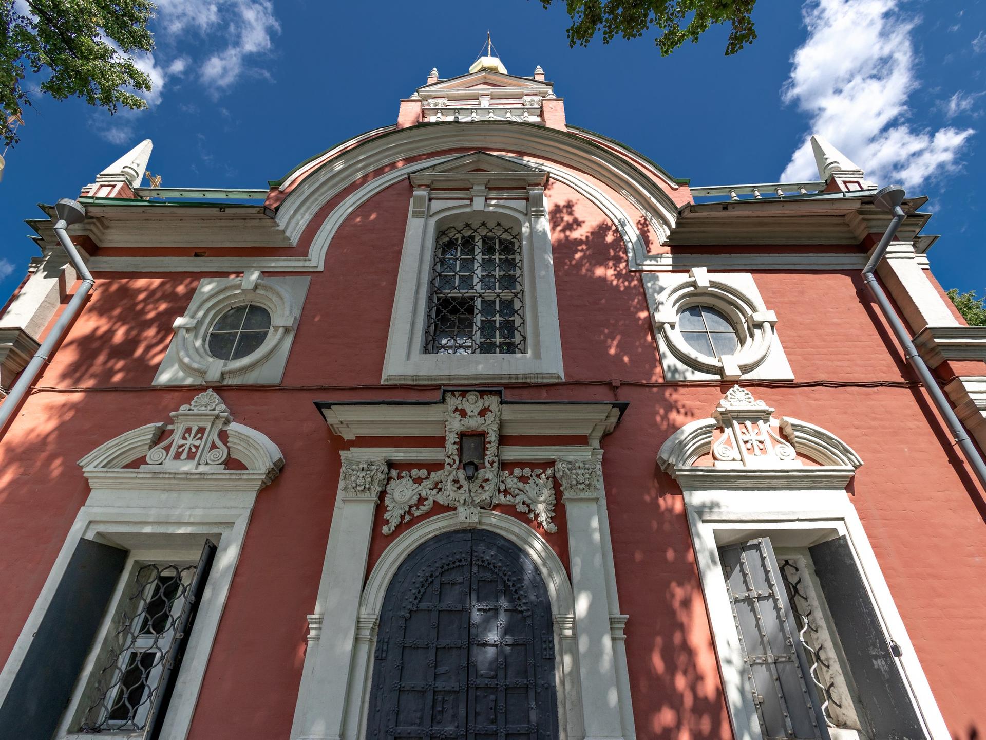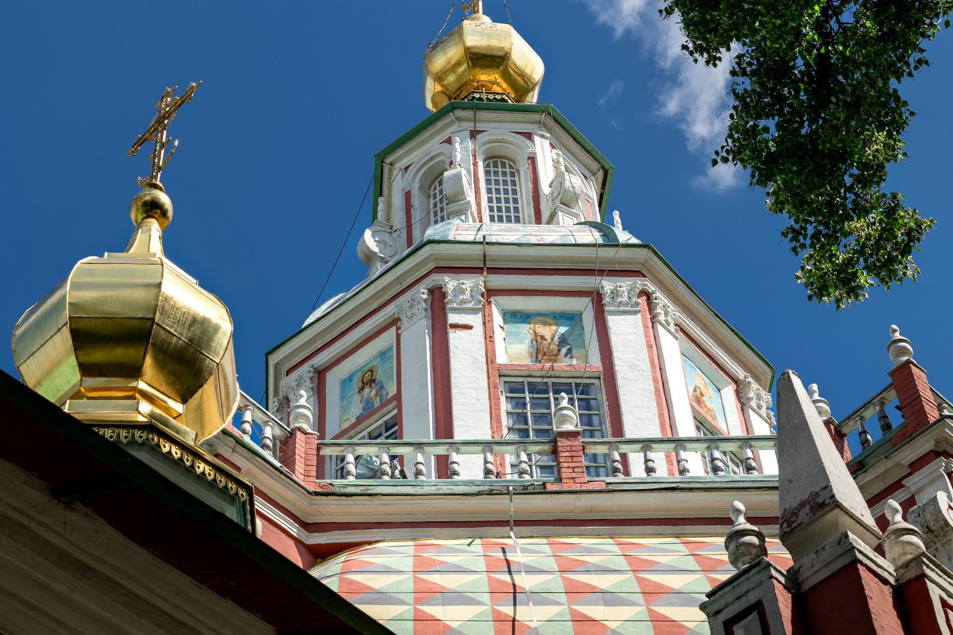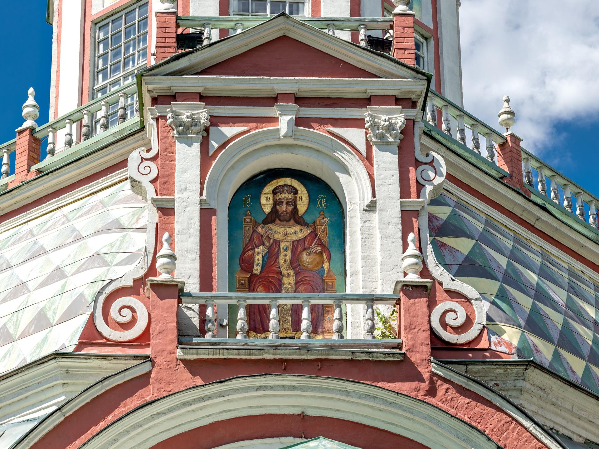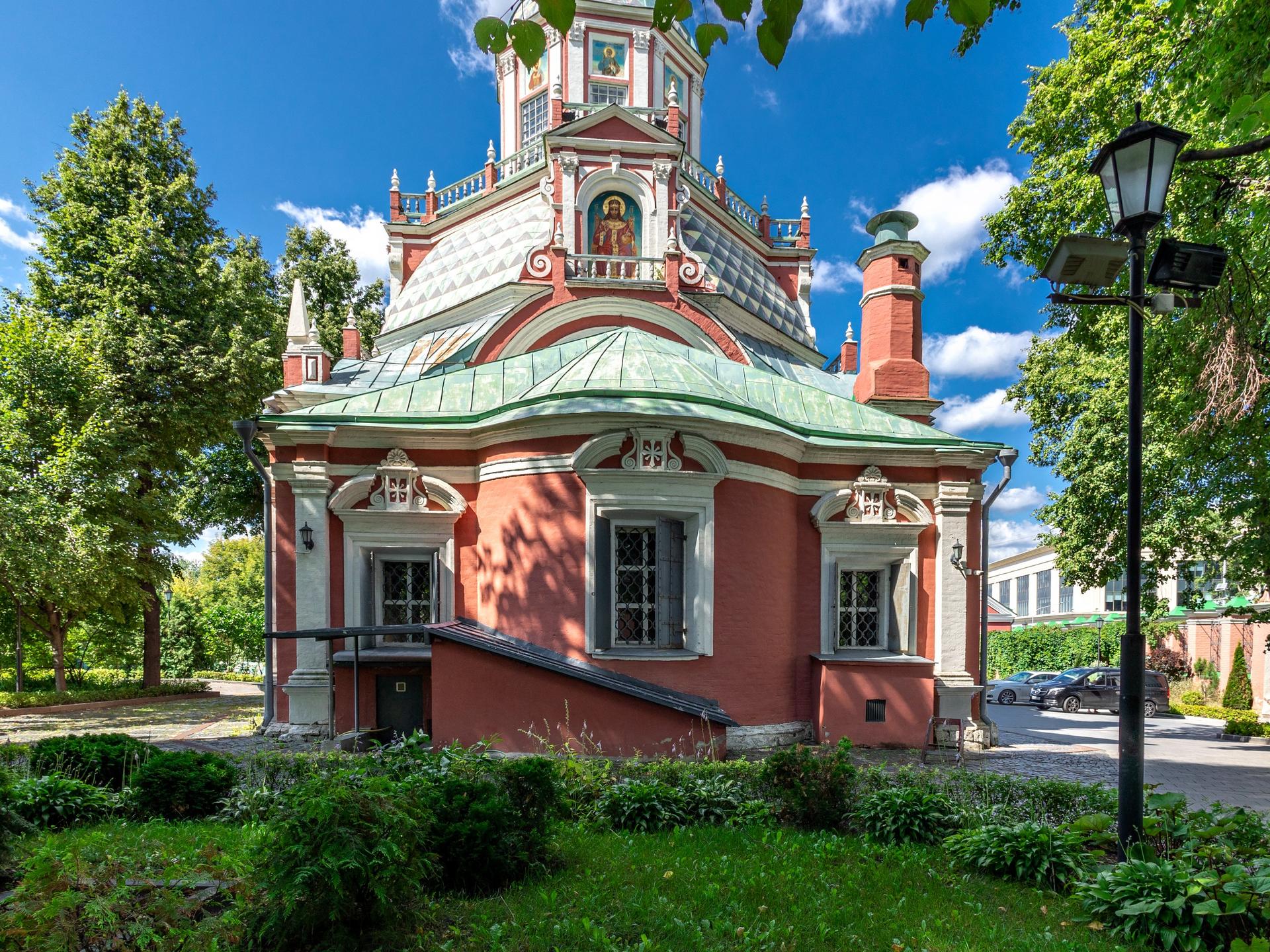 Удивительная красота храма объясняется гармоничным сочетанием в его архитектуре различных элементов. Нарядность фасада, наличники окон с «разорванными» фронтонами, многоярусность и центричность передают дыхание московского барокко конца XVII века. Характерное чередование восьмериков, поставленных на четверик, дополнено переходными формами в виде промежуточных граненых куполов между ярусами, так называемыми «заломами» - излюбленный прием украинских зодчих. Это усиливает торжественность и парадность вертикальной композиции. На смену московским колонкам и столбикам приходит архитектурный ордер в виде пилястр с коринфскими капителями. Окна «люкарны» на куполе первого яруса – это веяние европейской архитектуры. Однако здесь вместо световых окон были помещены фрески.