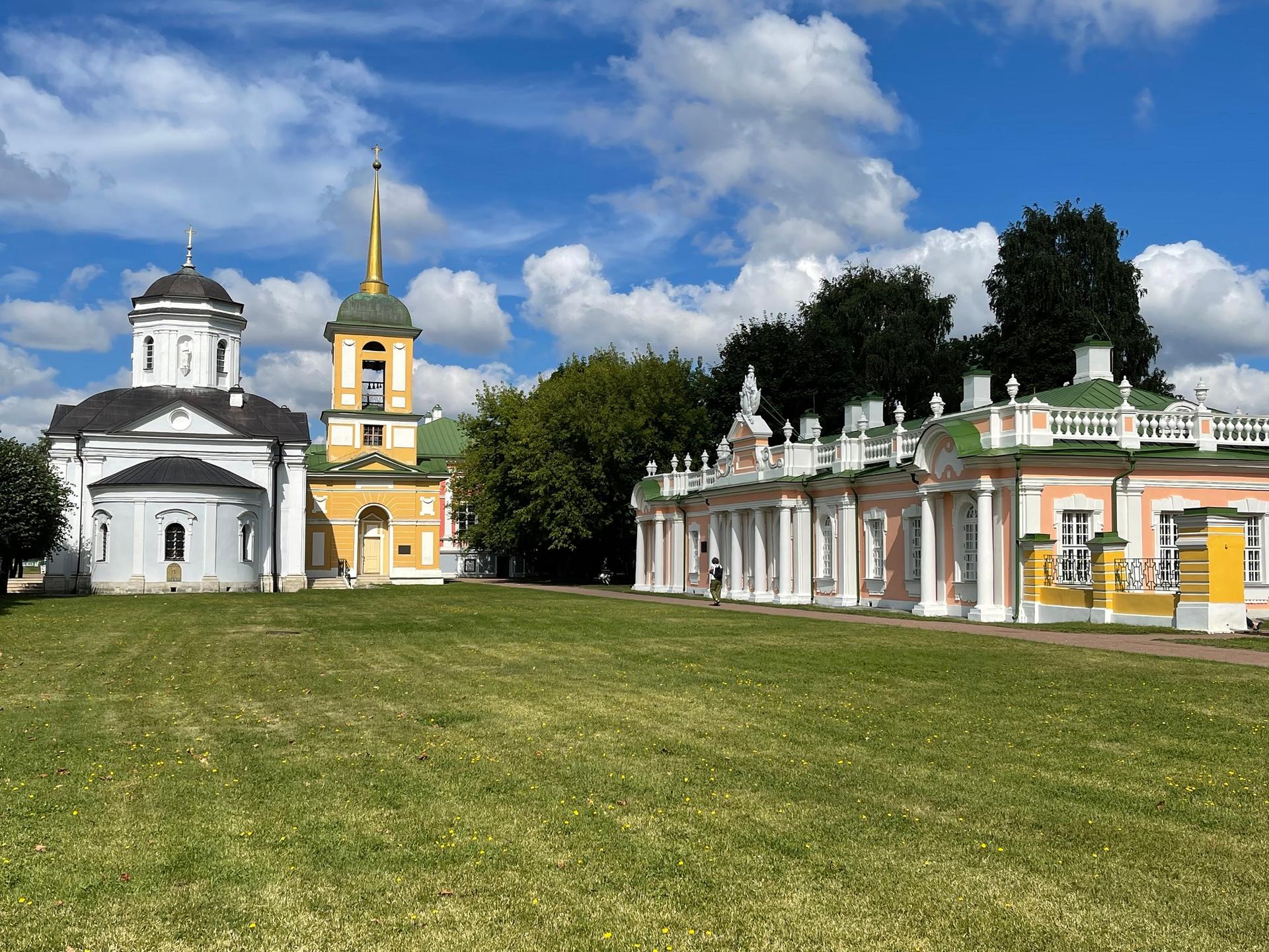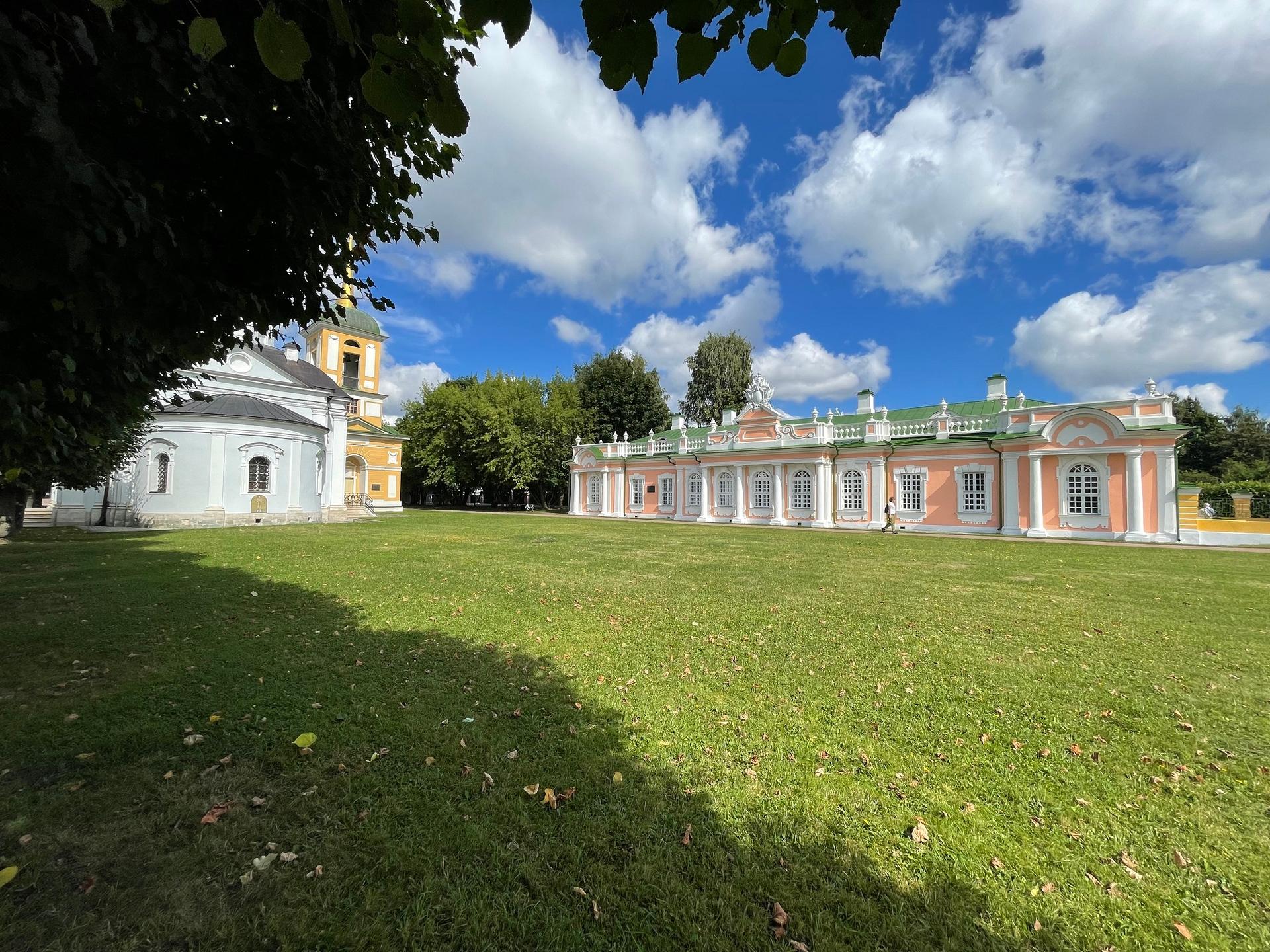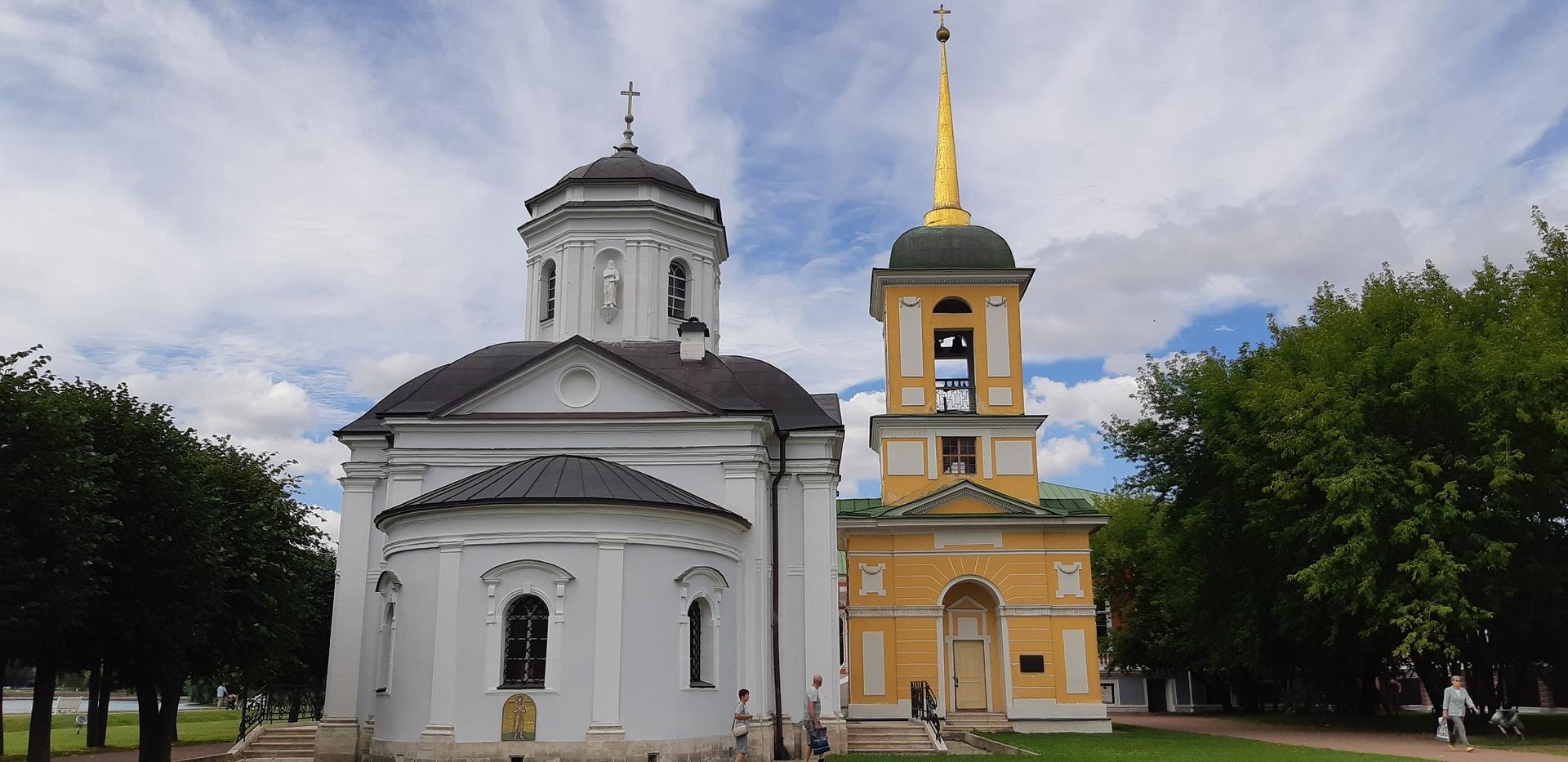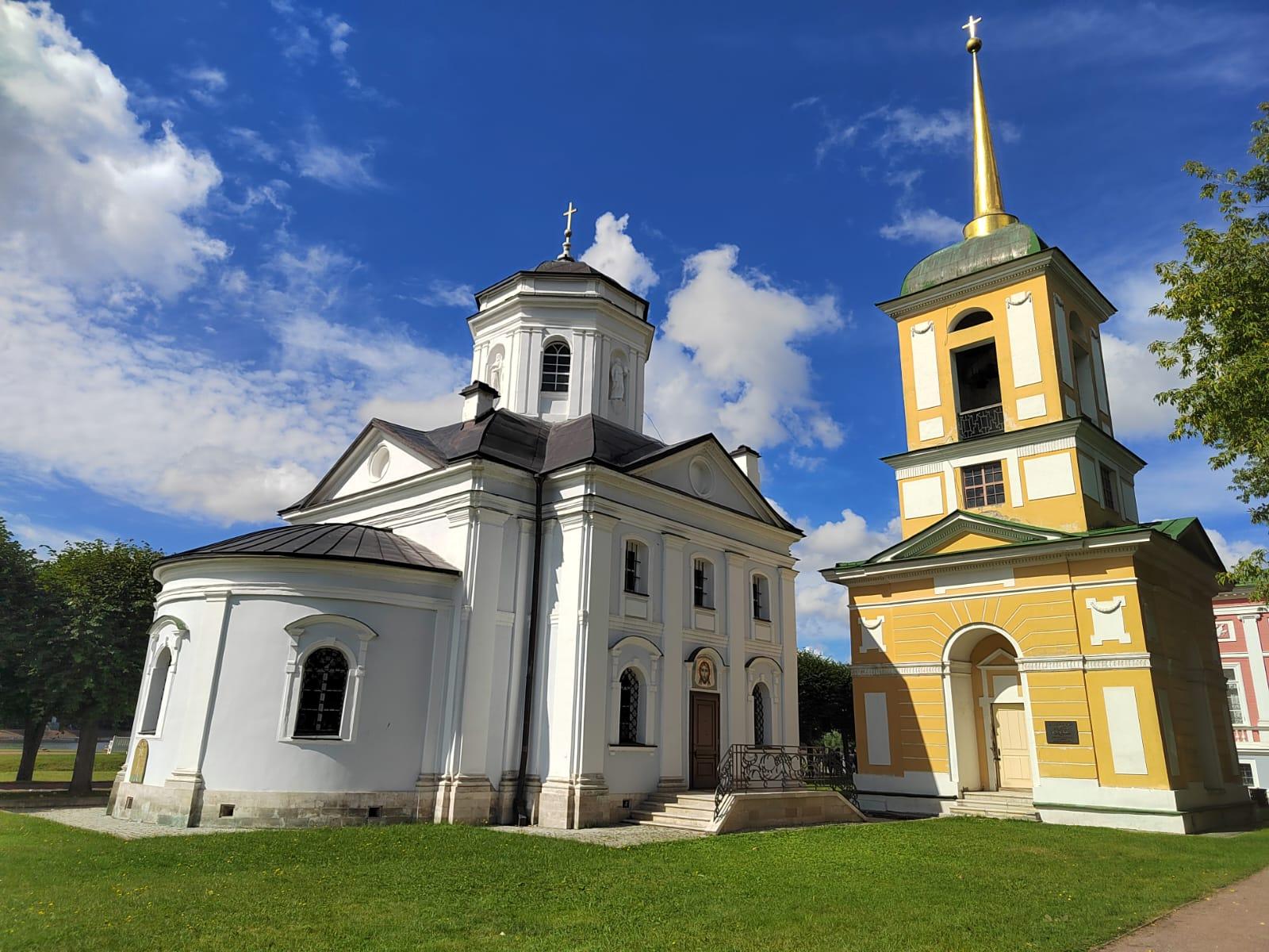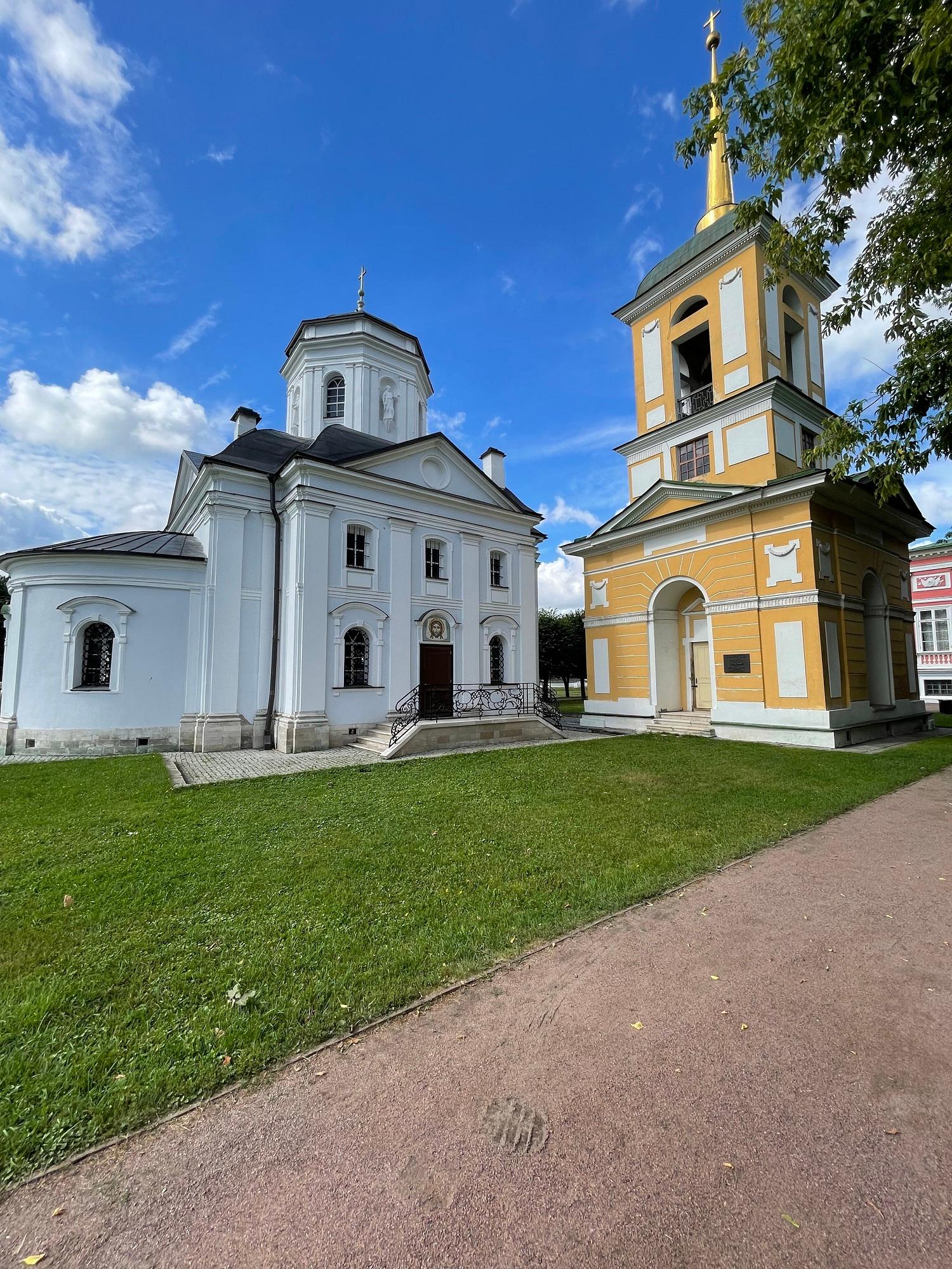 Самой ранней постройкой усадьбы является церковь во имя Происхождения честных древ Животворящего Креста Господня – Всемилостивого Спаса, возведенная неизвестным архитектором в 1737-1739 годах в стиле «аннинского барокко». Колокольня, напротив, самая поздняя из усадебных строений, создана в 1792 году по проекту крепостных архитекторов А. Миронова и Г. Дикушина. За Церковью и Колокольней размещен Кухонный флигель, построенный в 1755 году талантливым крепостным архитектором Шереметевых Ф.С. Аргуновым. Благодаря описям XVIII века известно, что там располагались кондитерская, скатертная, хлебная, кофейная, кухни русская и французская. Чтобы постройка служебного назначения не нарушала парадный характер усадьбы, ее южный и северный фасады украшены торжественной колоннадой, высокими арочными окнами, изящной балюстрадой с декоративными вазами на парапете кровли и картушами в виде воинских доспехов и знамен, что придает этому зданию нарядность и торжественность. Вместе с Дворцом эти постройки образуют ансамбль Почетного двора, расположенного на берегу Большого пруда.