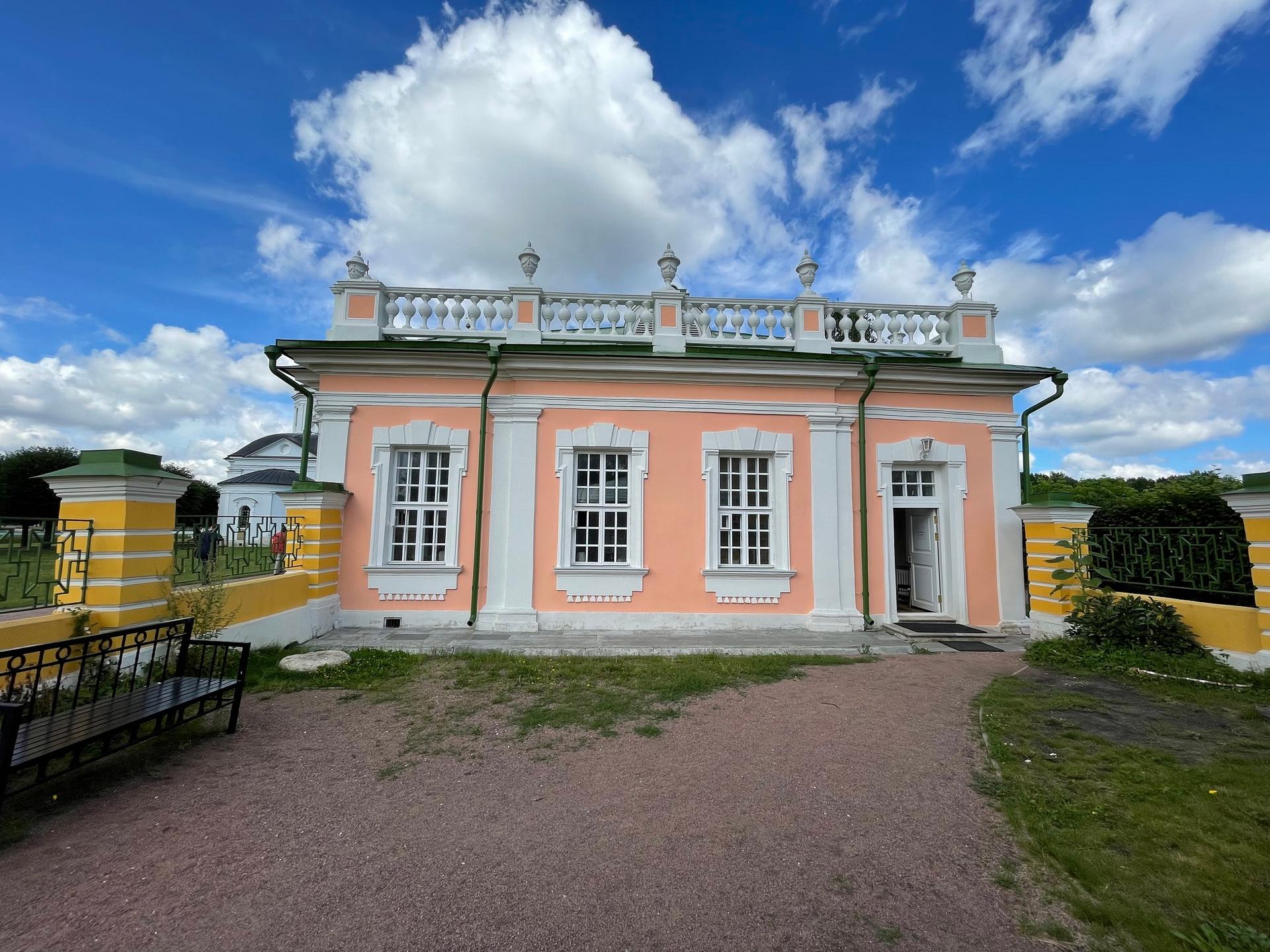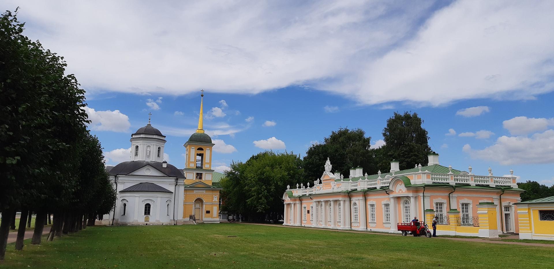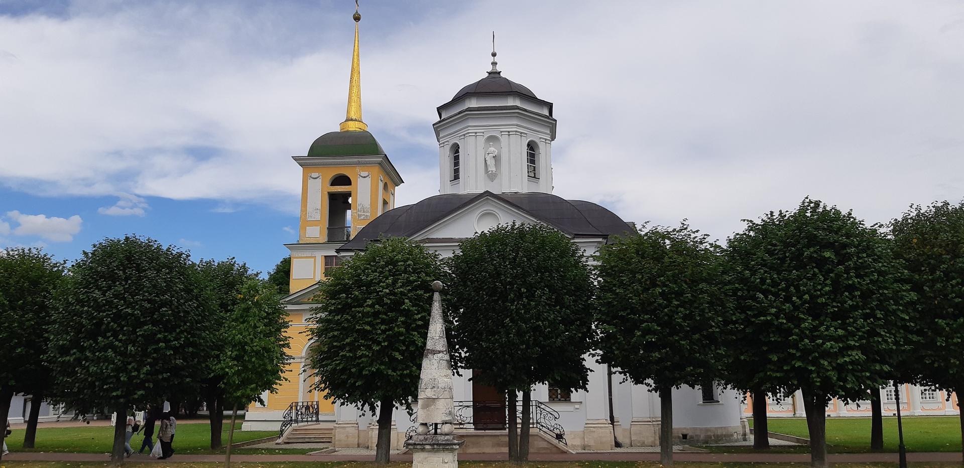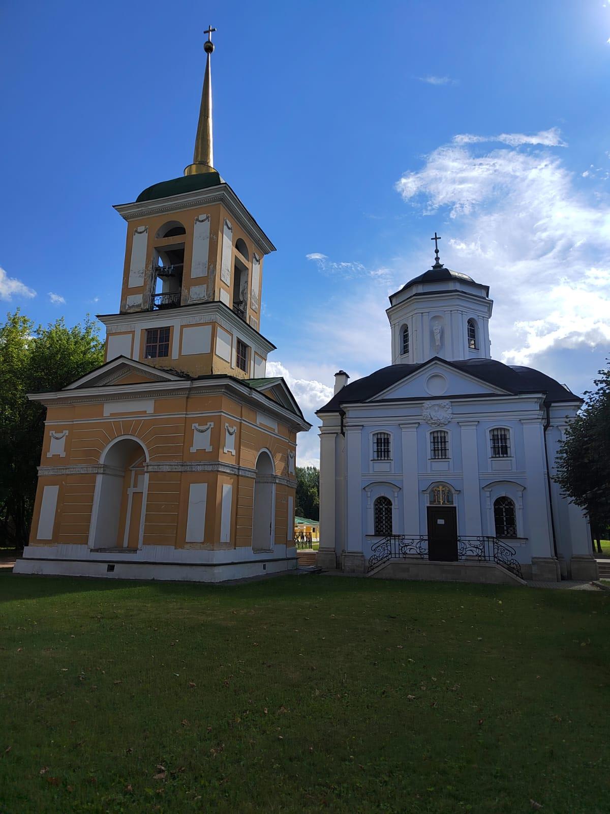 Самой ранней постройкой усадьбы является церковь во имя Происхождения честных древ Животворящего Креста Господня – Всемилостивого Спаса, возведенная неизвестным архитектором в 1737-1739 годах в стиле «аннинского барокко». Колокольня, напротив, самая поздняя из усадебных строений, создана в 1792 году по проекту крепостных архитекторов А. Миронова и Г. Дикушина. За Церковью и Колокольней размещен Кухонный флигель, построенный в 1755 году талантливым крепостным архитектором Шереметевых Ф.С. Аргуновым. Благодаря описям XVIII века известно, что там располагались кондитерская, скатертная, хлебная, кофейная, кухни русская и французская. Чтобы постройка служебного назначения не нарушала парадный характер усадьбы, ее южный и северный фасады украшены торжественной колоннадой, высокими арочными окнами, изящной балюстрадой с декоративными вазами на парапете кровли и картушами в виде воинских доспехов и знамен, что придает этому зданию нарядность и торжественность. Вместе с Дворцом эти постройки образуют ансамбль Почетного двора, расположенного на берегу Большого пруда.