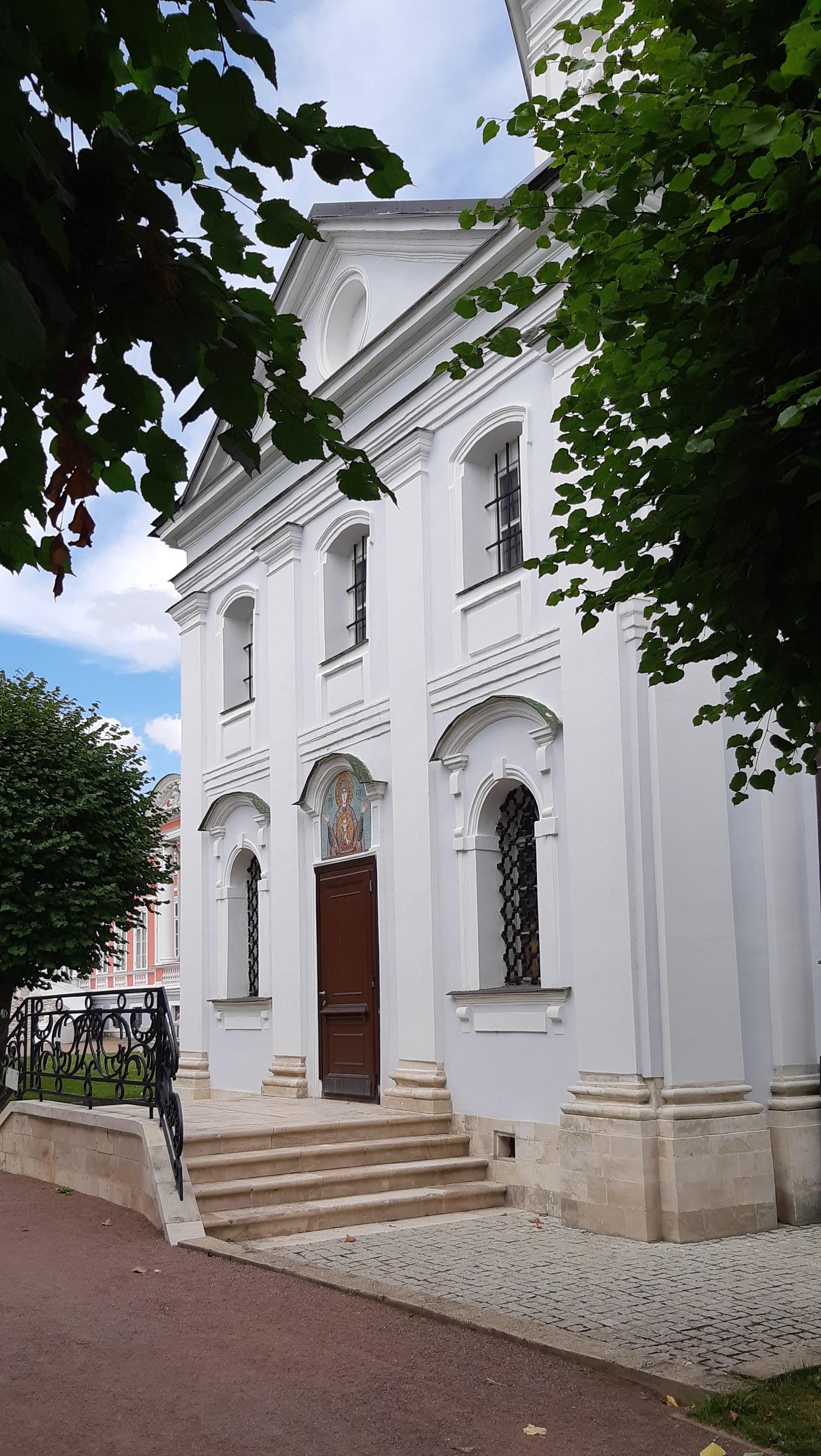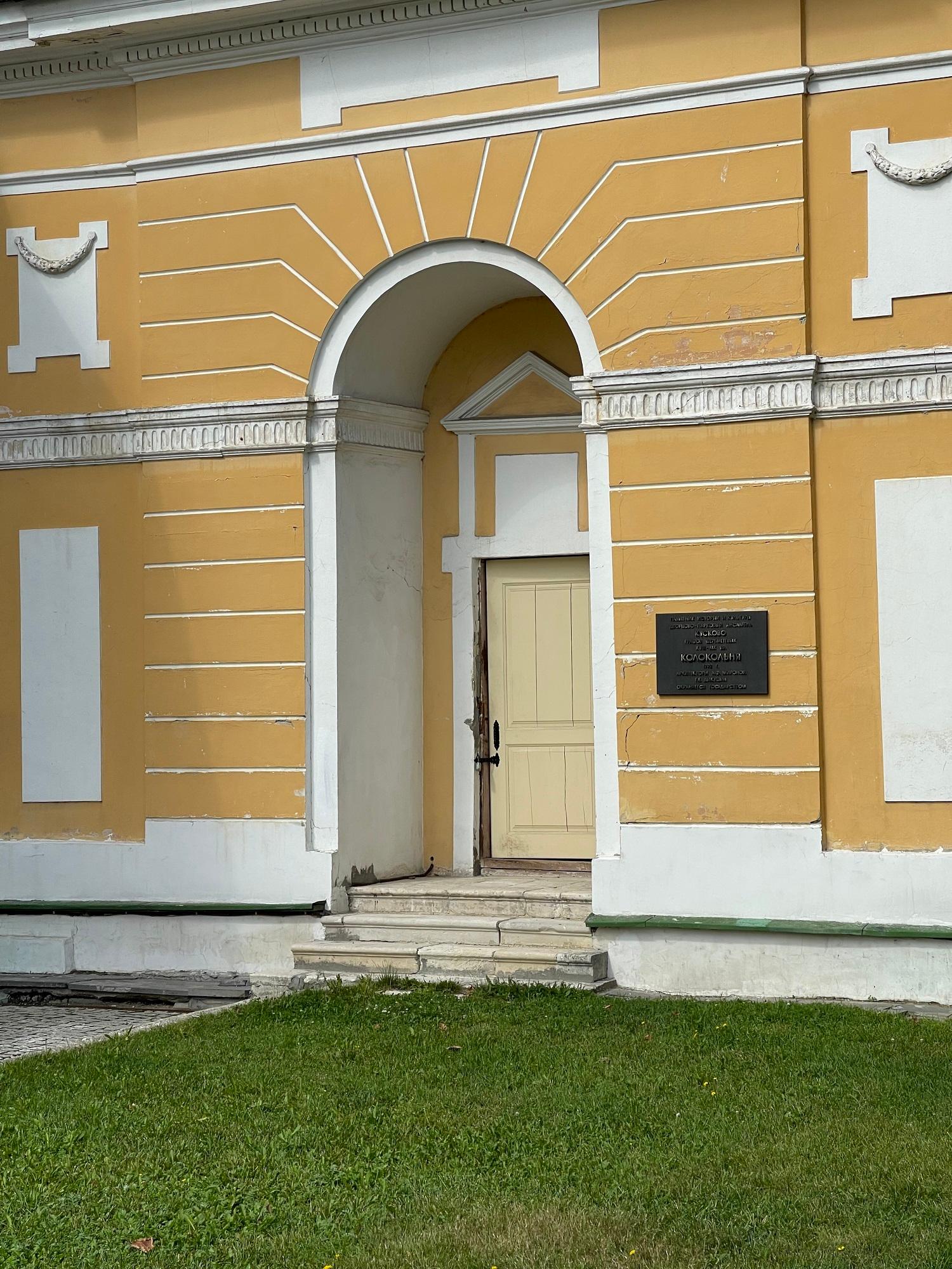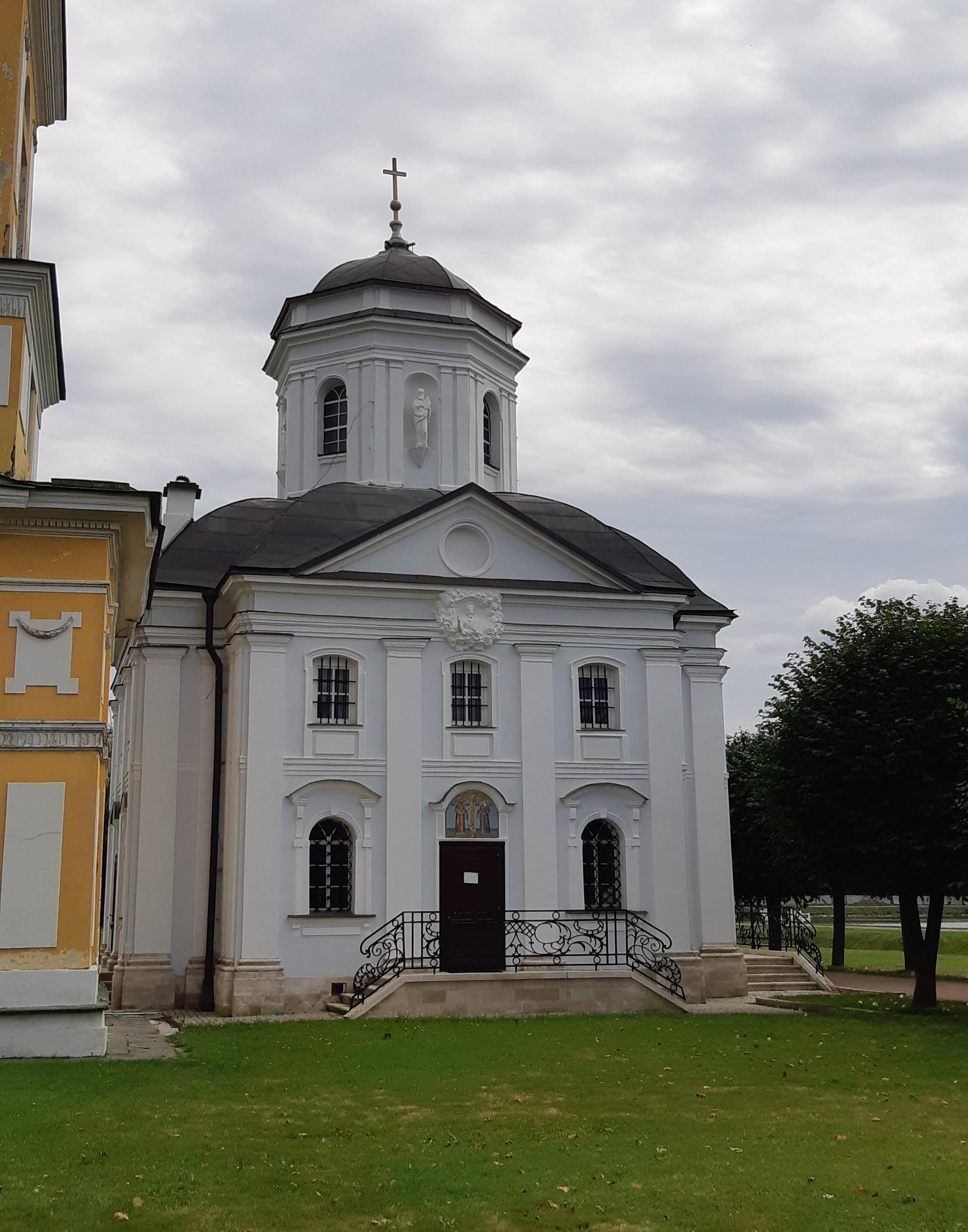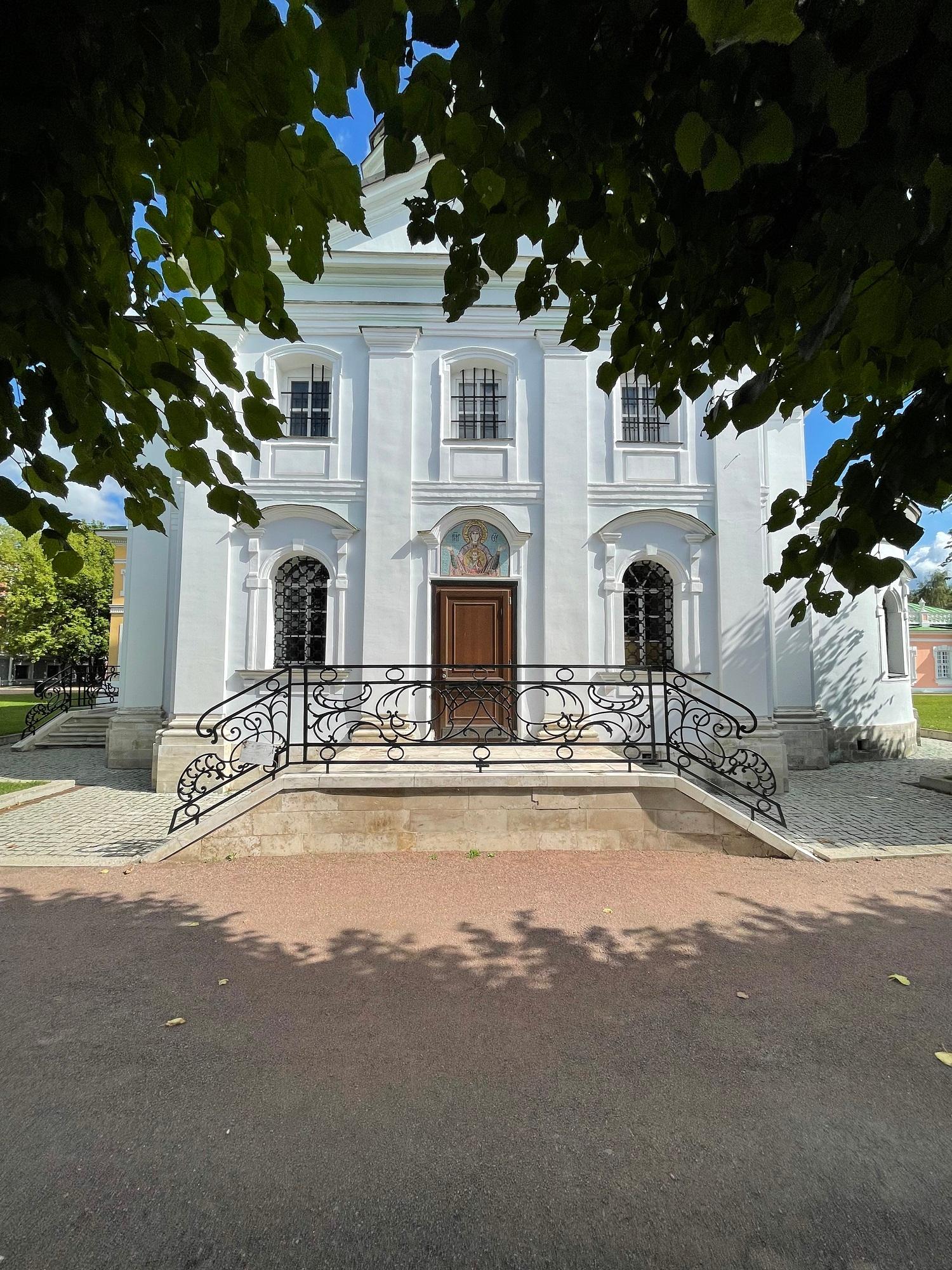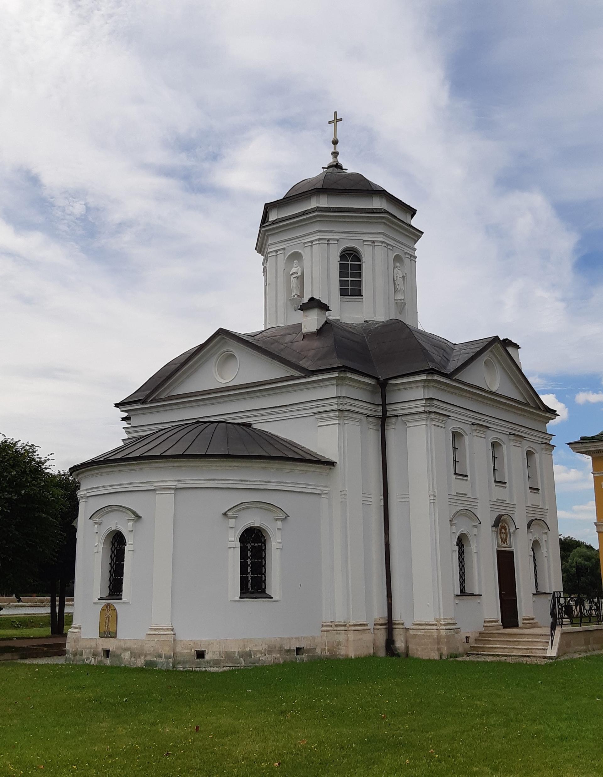 Самой ранней постройкой усадьбы является церковь во имя Происхождения честных древ Животворящего Креста Господня – Всемилостивого Спаса, возведенная неизвестным архитектором в 1737-1739 годах в стиле «аннинского барокко». Колокольня, напротив, самая поздняя из усадебных строений, создана в 1792 году по проекту крепостных архитекторов А. Миронова и Г. Дикушина. За Церковью и Колокольней размещен Кухонный флигель, построенный в 1755 году талантливым крепостным архитектором Шереметевых Ф.С. Аргуновым. Благодаря описям XVIII века известно, что там располагались кондитерская, скатертная, хлебная, кофейная, кухни русская и французская. Чтобы постройка служебного назначения не нарушала парадный характер усадьбы, ее южный и северный фасады украшены торжественной колоннадой, высокими арочными окнами, изящной балюстрадой с декоративными вазами на парапете кровли и картушами в виде воинских доспехов и знамен, что придает этому зданию нарядность и торжественность. Вместе с Дворцом эти постройки образуют ансамбль Почетного двора, расположенного на берегу Большого пруда.