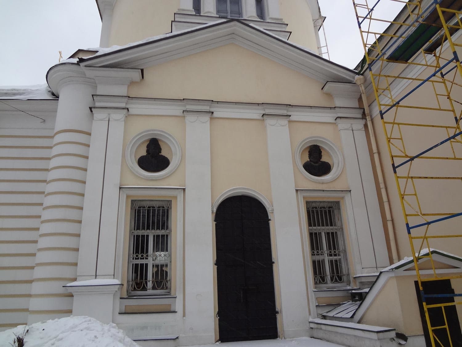 С северной и южной сторон первого яруса храма имеются два входа, оформленные ордером в виде двух пилястр - справа и слева от двери и двух спаренных пилястр по бокам фасада. Сверху располагается полуфронтон. Над окнами и под карнизом в розетках расположены горельефные изображение четырех евангелистов, по два с каждой стороны. Все горельефы имеют оплечную композицию и изображают евангелистов примерно в одном возрасте. В литературе и у служителей храма не удалось выяснить, какое изображение соответствует конкретному лицу, а надписей не имеется, поэтому следует предположить, что, по аналогии с алтарными вратами на северном фасаде, имеются изображения евангелистов Иоанна и Луки. А с южной стороны – Матфея и Марка, соответственно.
