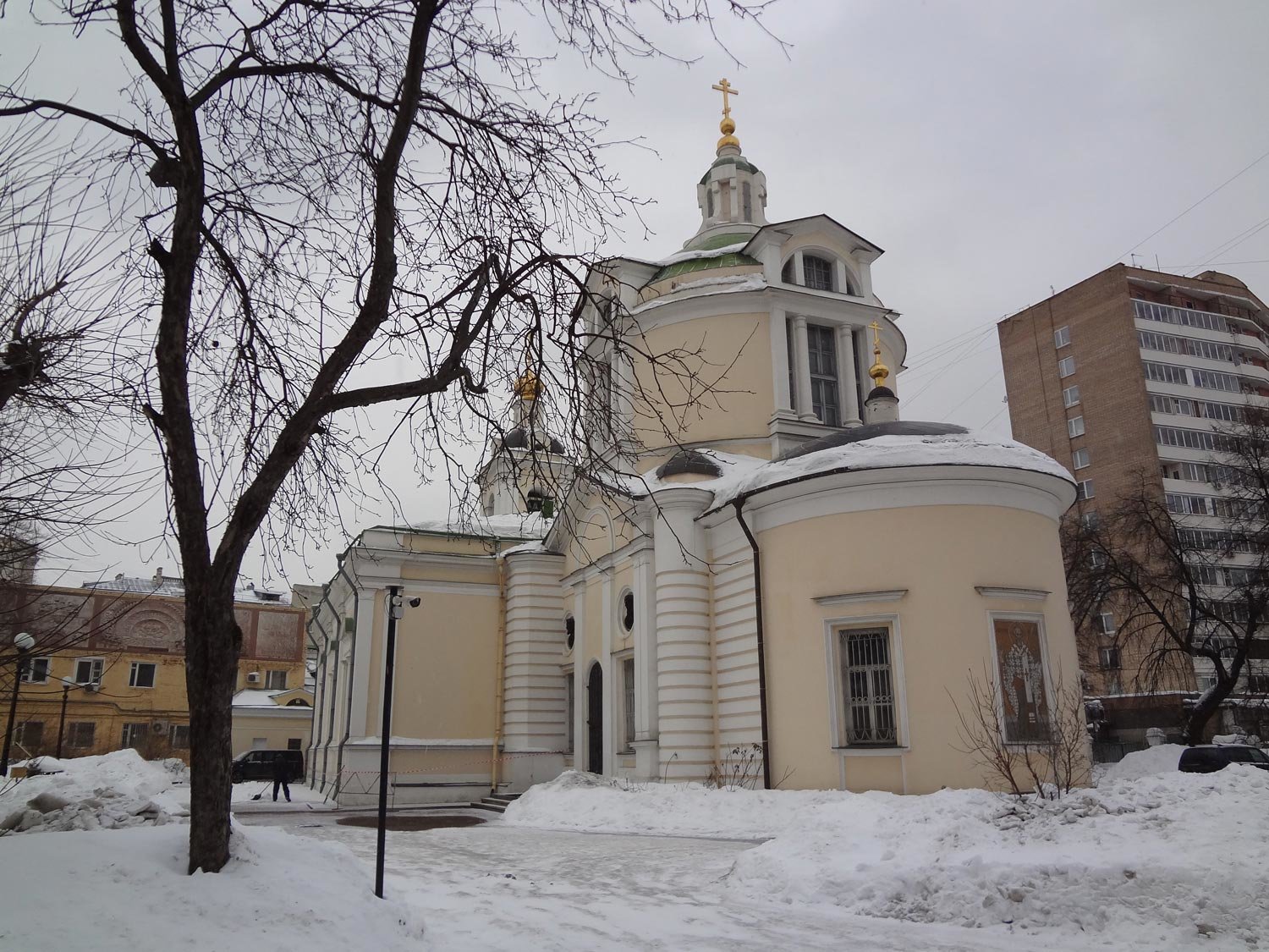 Композиция храма представляет характерный прием расположения построек в форме «корабль» - колокольня, трапезная, храм. Существующая четырехстолпная трапеза появилась в результате перестройки в 1847 г. Тогда же был достроен и третий ярус колокольни. Сам храм представляет собой ротонду, характерный тип храмов того времени, накрытую сферическим куполом с расположенными на нем световыми окнами. И здесь можно увидеть оригинальное архитектурное решение, отличающее именно эту церковь. На плоскости самой ротонды имеются четыре небольших ризалита, в которых размещены трехчастные окна, переходящие в световое окно «люкарно» уже на самом куполе. В литературе при описании такого решения используют термин «венецианские окна». Однако здесь решение гораздо богаче. Строго говоря, «венецианское окно» это трехчастное окно, в котором центральное окно большего размера с полукруглой аркой, отделенное двумя пилястрами от двух полуокон. Здесь же все части окон имеют полуциркульное завершение, над которым располагается полуфронтон. К тому же верхние части окна отделены карнизом. Благодаря такому внешнему решению, создается очень богатое освещение внутри храма.