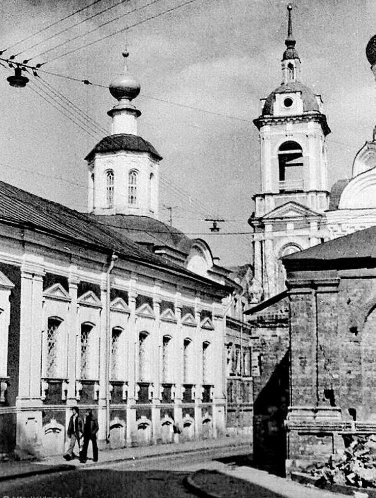 Сам по себе храм Усекновения был перестроен в конце XVII в., а подворье подверглось коренной реконструкции уже в следующем столетии. В конце 1750-х гг. на средства купцов Замятиных к церкви была пристроена трапезная, занявшая, в том числе, и площадку старой колокольни. В это же время начато строительство новой колокольни выходящей на Пятницкую улицу. Был построен только первый ярус, строительство было остановлено, потому что заказчик умер. И возобновлено только к 1780 году, когда у прихода появились деньги. Она умышленно возводилась на некотором удалении от храма – зато на красной линии магистральной Пятницкой улицы. Таким способом приход храма «что под Бором» добился, что церковь, спрятавшуюся в переулке, невозможно было не заметить при въезде и выезде из центра города.