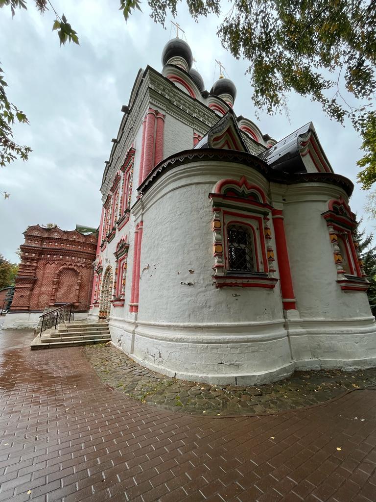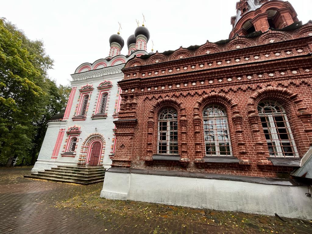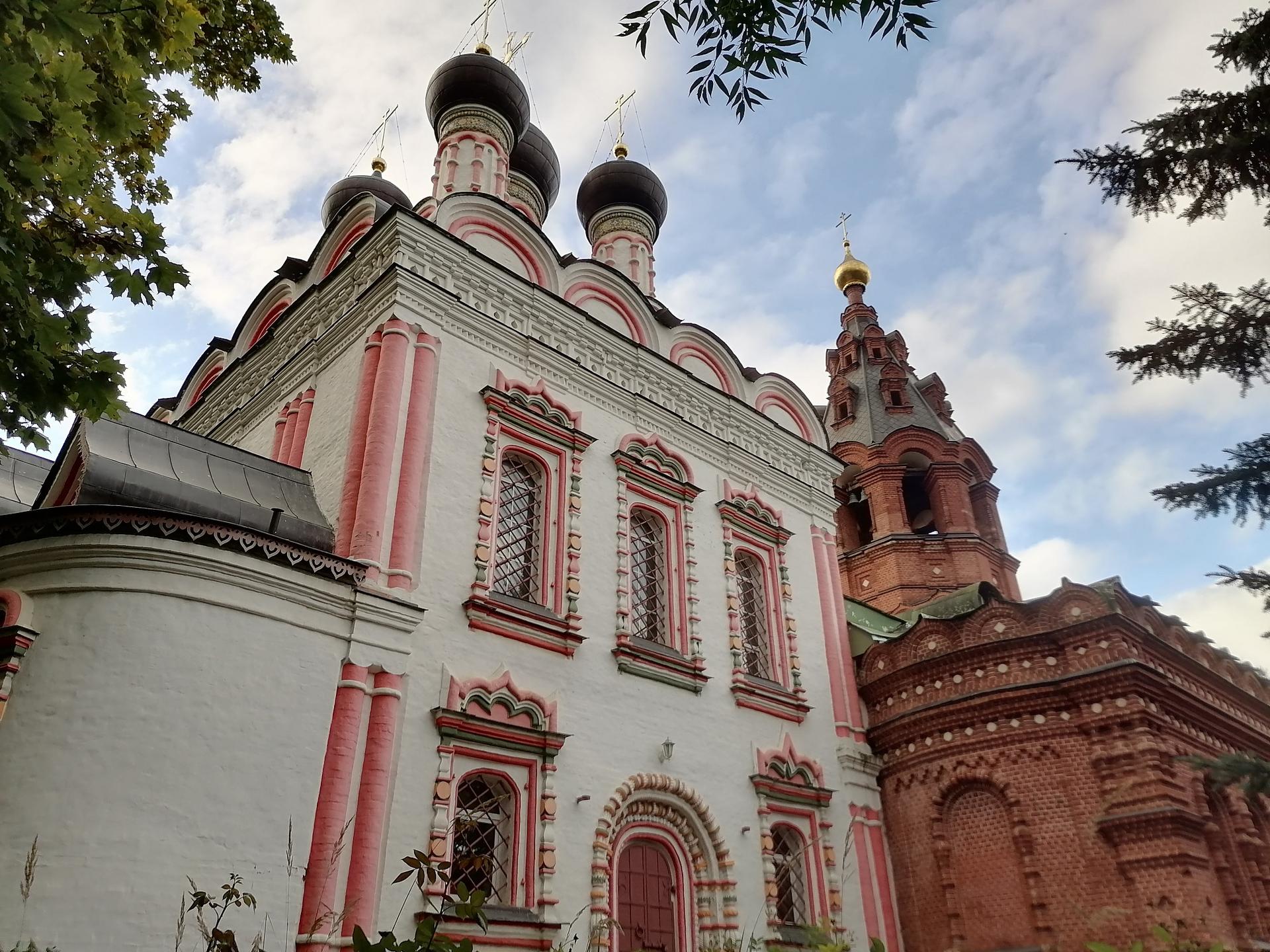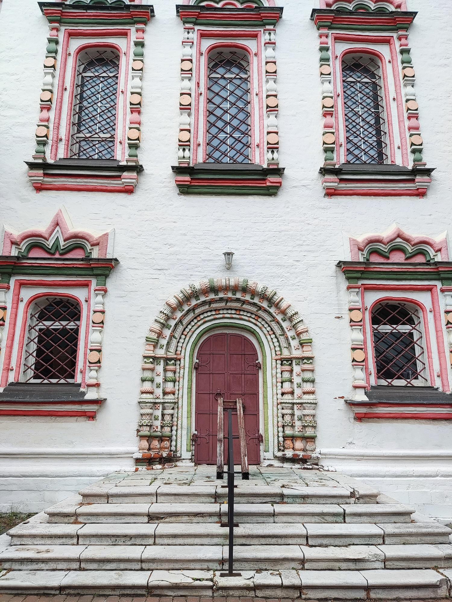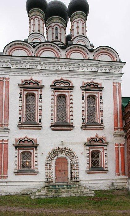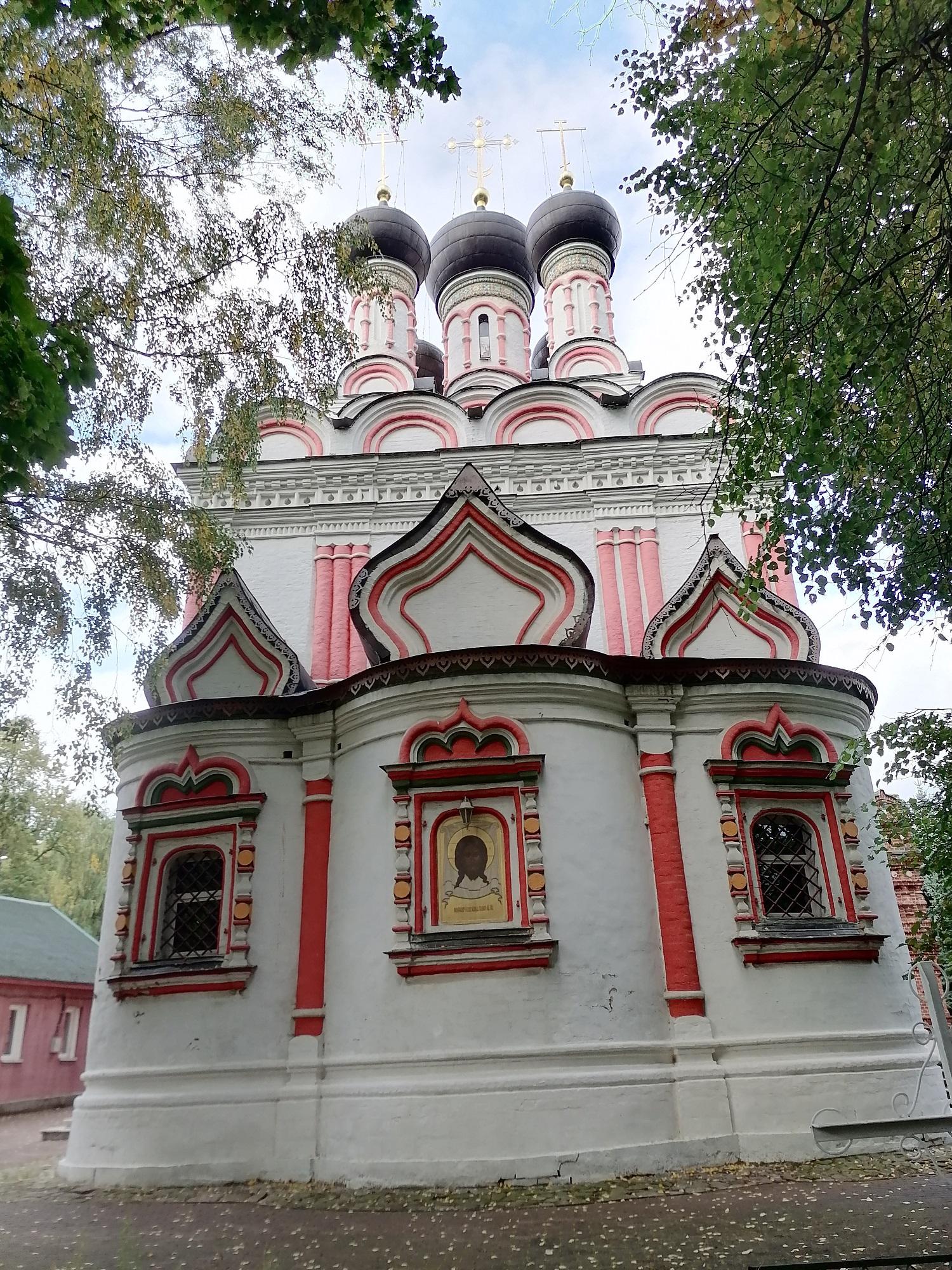 Основная часть храма выдержана стилистике второй половины XVII века: пятиглавый четверик, увенчанный горкой кокошников с двумя рядами окон и входными порталами с севера и с юга. Фасады украшены белокаменной резьбой и пышными оконными наличниками. Кроме того, наличники украшены лучами, исходящими из их верхних частей – прием, характерный для ряда храмов 1680-х годов и знаменующий переход к нарышкинскому барокко. Подобные наличники существовали на церкви Рождества Богородицы в Бутырской слободе, храме Троицы Живоначальной в Останкино, церкви святого Николая Чудотворца в Хамовниках и некоторых других. Впечатление еще более усиливают полихромная раскраска деталей фасадов и глазурованные изразцы на барабанах глав. Первоначально церковь соединялась крытым переходом с домом Матвеева, который присутствовал на богослужениях в своей личной ложе, размещенной в западной стене четверика.