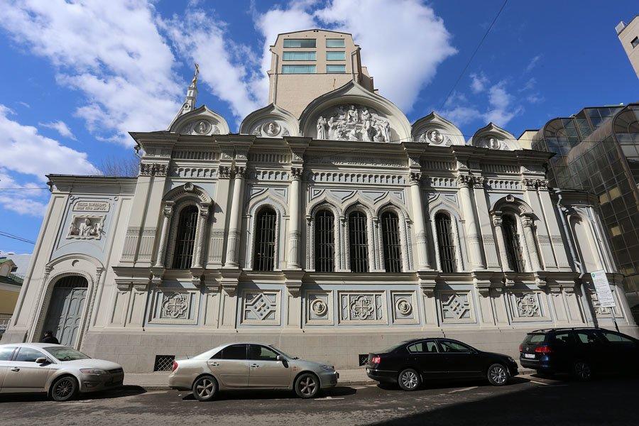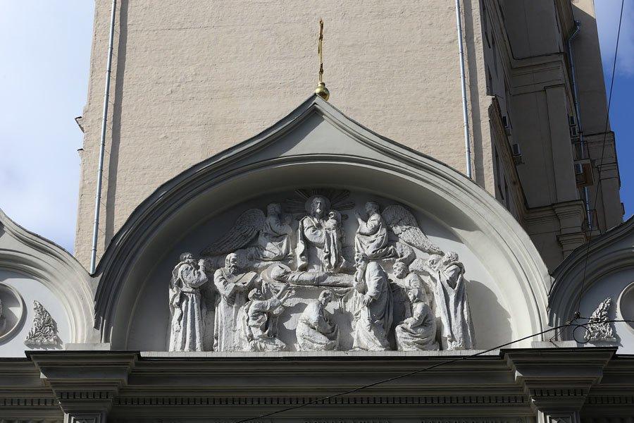 Церковь выделялась своей внутренней отделкой. Вдоль переулка, над южным фасадом возвышался кокошник с барельефами. В таком виде фасад напоминал итальянские храмы эпохи Возрождения. Без сомнения, церковь ориентировалась на новый для тогдашней Москвы храм Христа Спасителя. Фигуры были сделаны из нового для того времени материала – английского портланд-цемента, об этом писал автор работ, скульптор Николай Рамазанов.