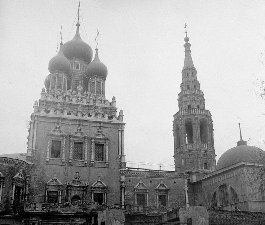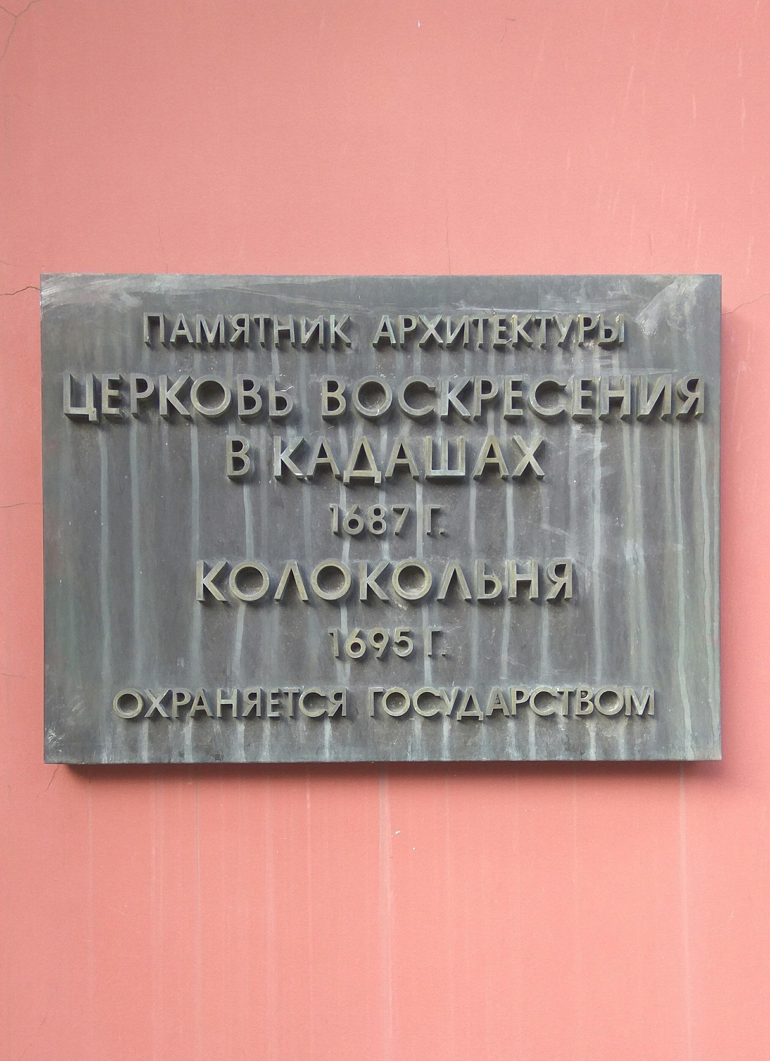Воскресенская церковь в Замоскворечье упомянута впервые в конце XV века как деревянная. Позже, в начале XVII век, появилось название «в Кадашах», когда храм стал духовным центром Кадашевской слободы – крупнейшей в Замоскворечье, пережившей свой расцвет в середине XVII века, в эпоху царя Алексея Михайловича. О высоком уровне благосостояния жителей слободы, среди прочего, свидетельствует и возведение ими вместо старой деревянной церкви каменной, которая упомянута впервые в 1657 году. Однако со временем и этот храм оказался мал для увеличившейся слободы. На его основе, с использованием части стен, была выстроена новая двухъярусная церковь с главным храмом во имя Воскресения Христова наверху и приделом Успения Богородицы внизу (в 1860-е годы в нижнем ярусе появилось ещё два придела – святого Николая Чудотворца и Тихвинской иконы Божией Матери). Строительство, начатое в 1687 году, было завершено в 1695 году, когда церковь освятил патриарх Адриан. В том же году с западной стороны к церкви пристроена колокольня. Храмоздателями, на чьи средства появилась новая церковь, были купцы Кондрат Добрынин и его сын Лонгин.