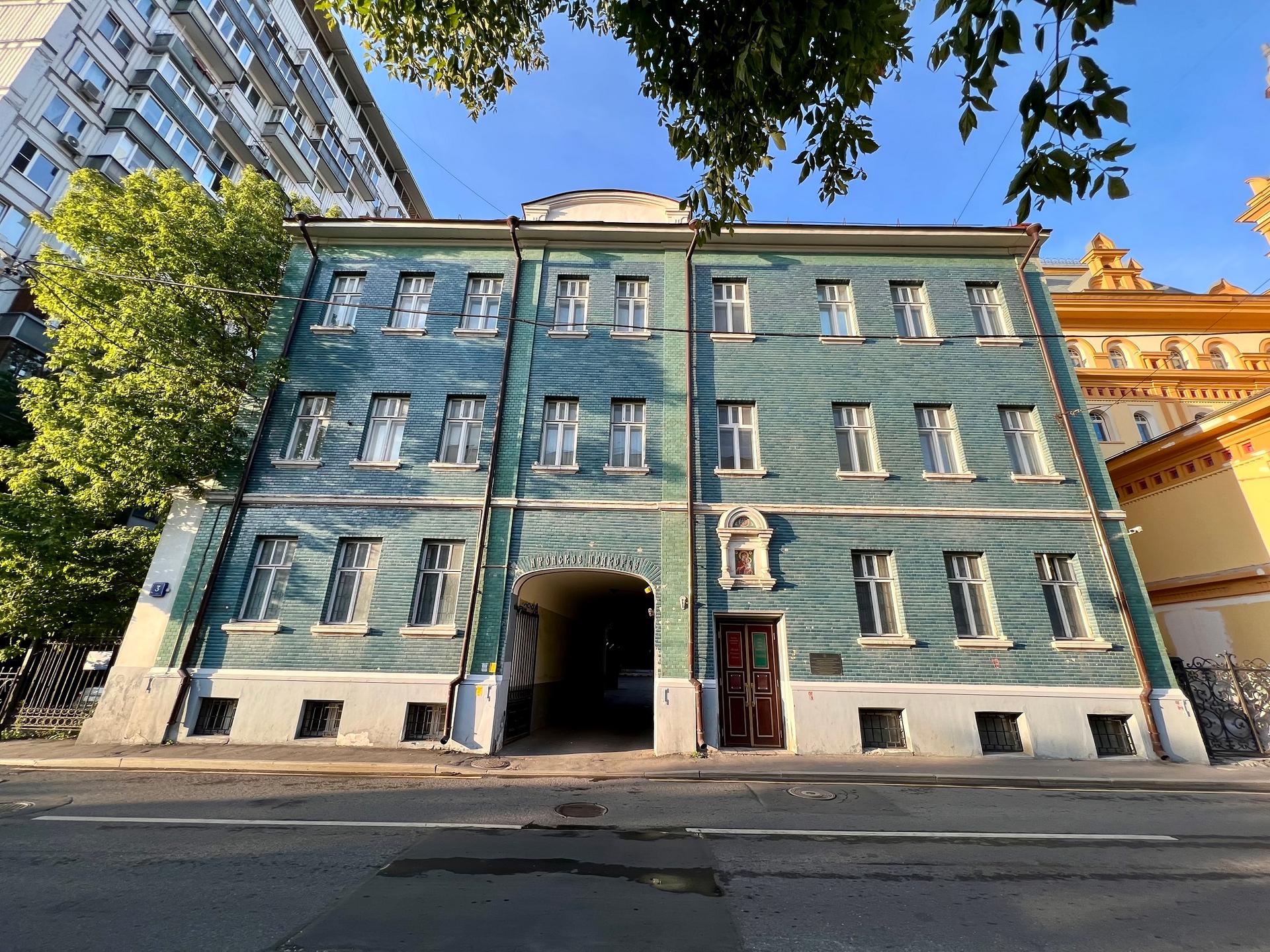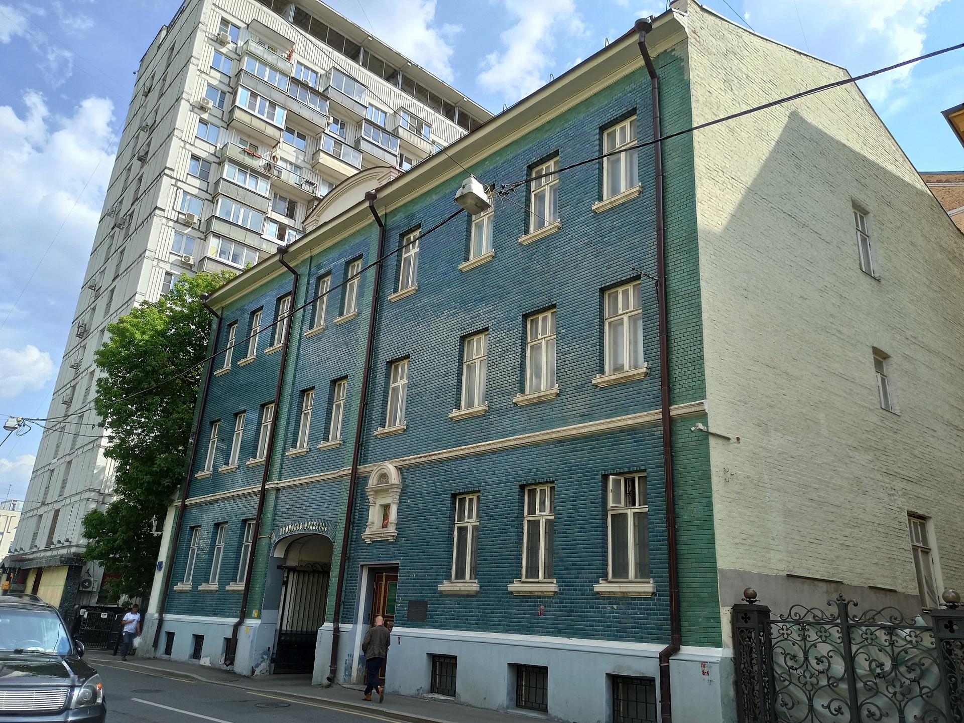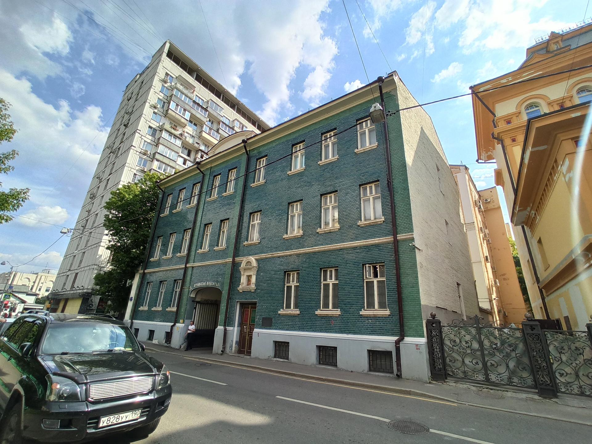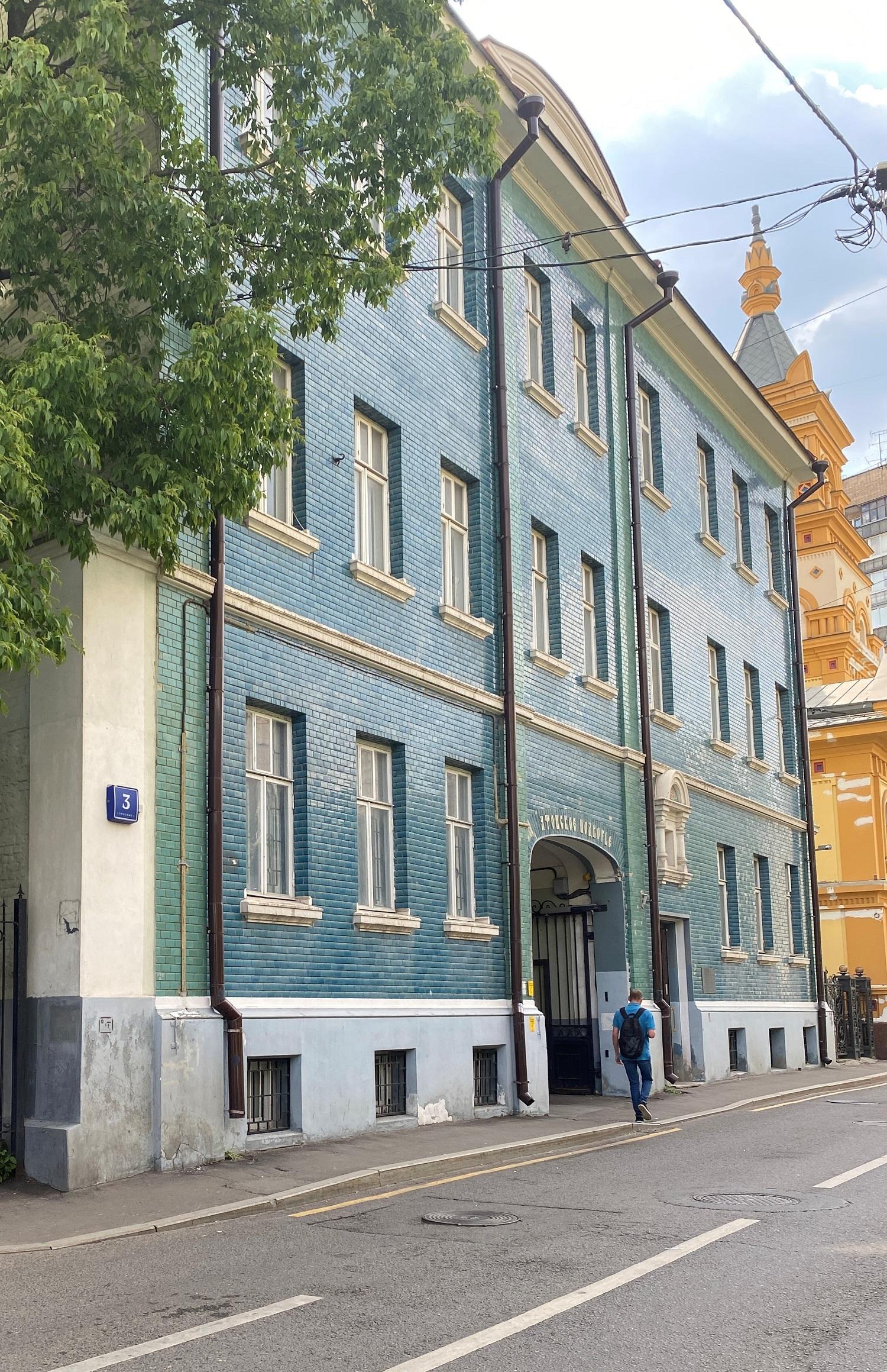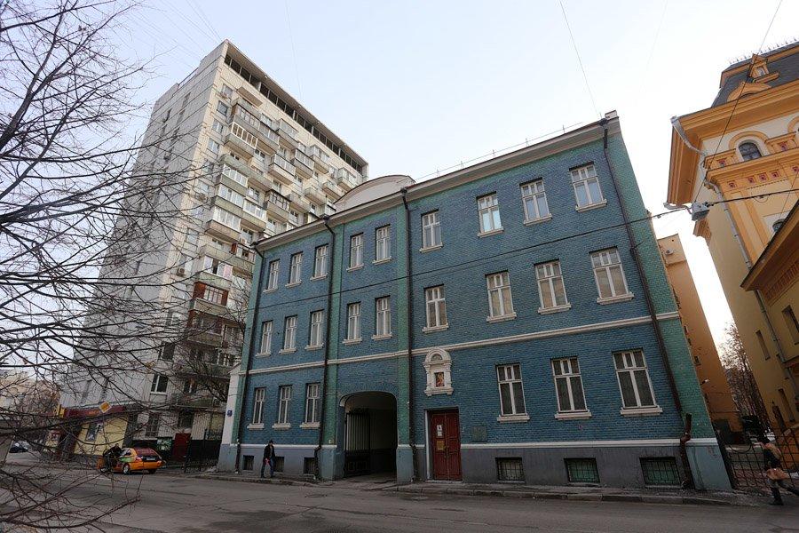 1-й Хвостов переулок утратил значительную часть своей дореволюционной застройки. Поэтому трехэтажный дом темно-зеленого цвета хорошо заметен. Над входом в него виден киот с иконой – это подсказка о происхождении здания.