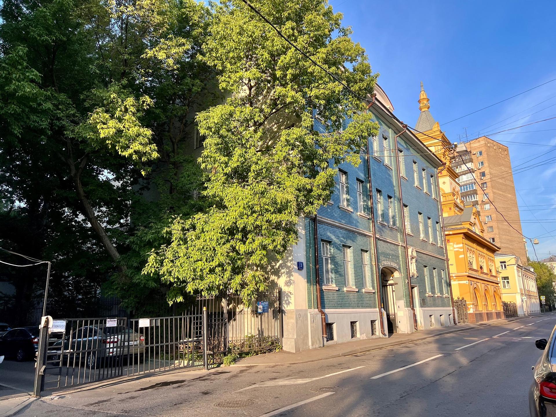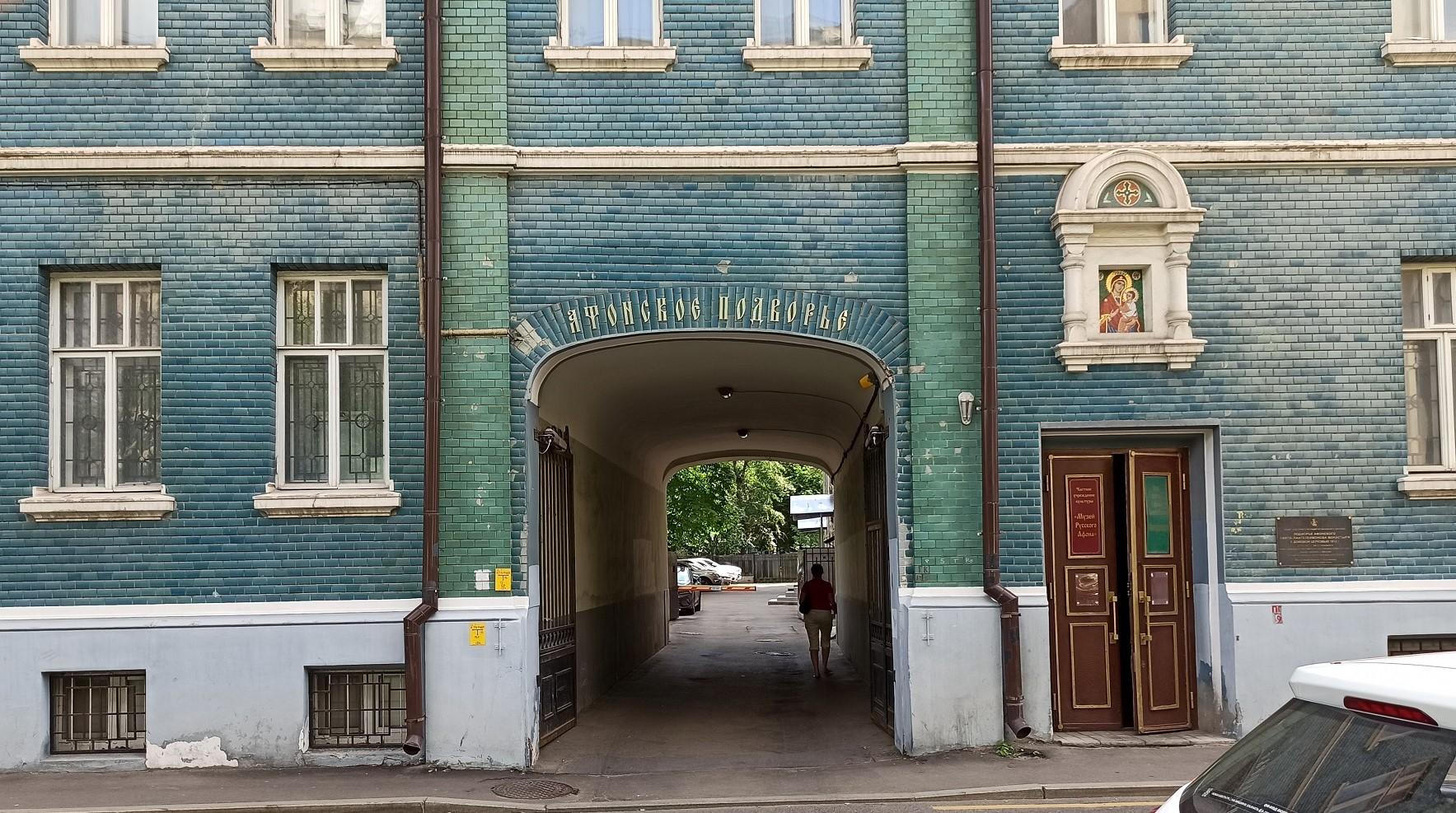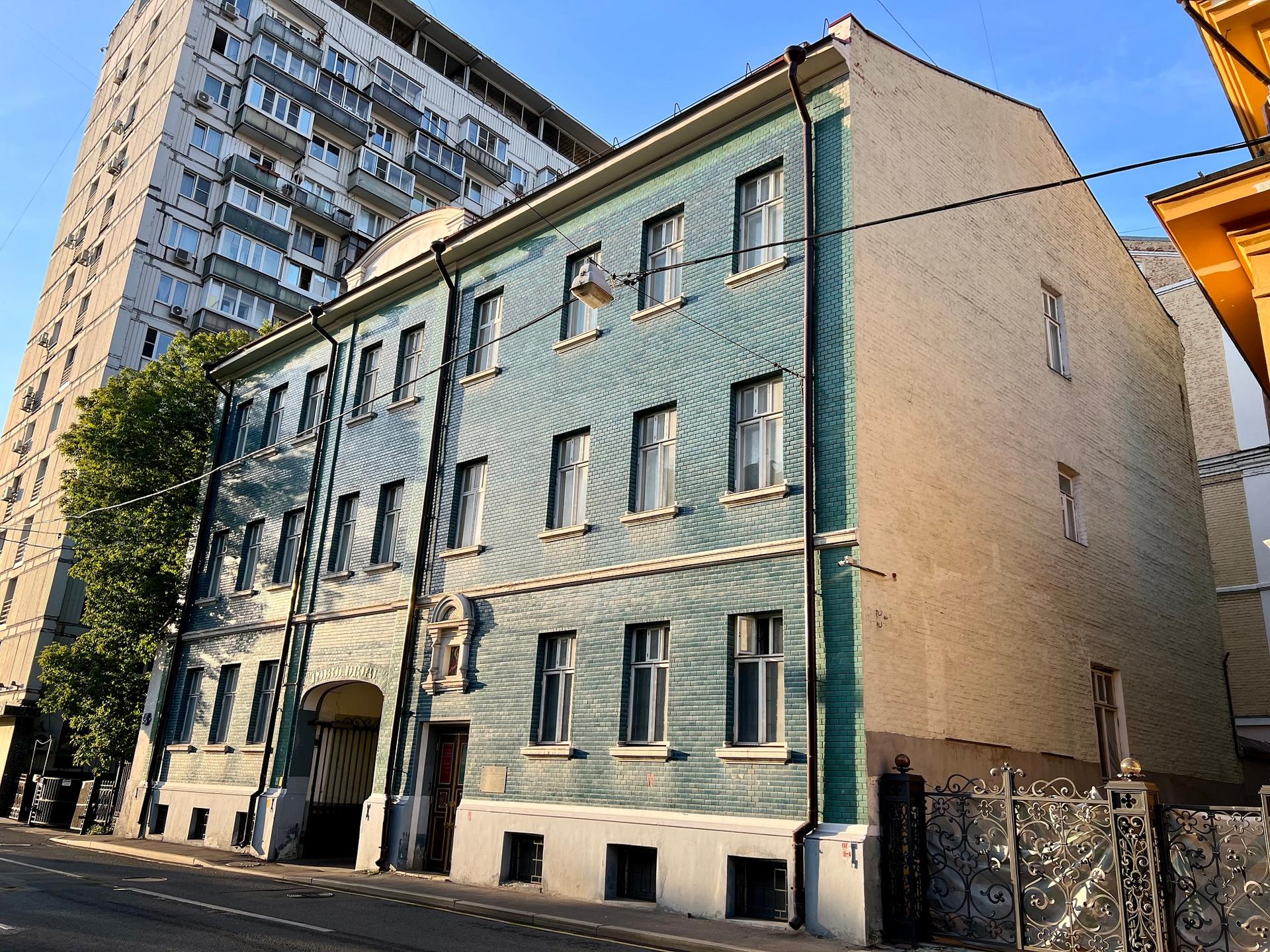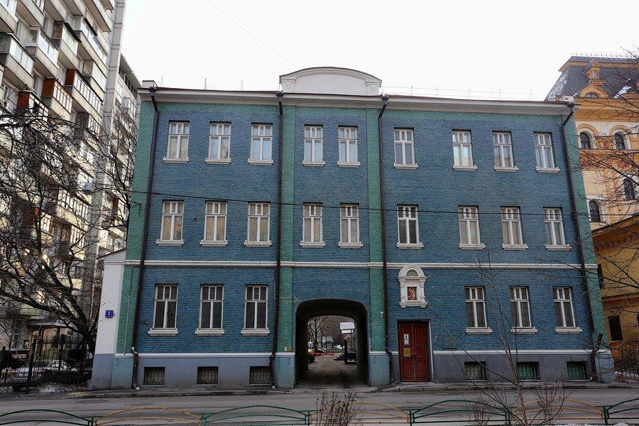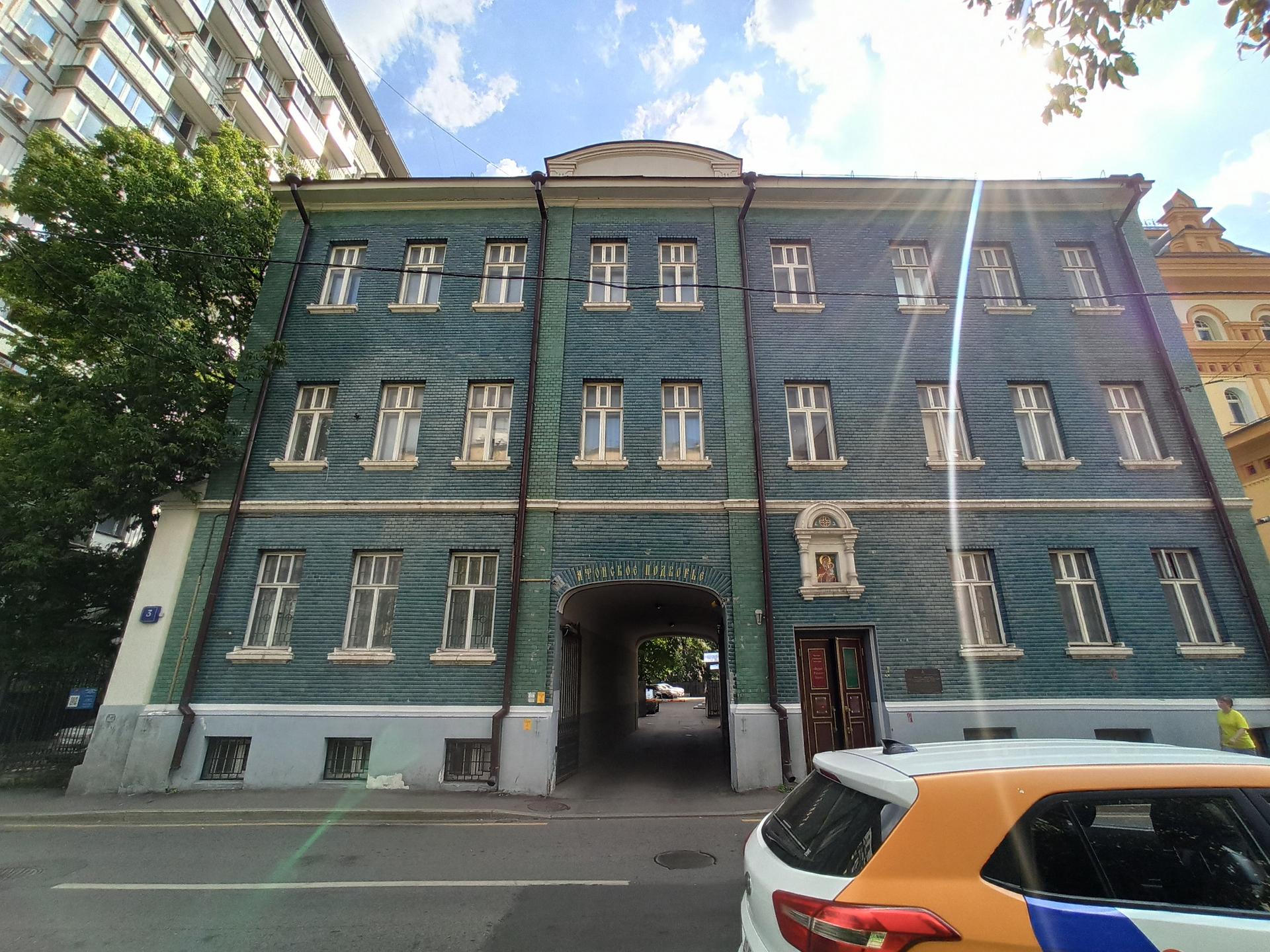 1-й Хвостов переулок утратил значительную часть своей дореволюционной застройки. Поэтому трехэтажный дом темно-зеленого цвета хорошо заметен. Над входом в него виден киот с иконой – это подсказка о происхождении здания.