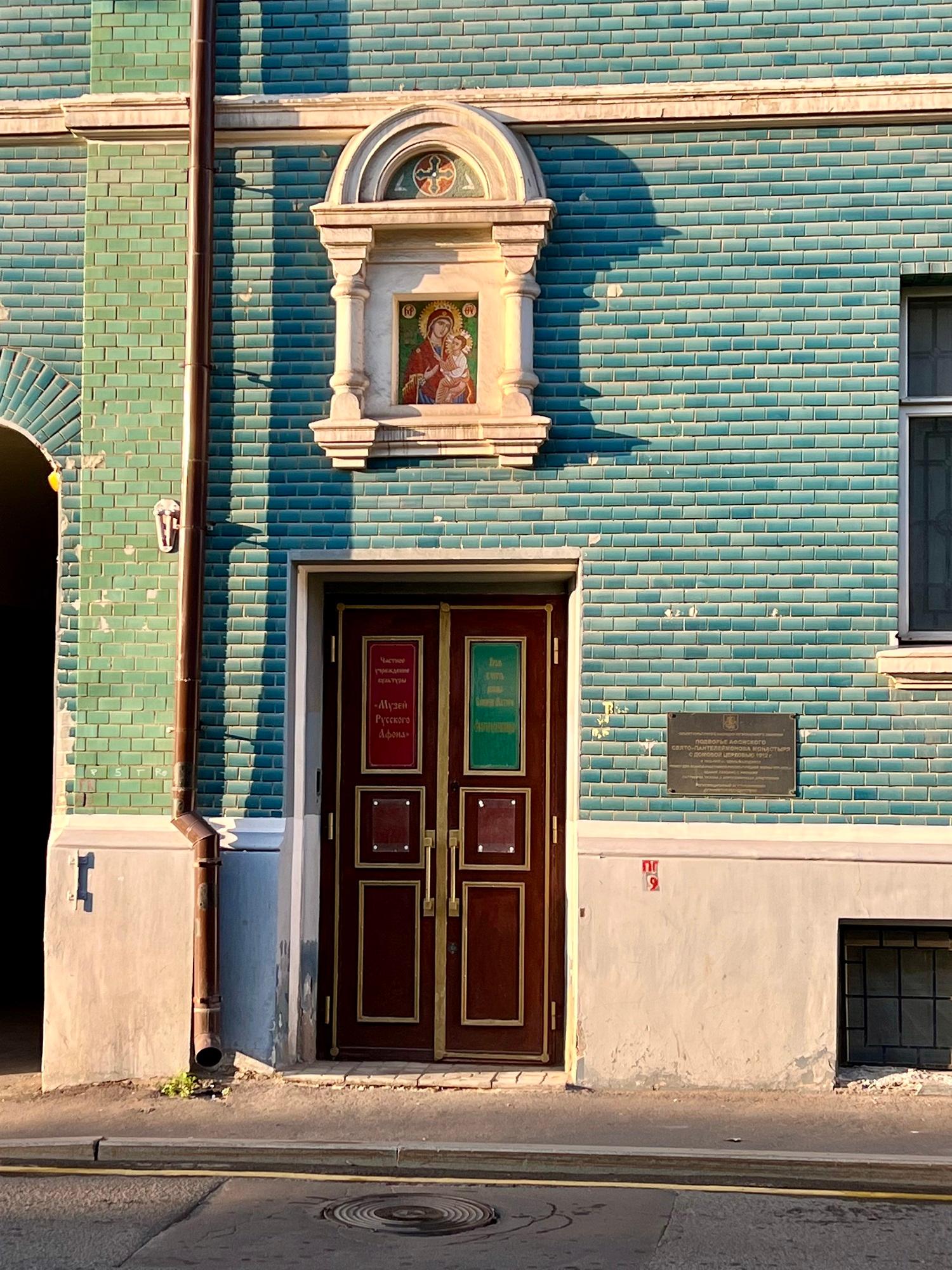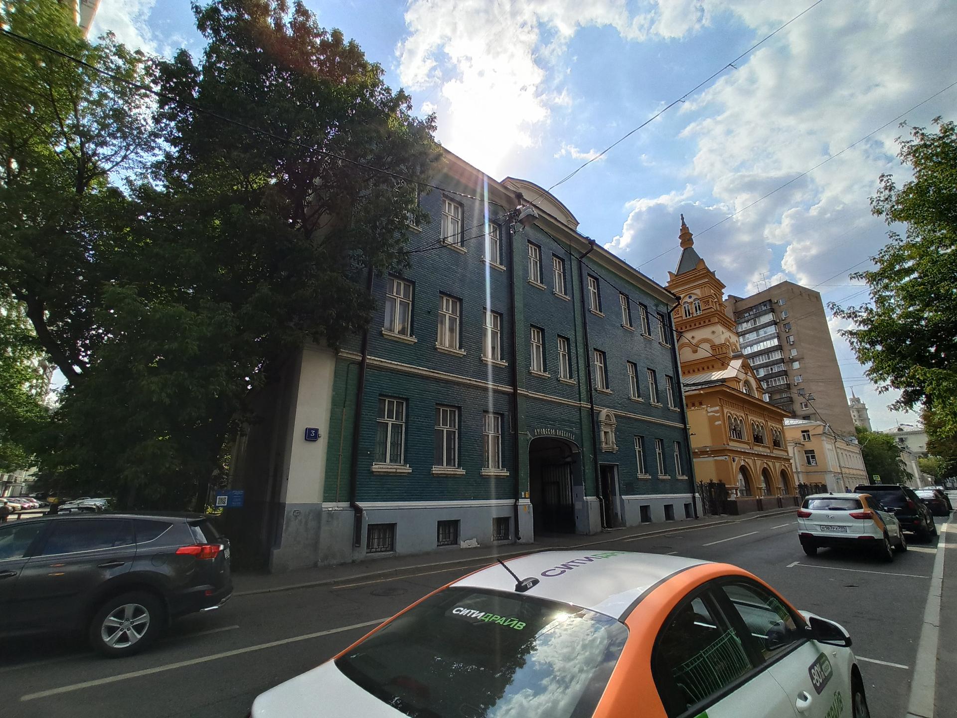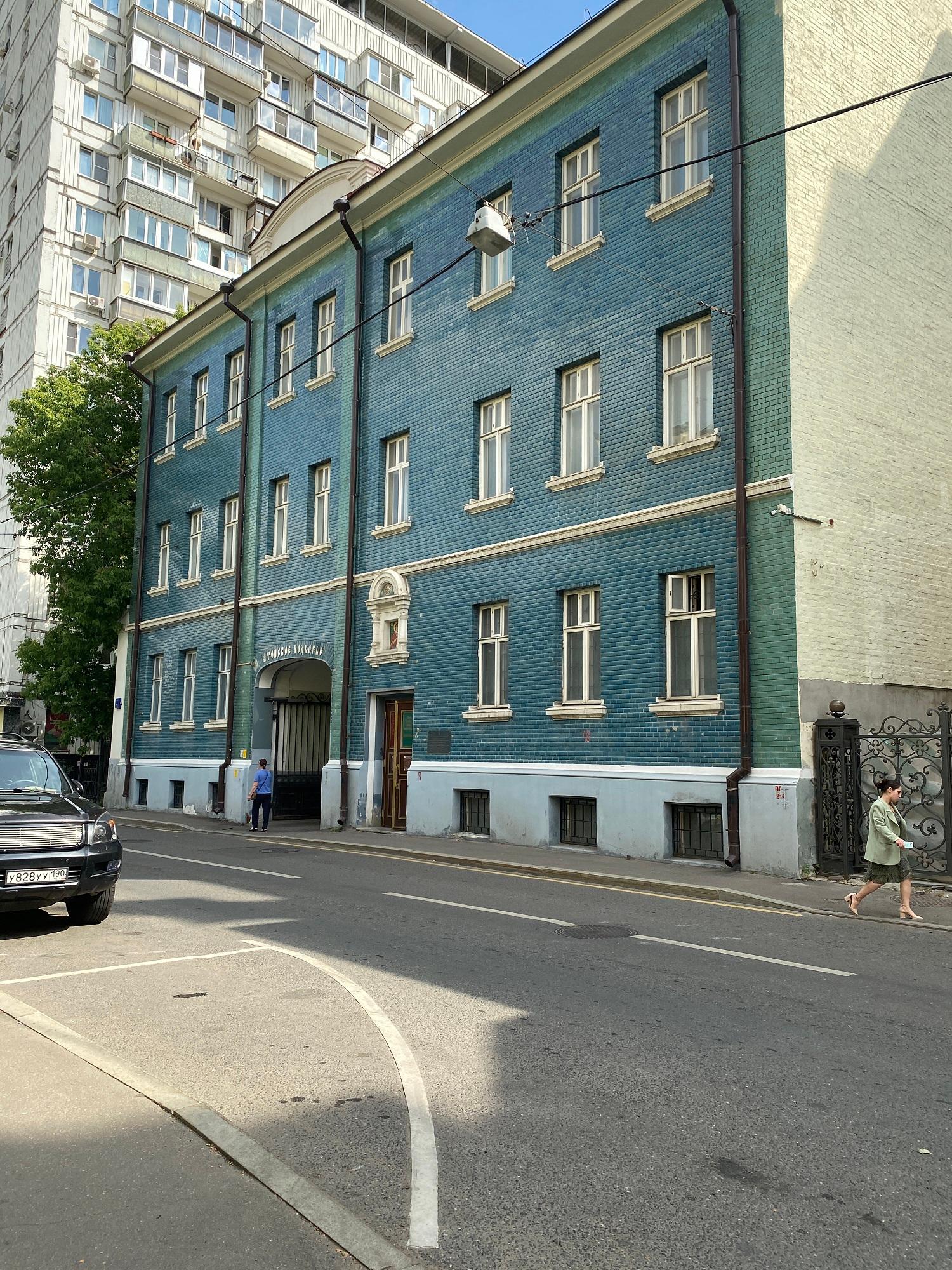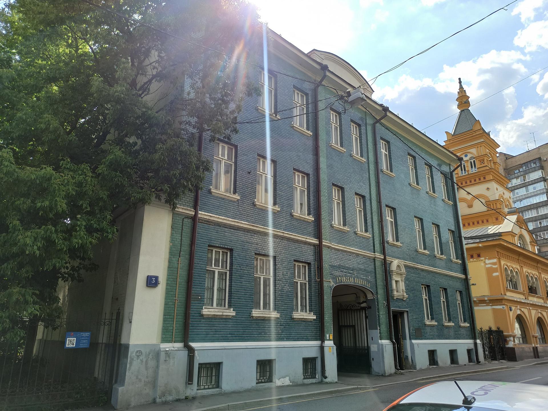 1-й Хвостов переулок утратил значительную часть своей дореволюционной застройки. Поэтому трехэтажный дом темно-зеленого цвета хорошо заметен. Над входом в него виден киот с иконой – это подсказка о происхождении здания.