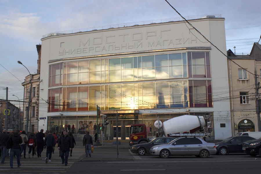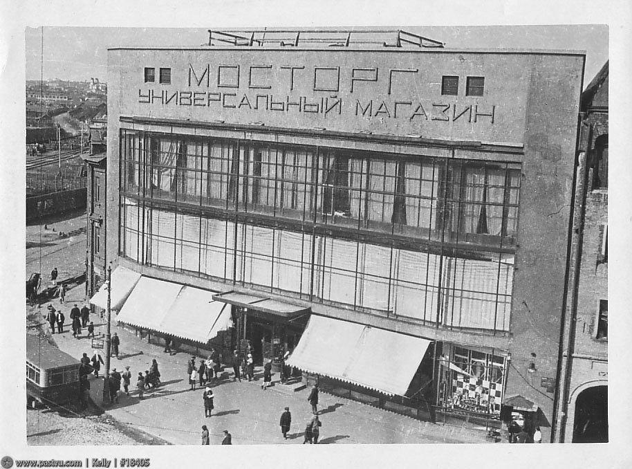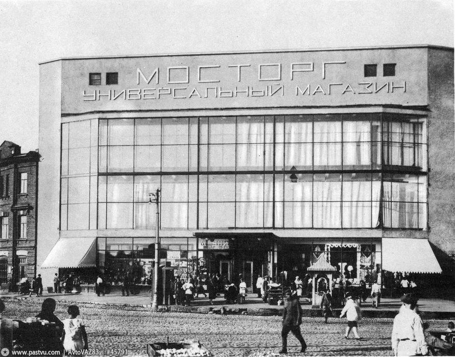 В эти годы в бывших окраинных районах Москвы строятся универмаги Мосторга – одной из старейших торговых организаций Советской России. Мосторг был создан в 1921 г. как Управление торговли Моссовнархоза (МСНХ), и уже в следующем году реорганизован в Московское торговое товарищество на паях. К 1929 году в системе Мосторга было, кроме центрального, 9 районных универмагов, несколько магазинов строительных материалов, металлических изделий, ювелирных и др. Универмаги Мосторга представляли собой, как правило, угловые здания на пересечении радиальных магистралей с кольцами Садовых, Валов, Новым Бульварным и Парковым.