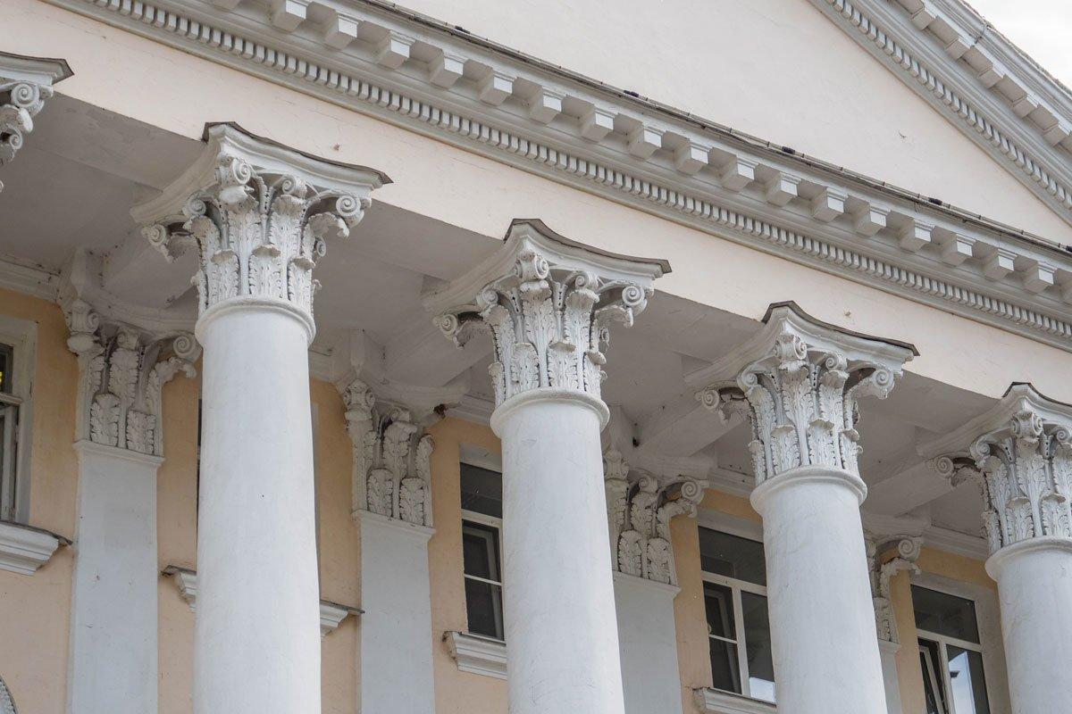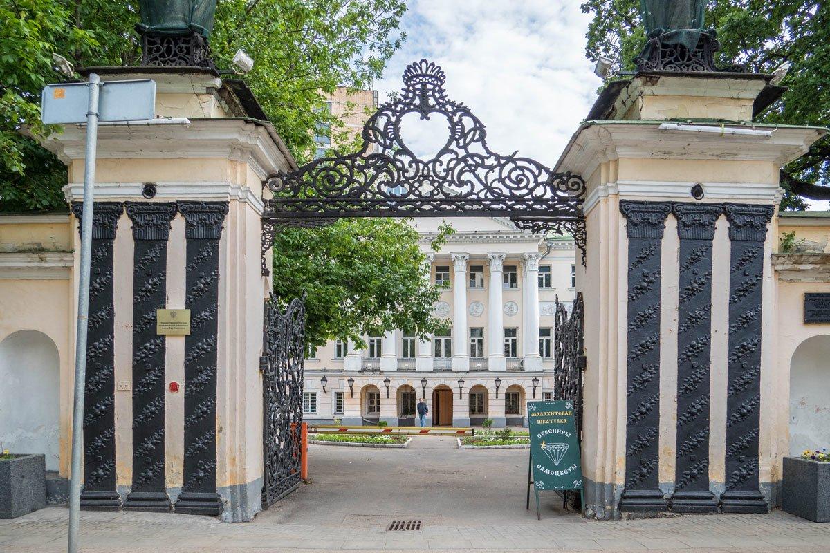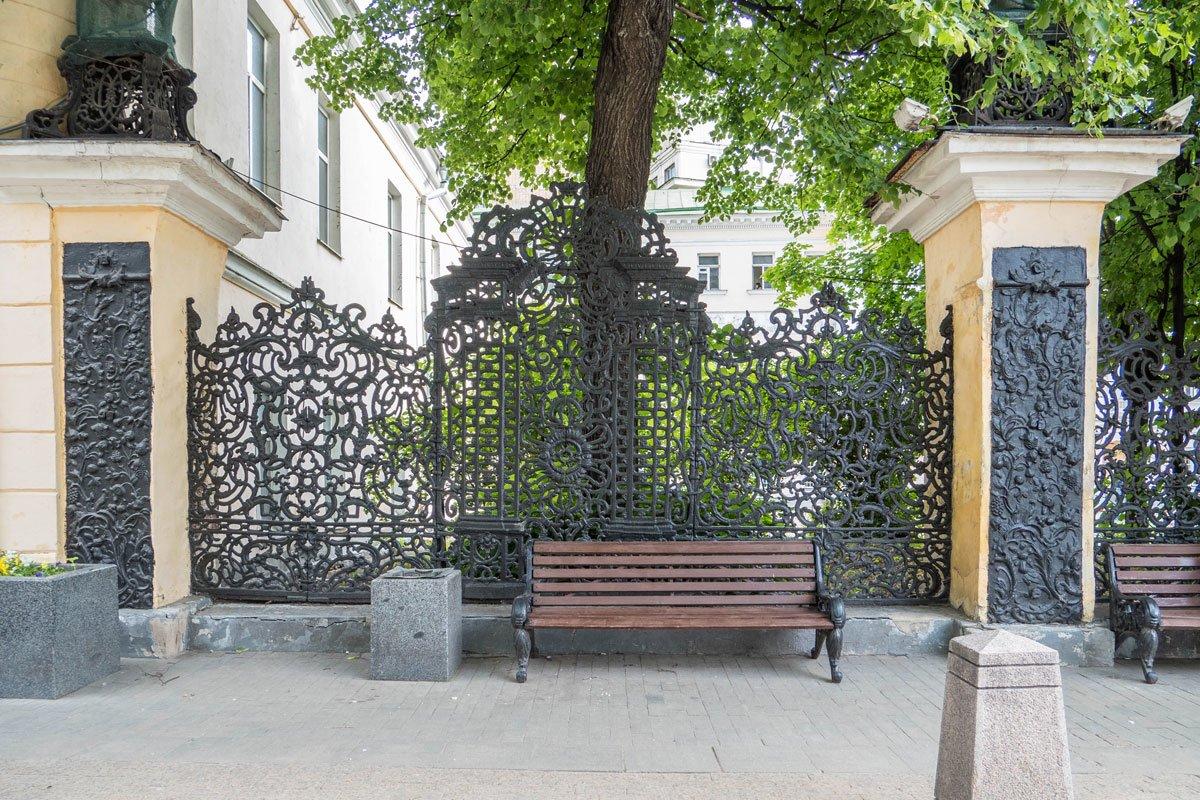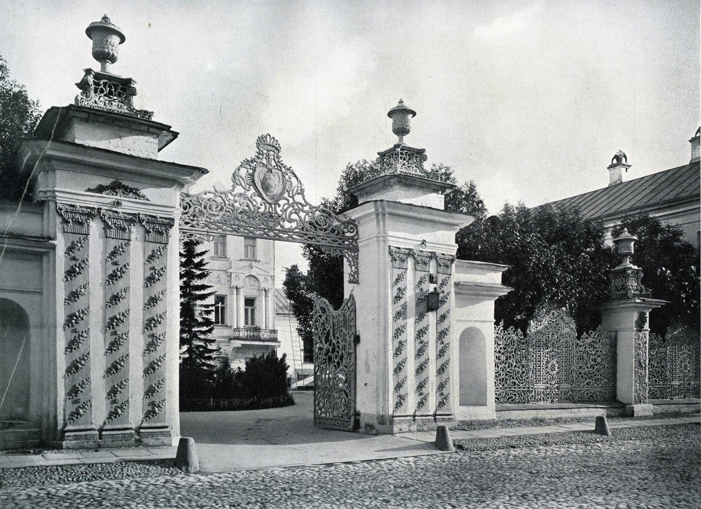 Чтобы внимательно рассмотреть нарядные украшения парадного фасада, необходимо зайти во двор. Аркатура нижнего рустованного этажа держит выдвинутый вперед шестиколонный портик коринфского ордера. Центральная часть фасада за портиком украшена пятью круглыми барельефными медальонами аллегорического содержания. Крайние окна второго этажа декорированы спаренными коринфскими пилястрами, арочными нишами и небольшими фронтонами со скульптурной вставкой. Но главное украшение усадьбы – превосходная чугунная ограда, чудо литейной мысли XVIII века. Эта уникальная ограда, всегда остававшаяся объектом восхищения и любования москвичей, была отлита мастером А.Т. Сизовым на одном из уральских демидовских заводов в 1760-х годах по чертежам архитектора Ф.С. Аргунова.