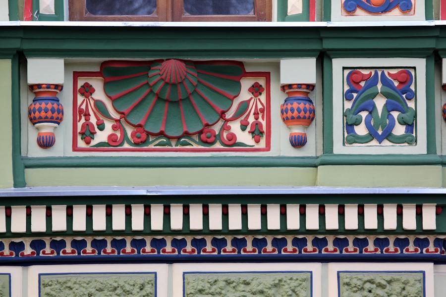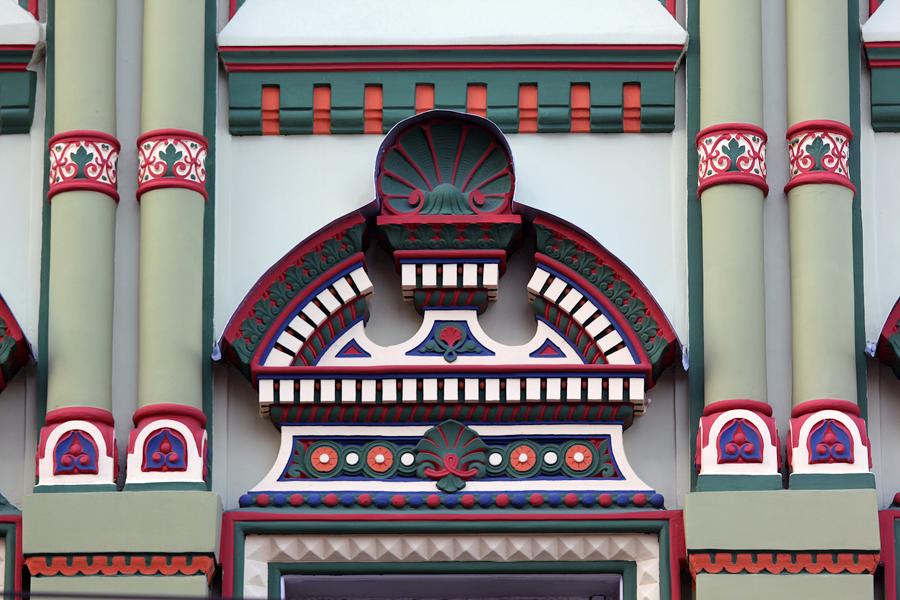 Дом на Новой Басманной в период владения Шибаевыми претерпел значительные изменения благодаря проекту архитектора Александра Степановича Каминского. Фасад здания получил новое оформление в псевдорусском стиле: окна второго этажа украсили наличники с изысканным завершением, вместо пилястр появились сдвоенные полуколонки, углы здания также были оформлены полуколонками. Главный фасад венчал аттик сложной формы и две стилизованные башенки по углам дома. Все декоративные элементы фасада были выполнены из терракоты и раскрашены в разные цвета, что придало дому нарядный и яркий облик, выделявший его среди прочих зданий на улице.