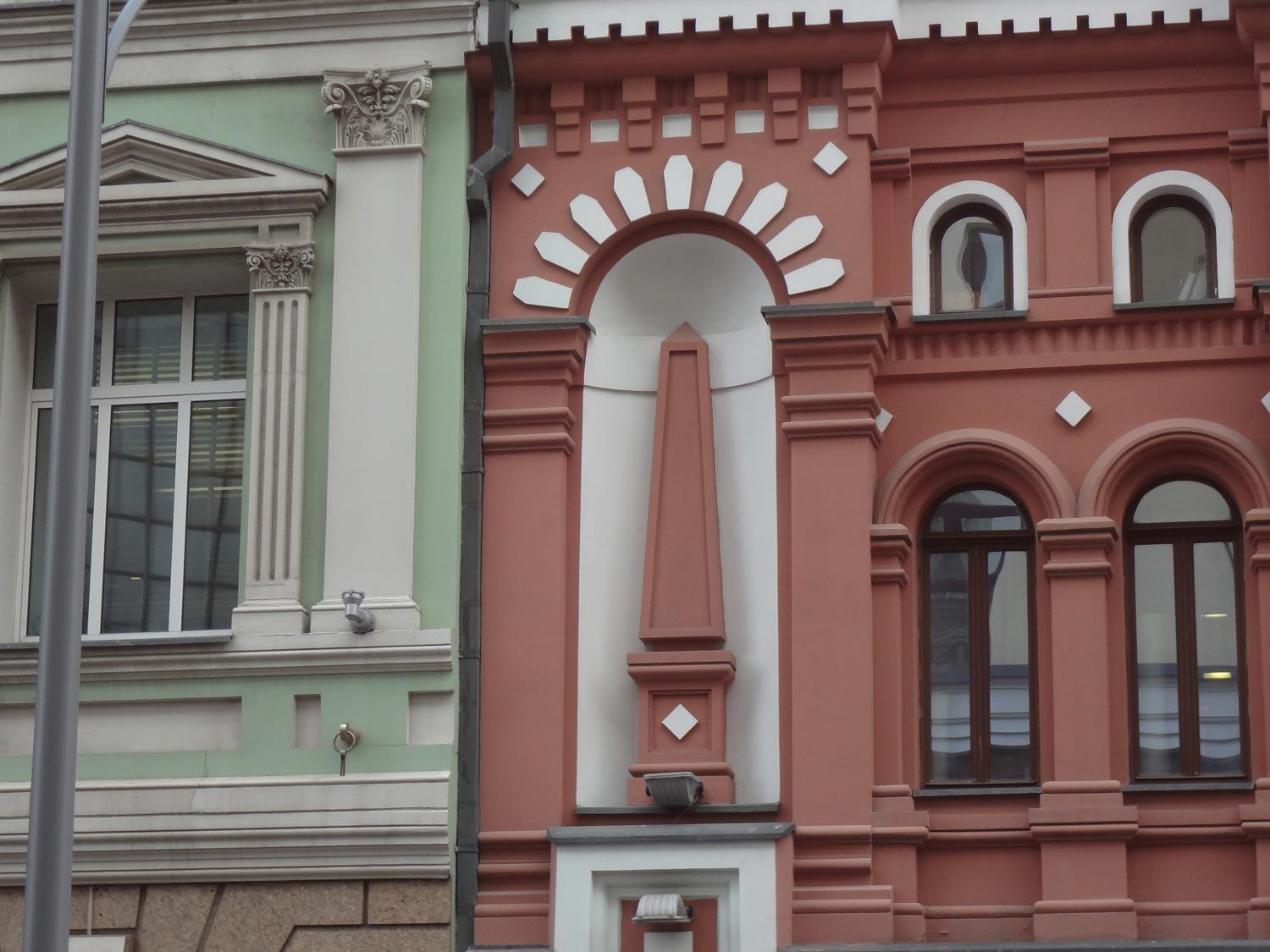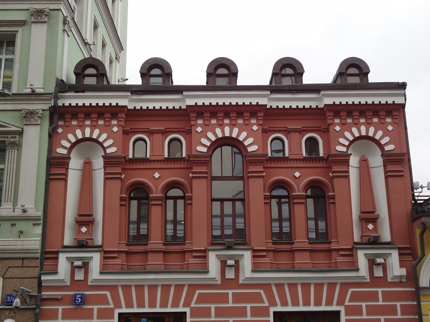 Сегодня, когда мы прогуливаемся по улице, нам ничто не напоминает об этих неблагополучиях. Да и новая архитектура 90-х годов не настраивает на исторический лад. И все же, немного пройдя, мы видим небольшой трехэтажный дом явно исторической архитектуры. Небольшой фасад высотой в три этажа «зажат» между большим домом и прилегающими строениями XIX века, напоминающими каменные лавки в стиле ампир. Архитектура самого здания эклектична, что характерно для второй половины XIX века. В это время многие усадьбы эпохи классицизма перестраивались в соответствии с духом времени, в котором определяющей была эклектика.