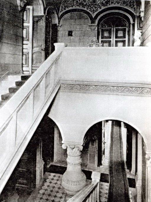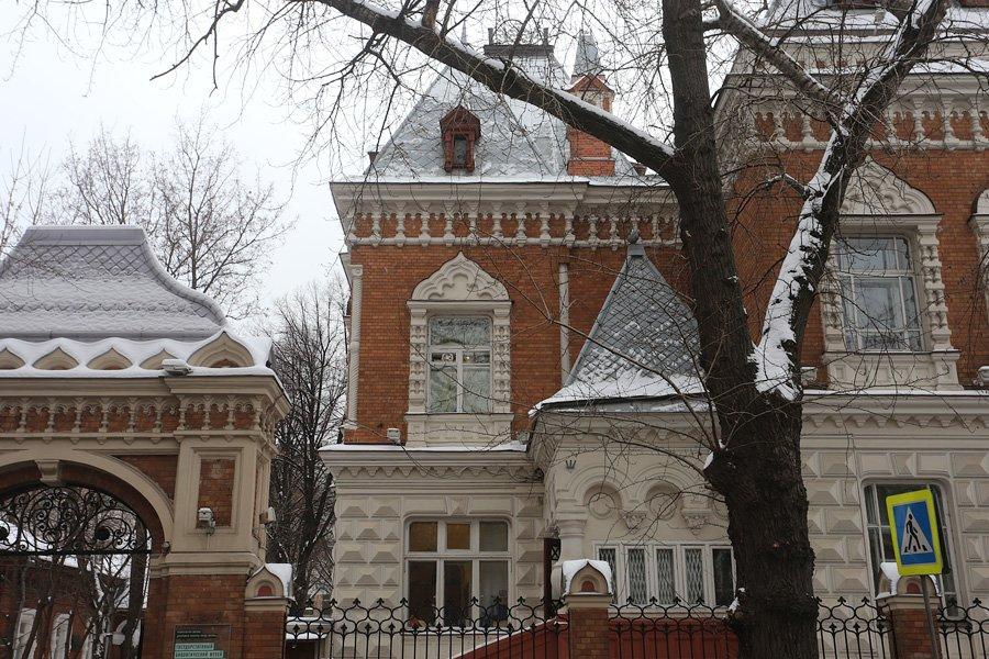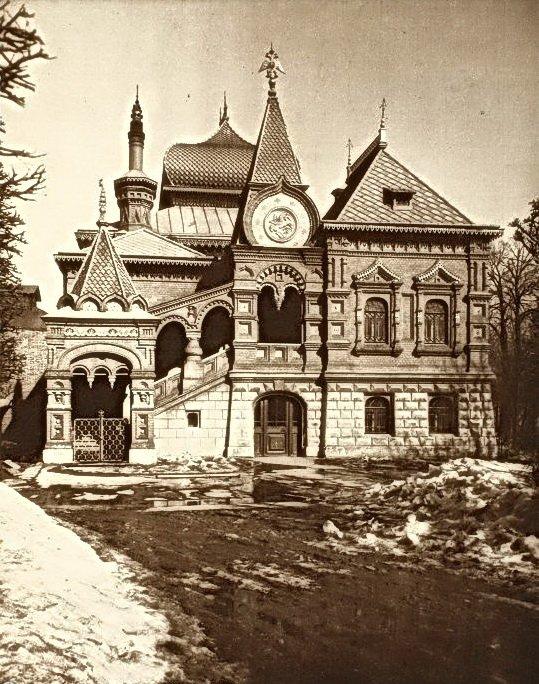 Строительство шло в несколько этапов и при участии различных зодчих. Первое здание было возведено в 1892–1893 гг. в глубине участка Б.В. Фрейденбергом. В духе ярославского зодчества, он построил «древнерусский терем» — со ступенчатым шатровым крыльцом, крышами «в шахматы», флюгерами в виде флажков и двуглавых орлов. На восточном фасаде был выполнен миниатюрный балкон — копия балкона палат бояр Романовых на Варварке. Верхний этаж был отделан кирпичом с многоцветными изразцами и круглым медальоном с барельефом в виде крылатого единорога, а нижний украшен «бриллиантовым» (четырехгранным) рустом. Аналогичны интерьеры: росписи по сводам с растительным мотивом, изразцовые печи и «дыньки».