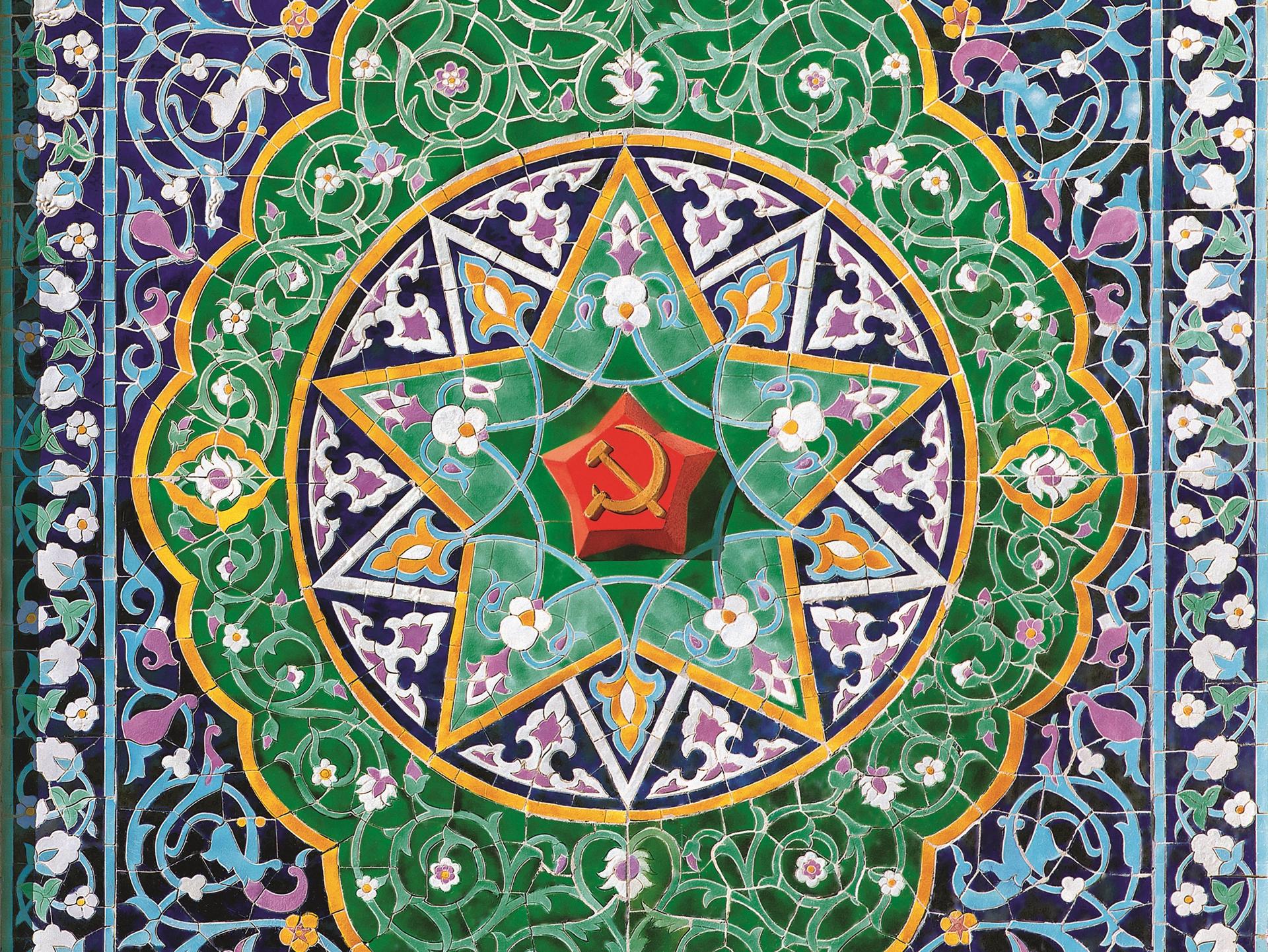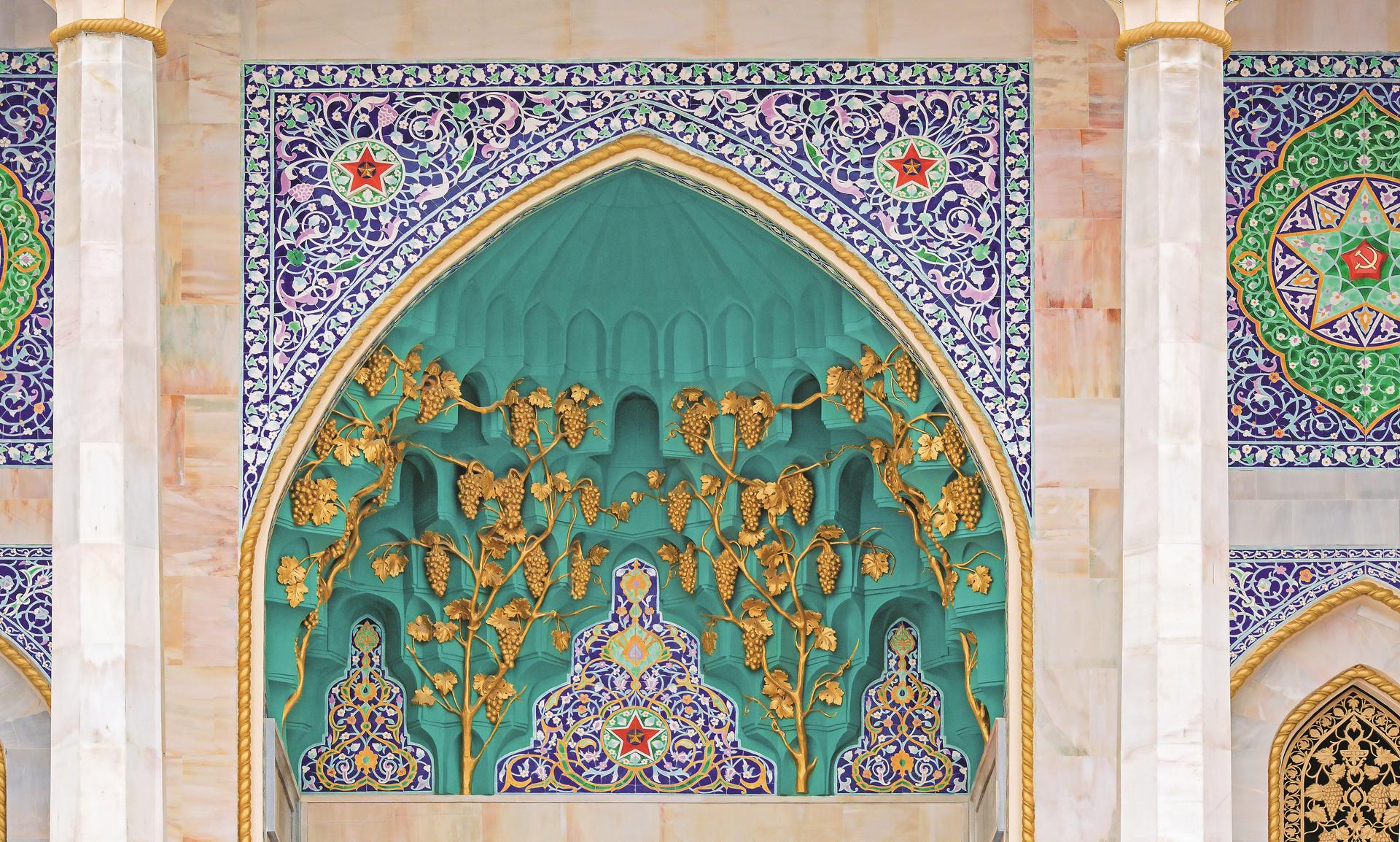 Павильон отличается использованием разнообразных декоративных традиций, характерных для Центральной Азии и Ирана. Внутренние стены портика декорированы геометрическими и растительными узорами, выполненными из цветной майолики. Узнаваемые восточные мотивы аккуратно дополнены советской символикой — красными звёздами, серпами и молотами. Характерный «сталактитовый» полукупол в нише над входной дверью украшен виноградными гроздьями. Тот же «сталактитовый» мотив применён в оформлении капителей двух колонн главного фасада. Портал облицован кремовым мрамором Газганского месторождения.