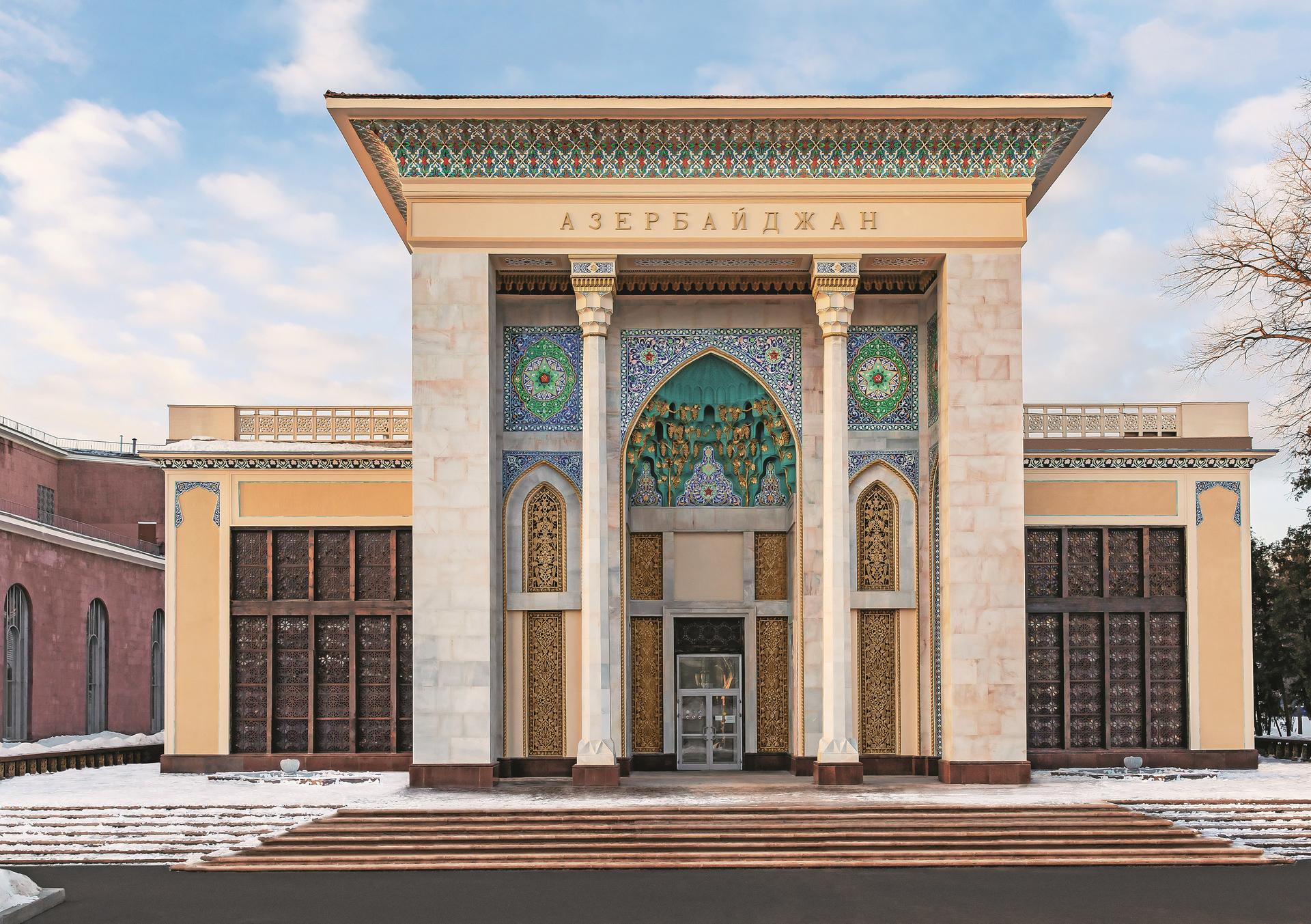 В оформлении павильона приняли участие как московские, так и республиканские художники и скульпторы, а также народные мастера Азербайджана. Благодаря их совместным усилиям здание приобрело неповторимый облик, сочетающий в себе элементы традиционной азербайджанской архитектуры и советского монументального искусства.