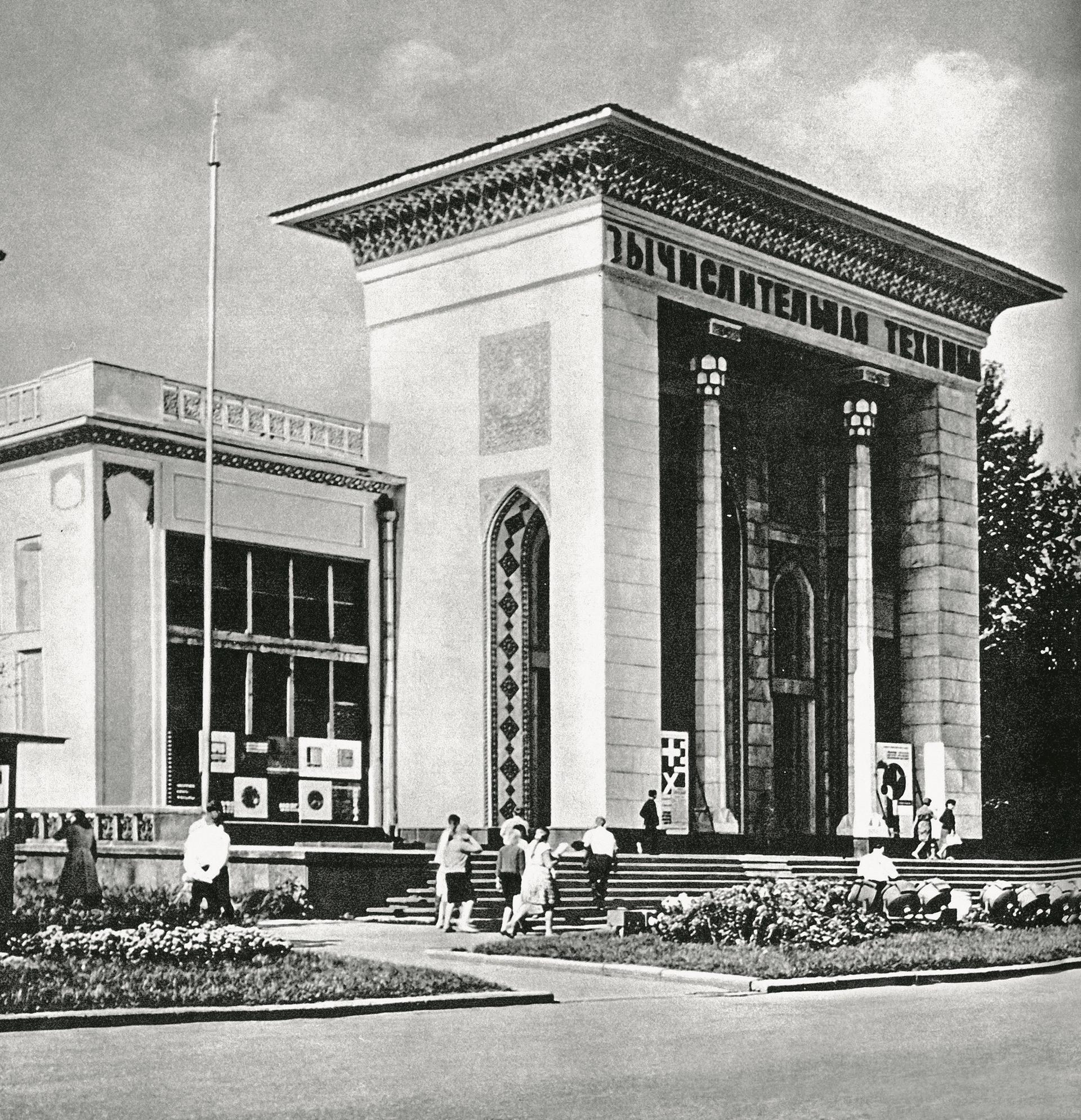 Однако в конце 1960-х годов, как и многие другие национальные павильоны ВДНХ, он подвергся «осовремениванию». В 1967 году роскошные фасады с полихромной майоликой и искусной резьбой были закрыты прямоугольным фасадом-ширмой из лёгкого бетона. Восточный оазис превратился в экспозицию «Вычислительной техники», о чём свидетельствовала соответствующая надпись на новом фасаде.