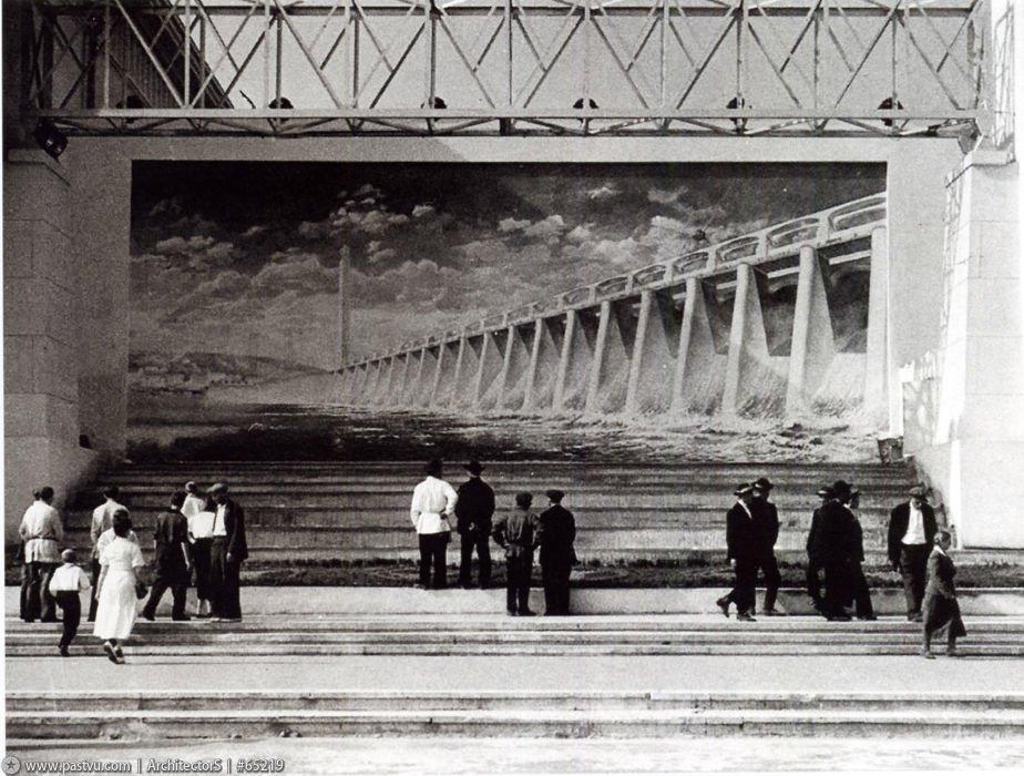 Крышу венчала скульптурная композиция «Рабочий и колхозница» с гербом РСФСР. Вход в павильон украшала витражная карта Поволжья с изображением Волго-Донского канала и газопровода Саратов — Москва. Из-под витражей с изображениями Сталинградской и Куйбышевской гидроэлектростанций на стенах боковых крыльев павильона били струи фонтанов, вода с шумом стекала по покрытым мозаикой ступеням в небольшие бассейны, облицованные голубым стеклом. Так символично была показана работа гидроэлектростанций. Особенно эффектно витражи и фонтаны смотрелись по вечерам, когда зажигалась подсветка. И оформление фасада, и убранство павильона объединяла тема воды, реки Волги.