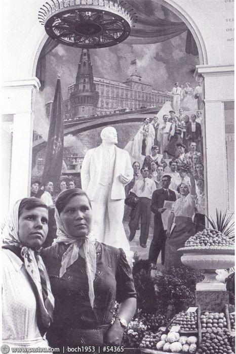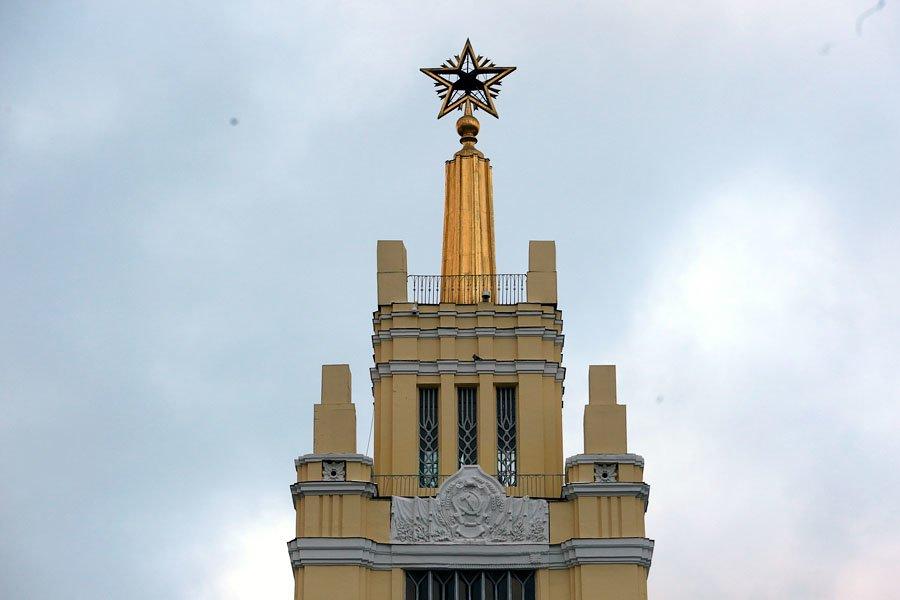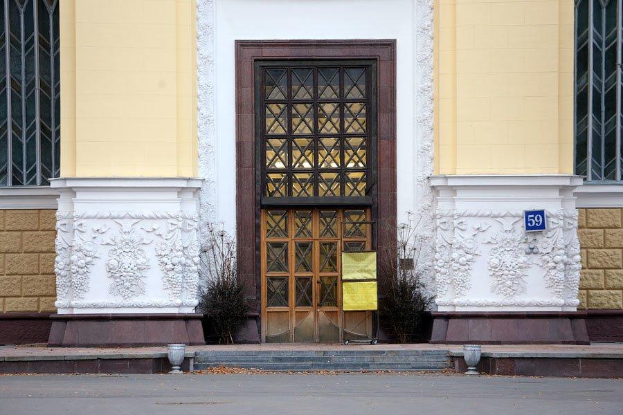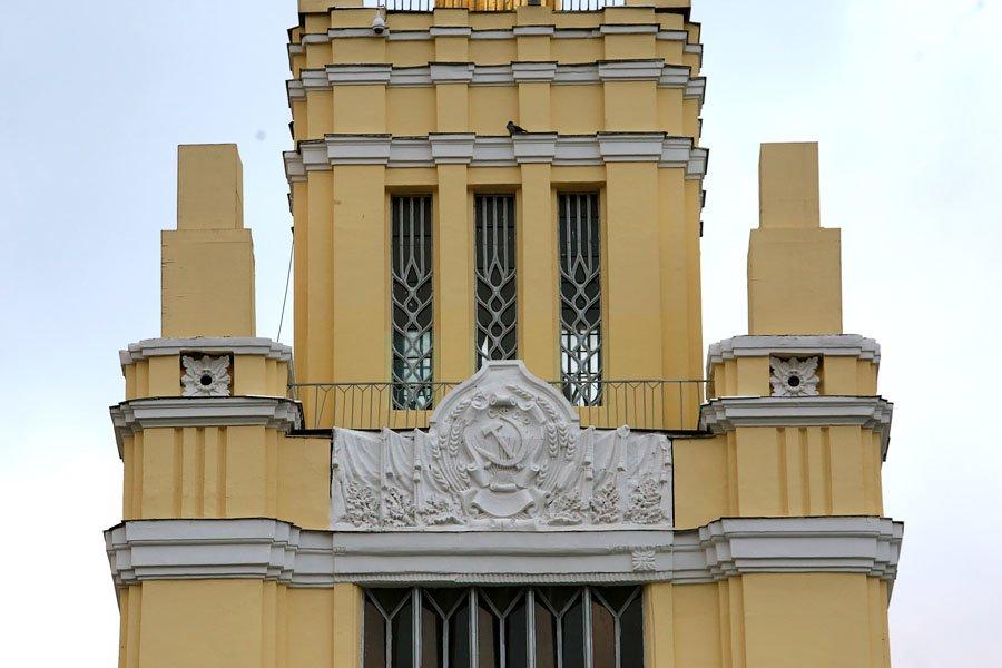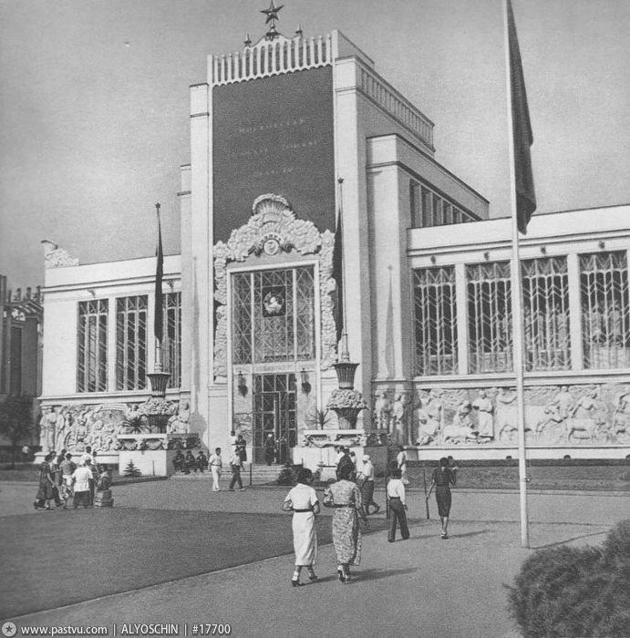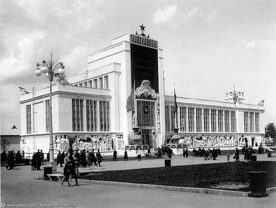 Изначально павильон был построен из камня, бетона и зеркального стекла. Его украшением стали огромная рубиновая звезда на ризалите и идущие по фасаду барельефы с фигурами овощеводов, доярок, садоводов и трактористов.