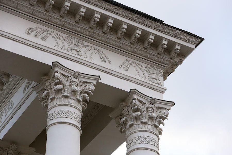 Павильон украшен стройным портиком с открытой аркадой с сужающимися книзу колоннами. В резьбе капителей используются мотивы древнего античного храма, однако за колоннами фасад имеет высокие окна с декором, характерным скорее для европейского ар-деко.