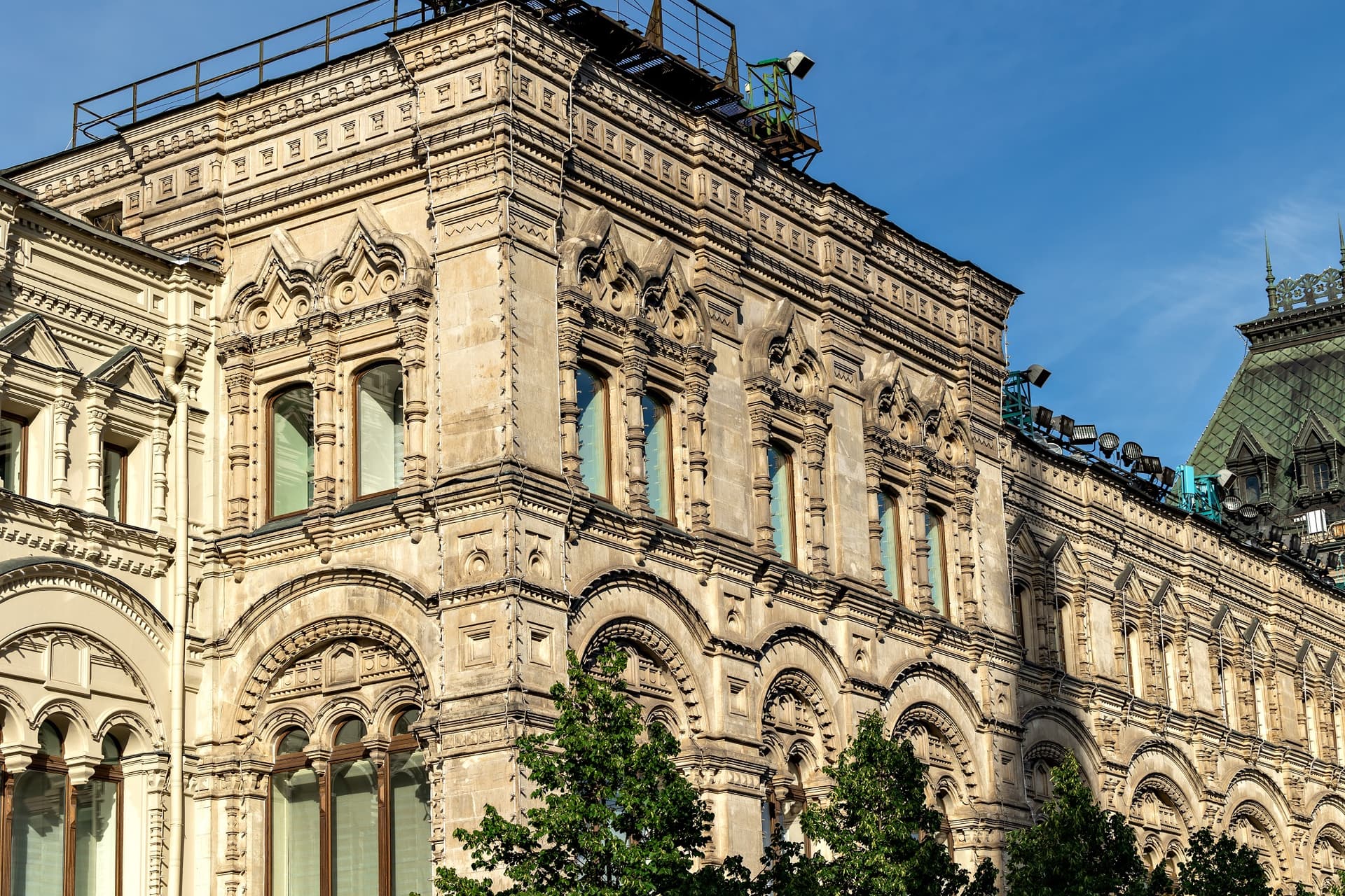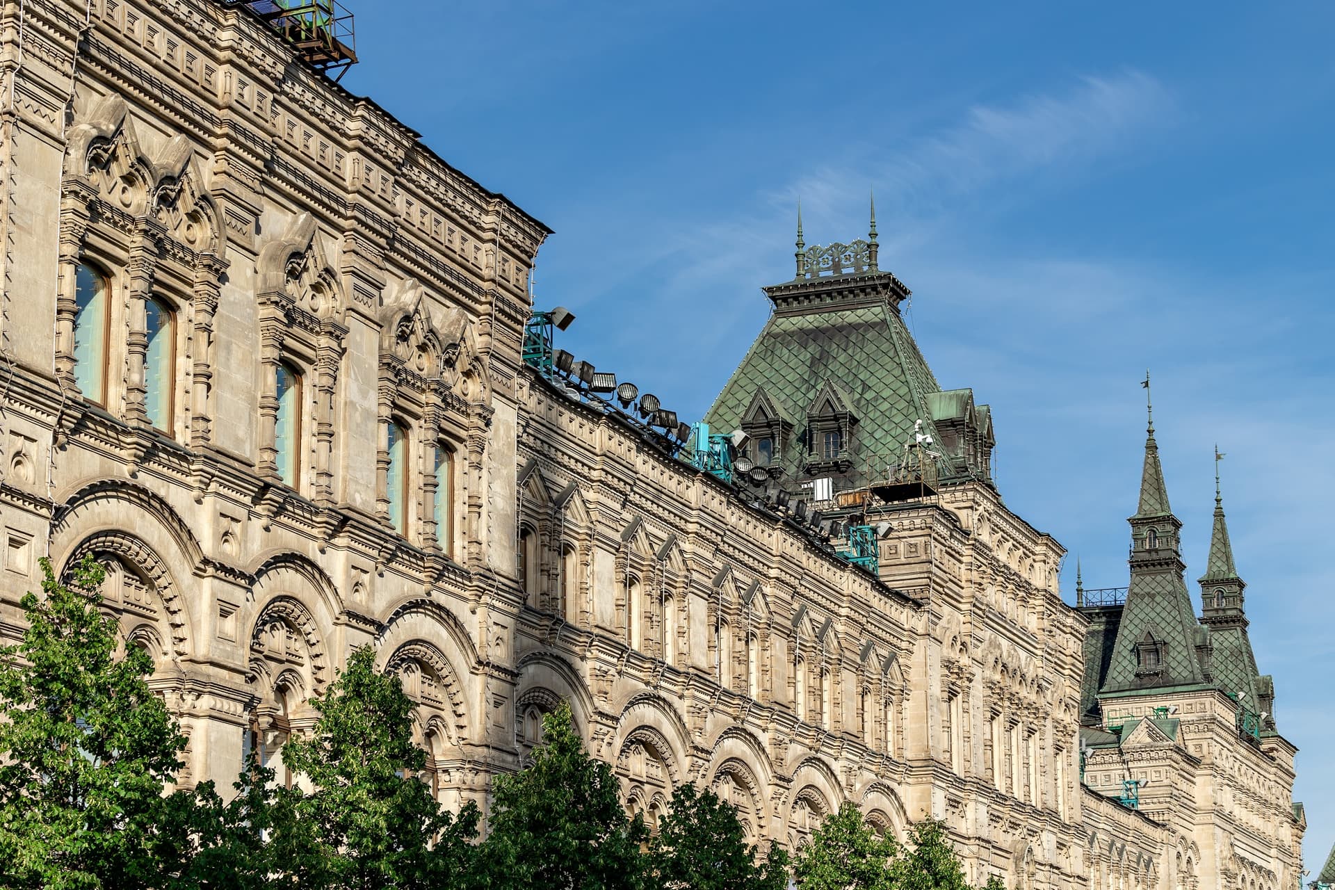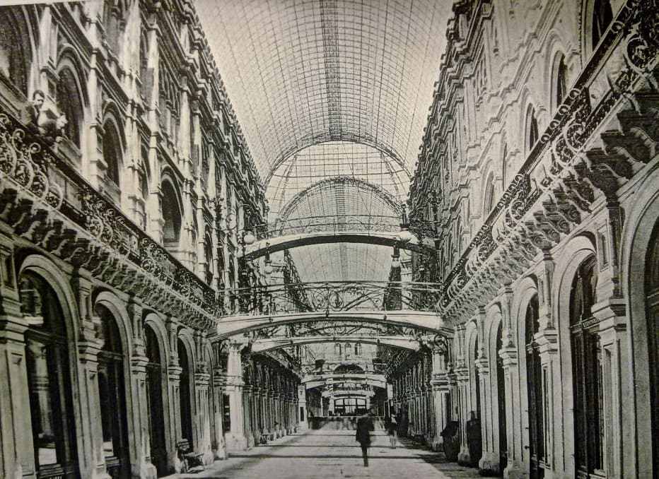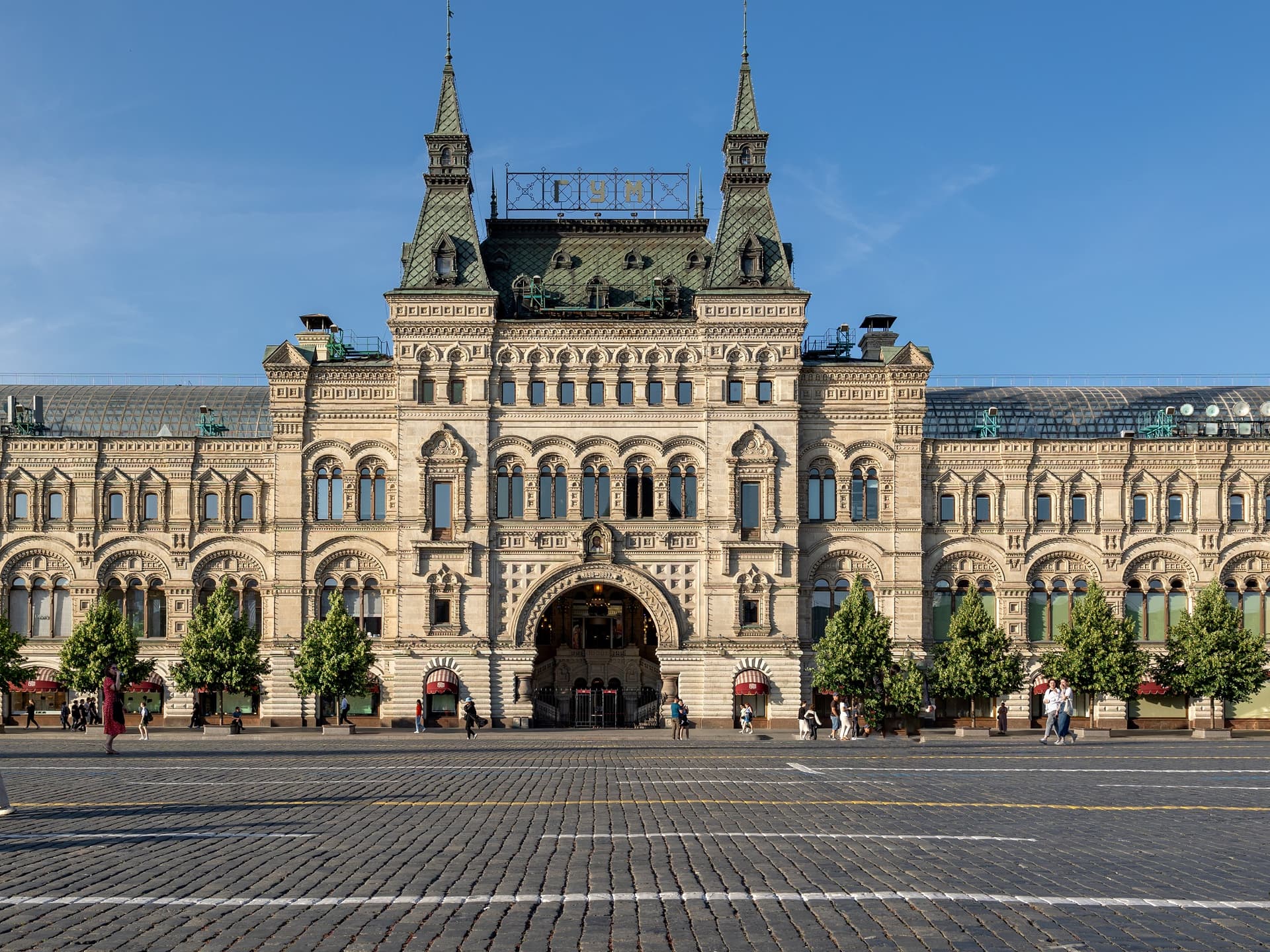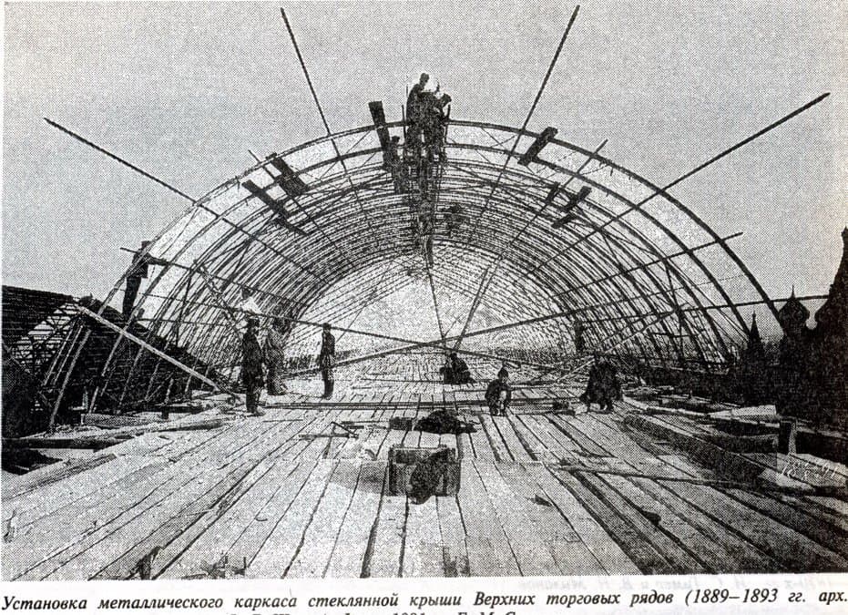 Хотя зодчий отошел от классицистического стиля в пользу псевдорусского, структура комплекса осталась прежней: линии, проходы и широкие окна витрин. Вытянутые «теремковые» крыши и шатры со шпилями над главным входом гармонируют с башнями Кремля. Благодаря инженерам В.Г. Шухову и А.Ф. Лолейту пассажи («ряды») получили крыши с остеклением. В здании была своя электростанция, освещавшая и ряды, и Красную площадь, водопровод и артезианская скважина. Всего здесь было 1200 магазинов и три зала собраний. В 1897 г. в одном из них был создан кинотеатр.