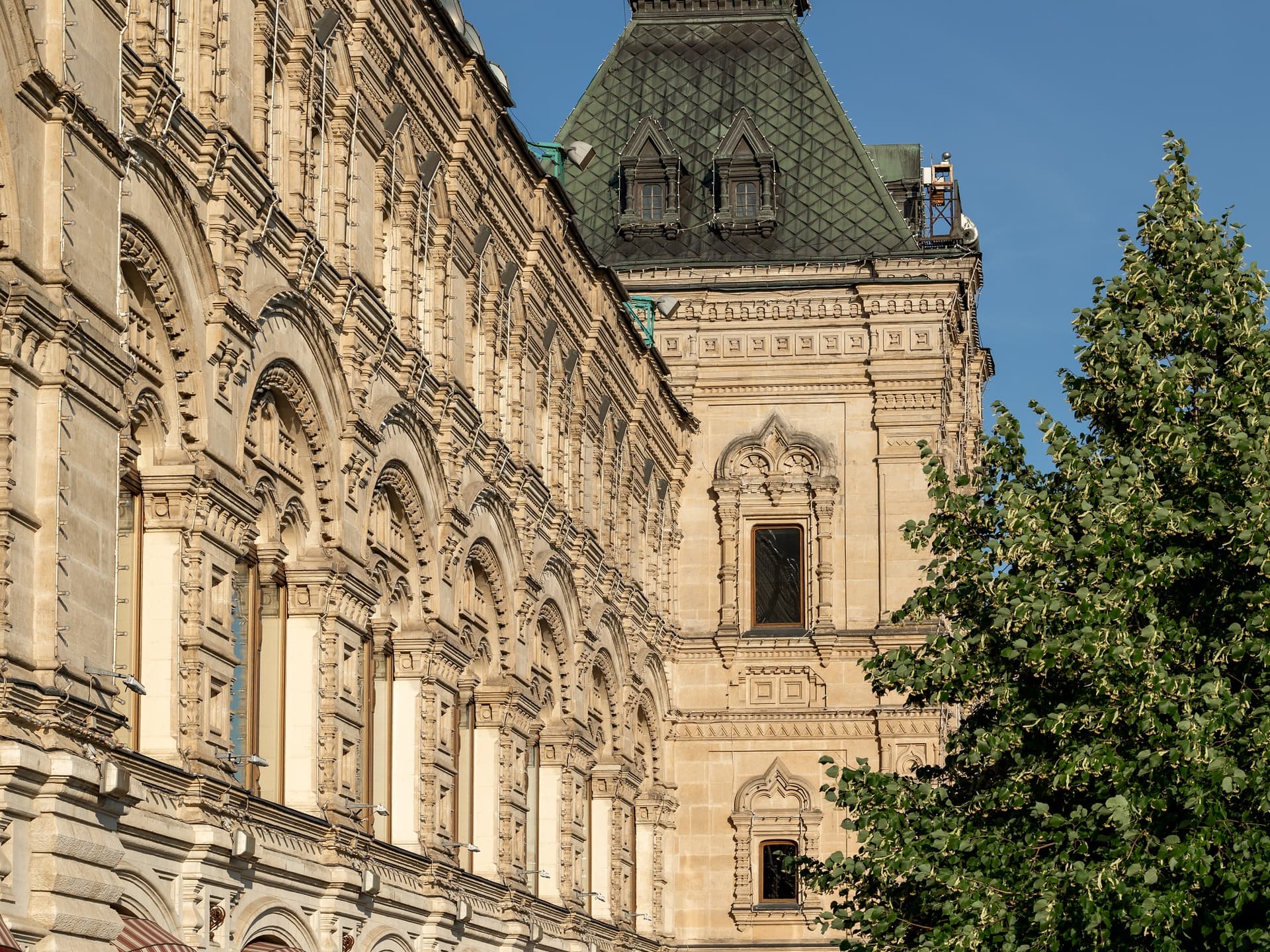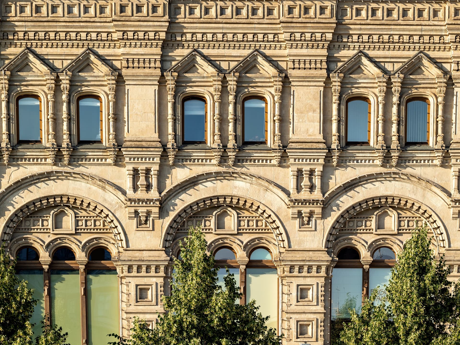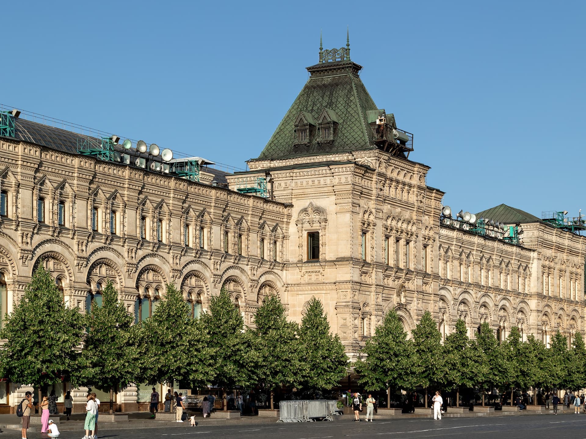 Хотя зодчий отошел от классицистического стиля в пользу псевдорусского, структура комплекса осталась прежней: линии, проходы и широкие окна витрин. Вытянутые «теремковые» крыши и шатры со шпилями над главным входом гармонируют с башнями Кремля. Благодаря инженерам В.Г. Шухову и А.Ф. Лолейту пассажи («ряды») получили крыши с остеклением. В здании была своя электростанция, освещавшая и ряды, и Красную площадь, водопровод и артезианская скважина. Всего здесь было 1200 магазинов и три зала собраний. В 1897 г. в одном из них был создан кинотеатр.